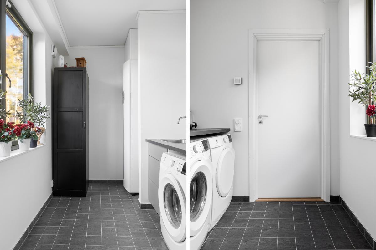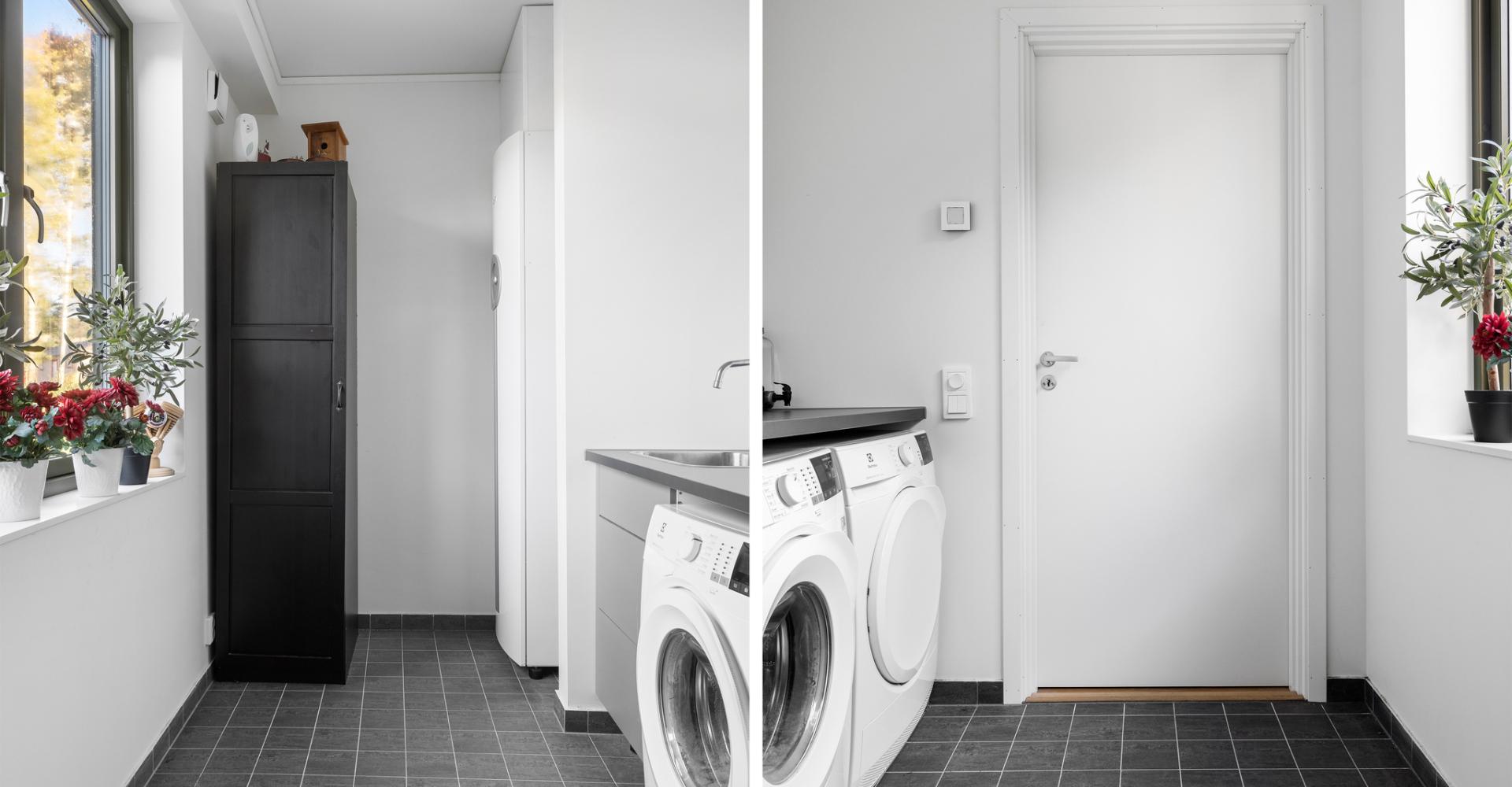 Tvättstuga med klinkergolv, målade väggar, bänkskiva ovan tvättmaskin och torktumlare integrerad tvättho, kakel ovan bänk. Garderob. Tvättstugan är utrustad med tvättmaskin, torktumlare från Electrolux och värmepump.