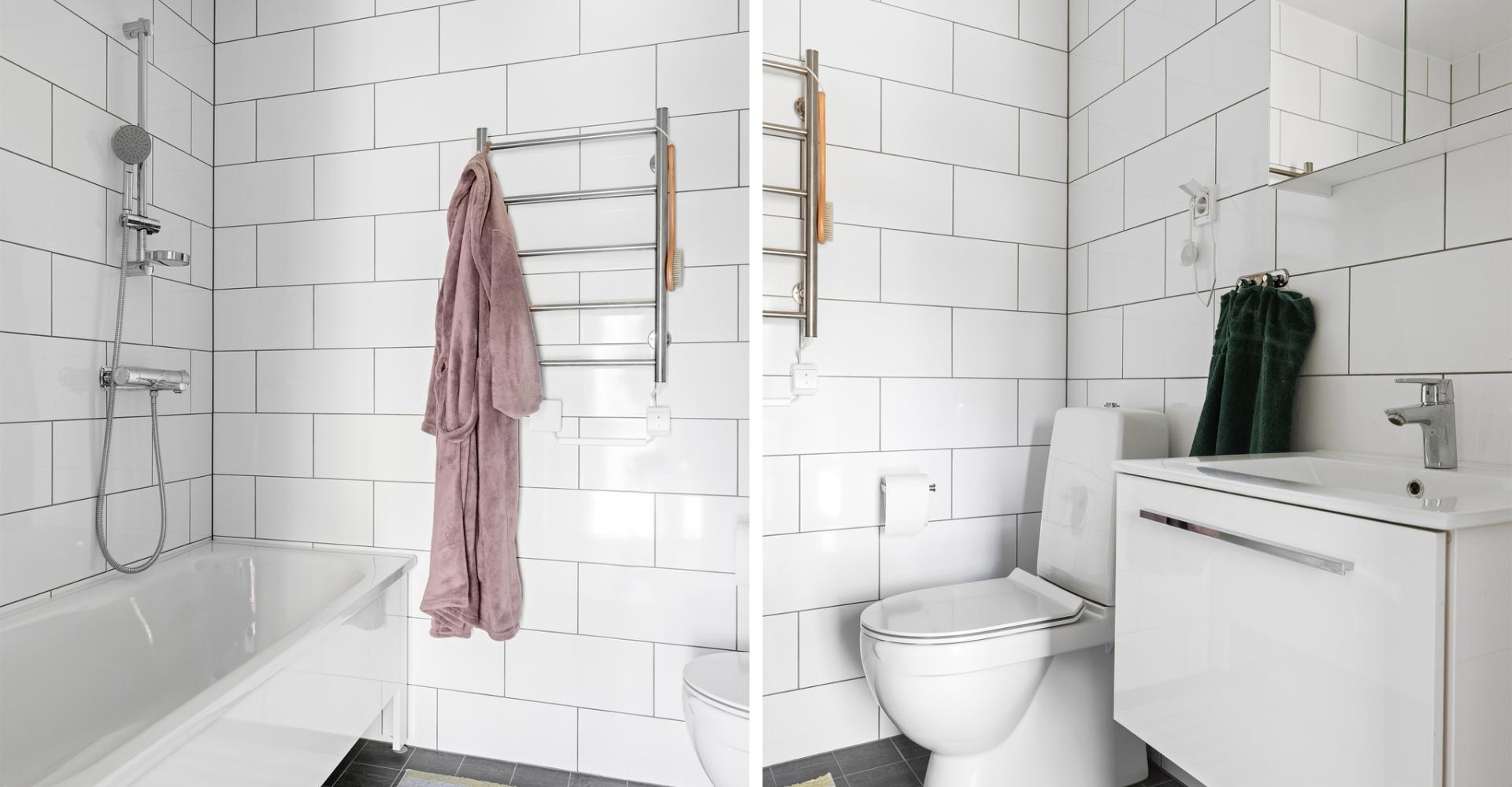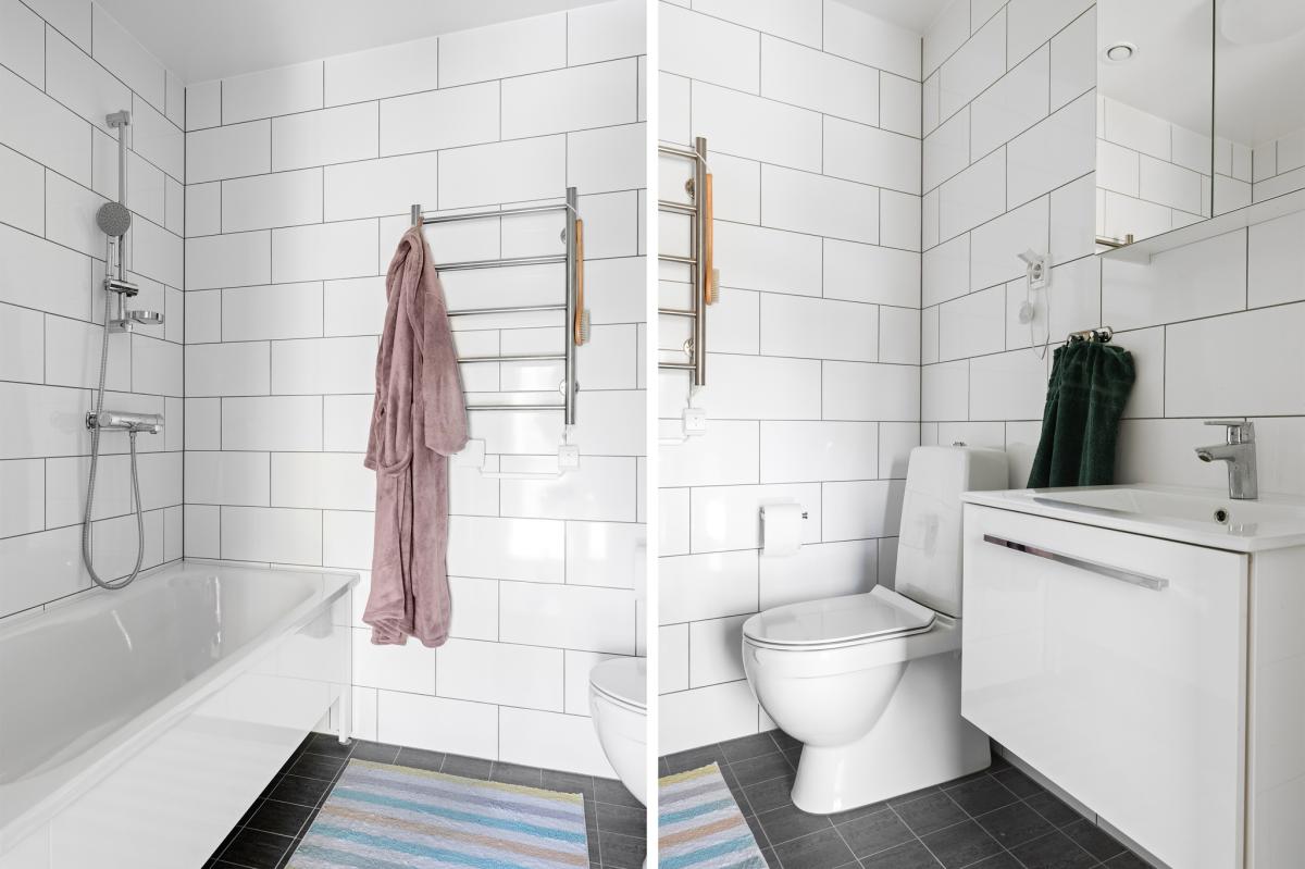 Badrum med klinkergolv samt helkaklade väggar. Badrummet är utrustat med w.c., kommod, badkar, badrumsskåp med spegel och belysning och handdukstork.