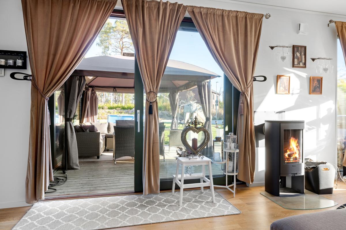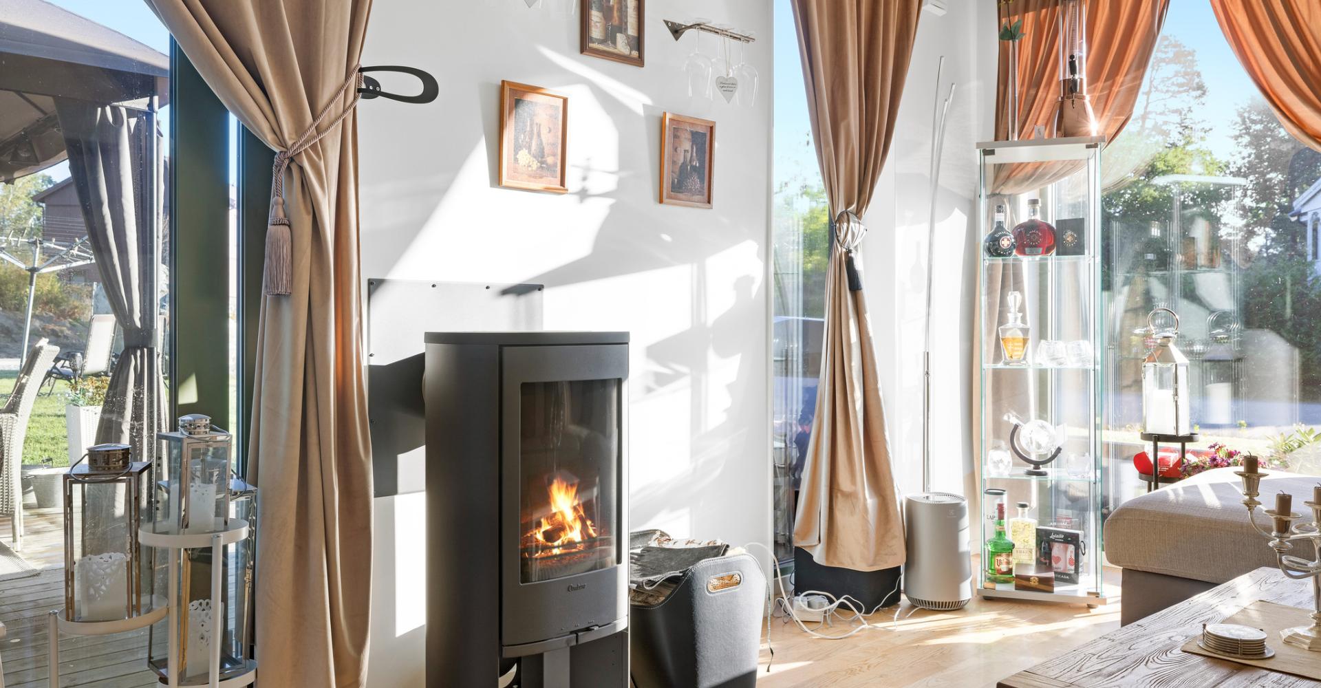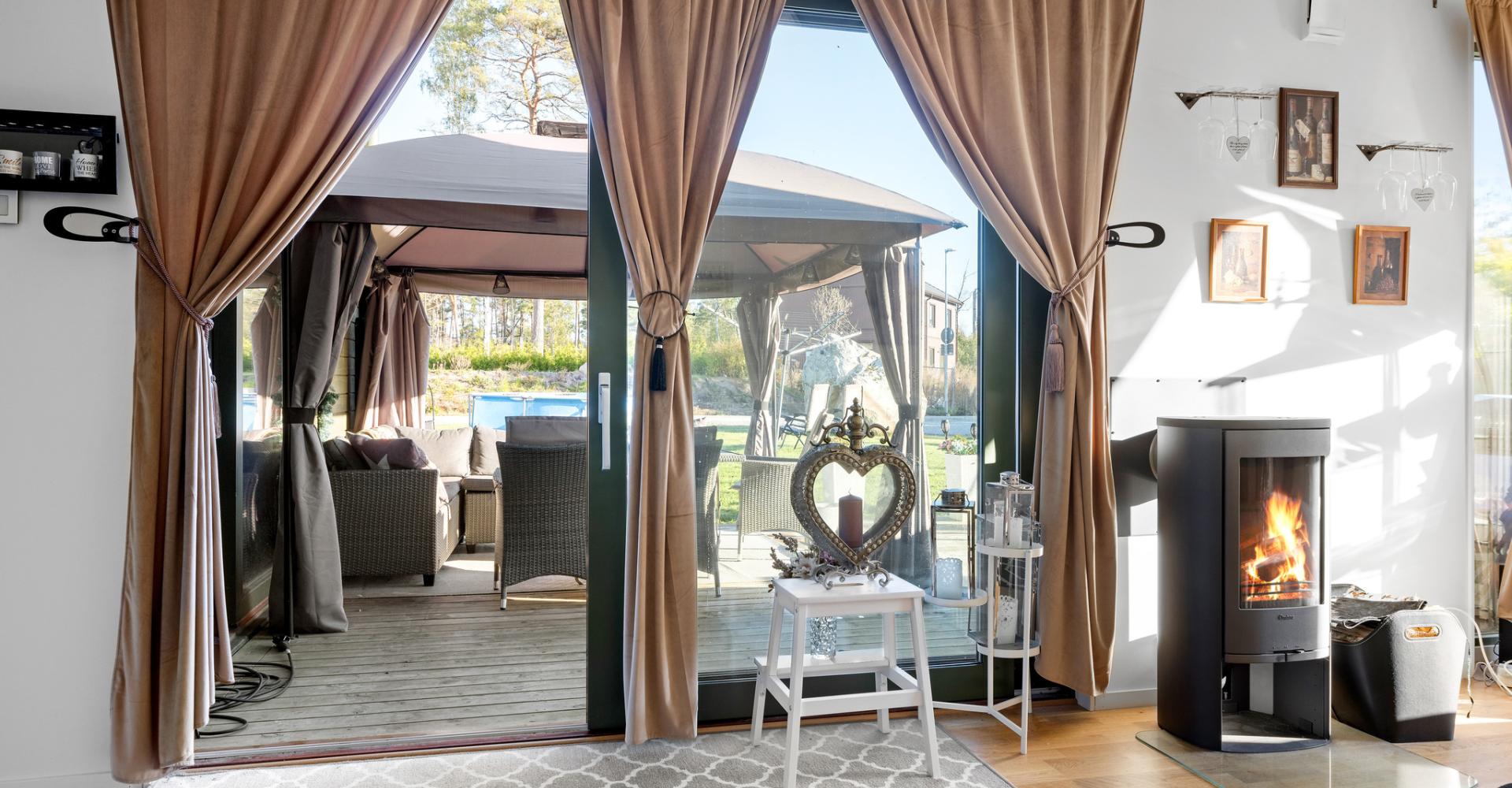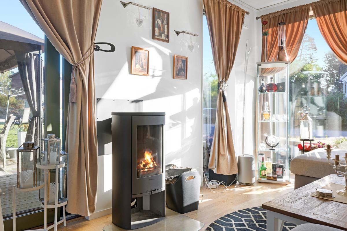 Vardagsrum med parkettgolv, målade väggar samt kamin Contura. Utgång via skjutdörrar till altan.