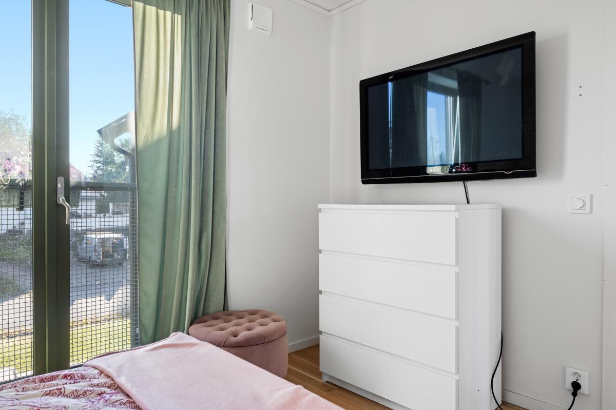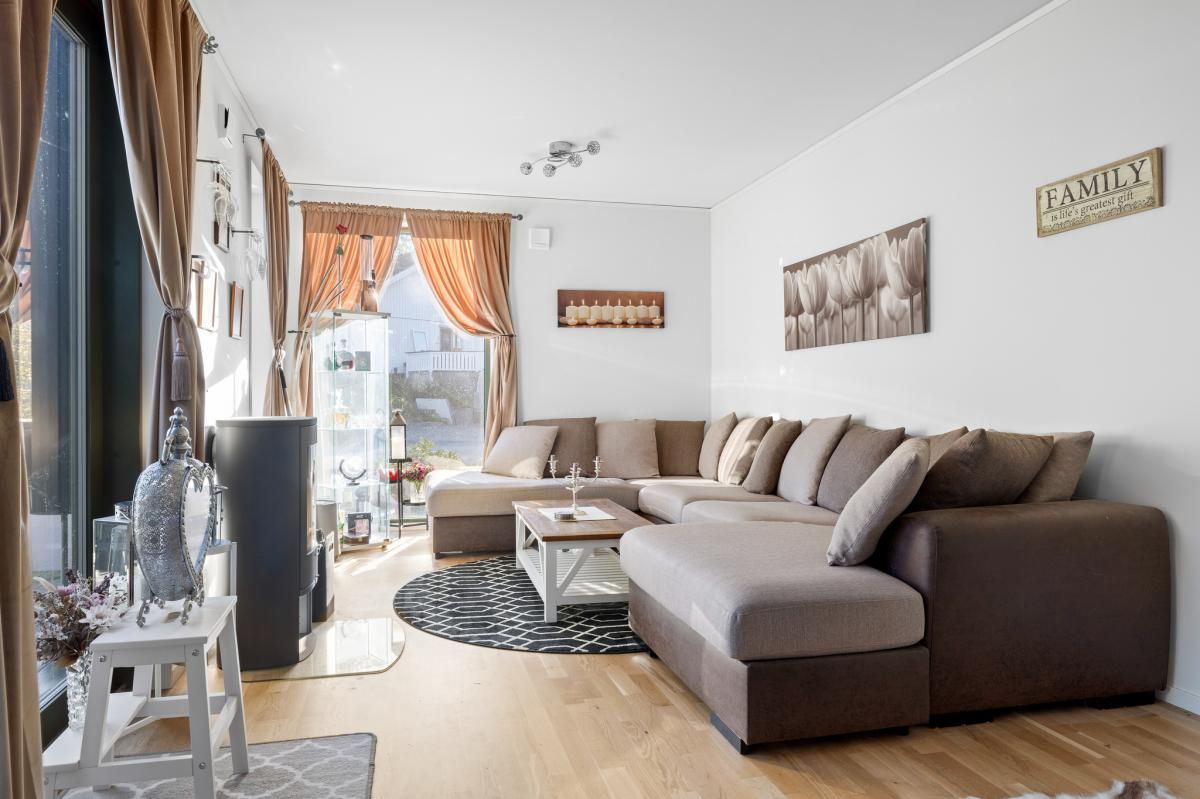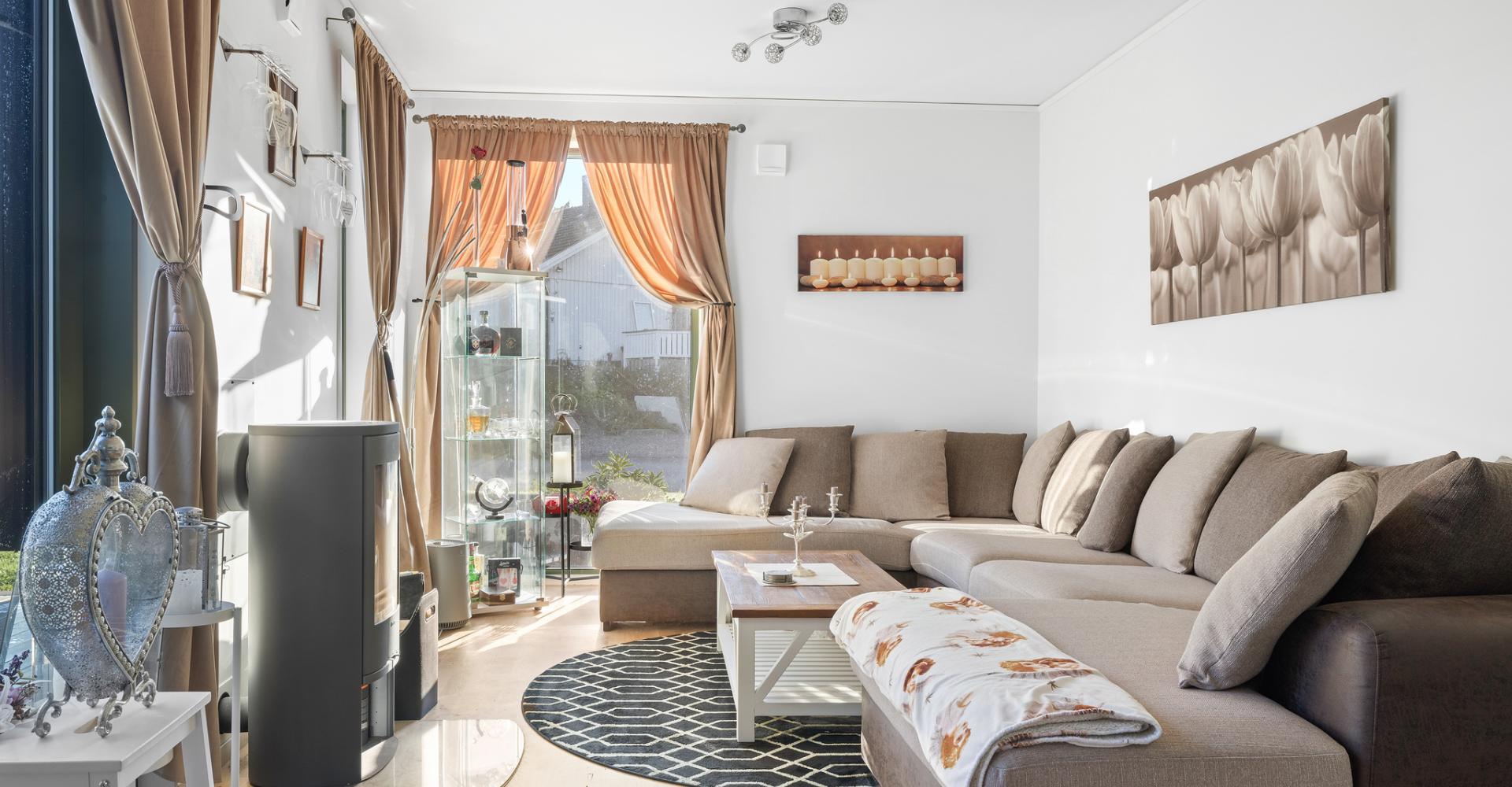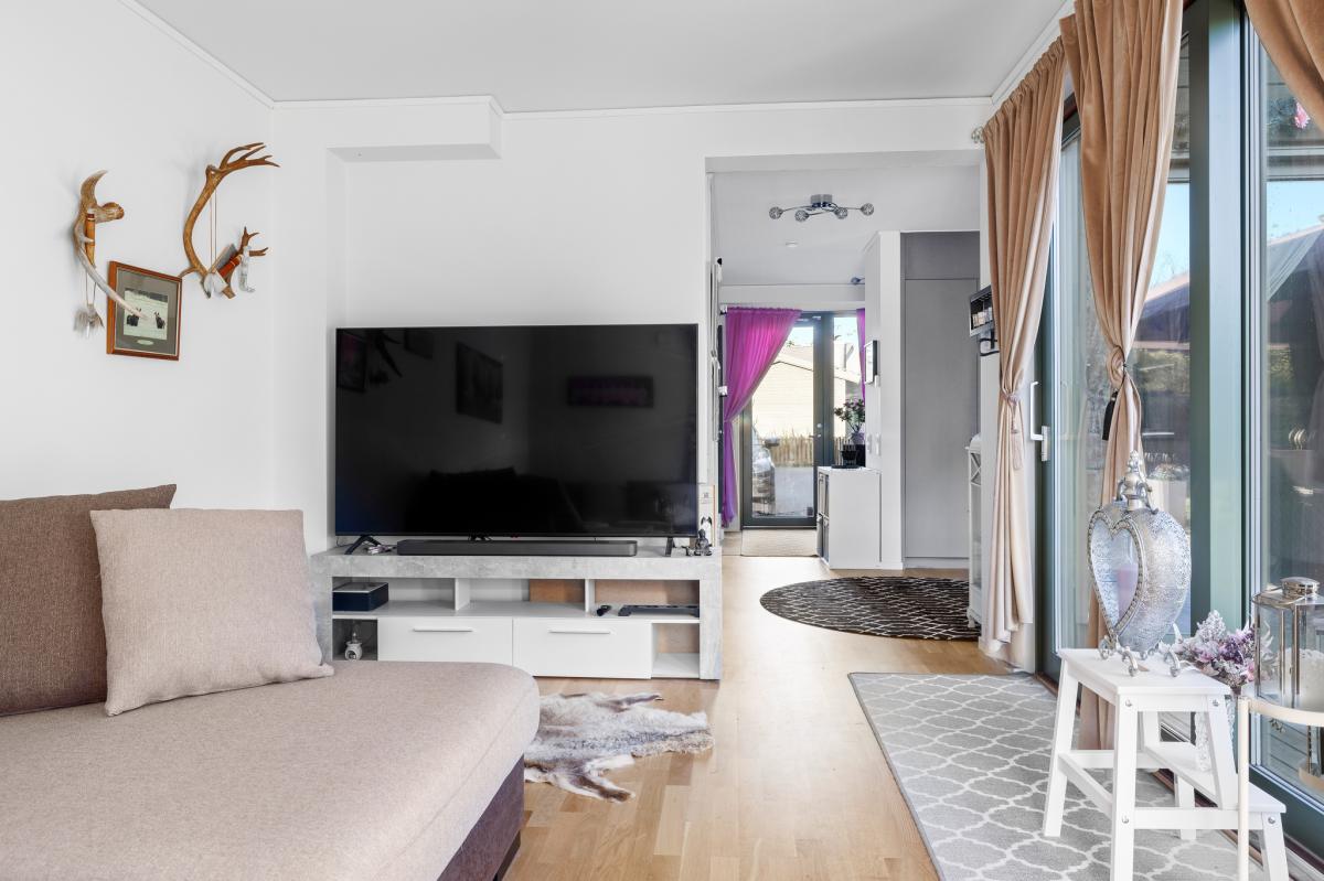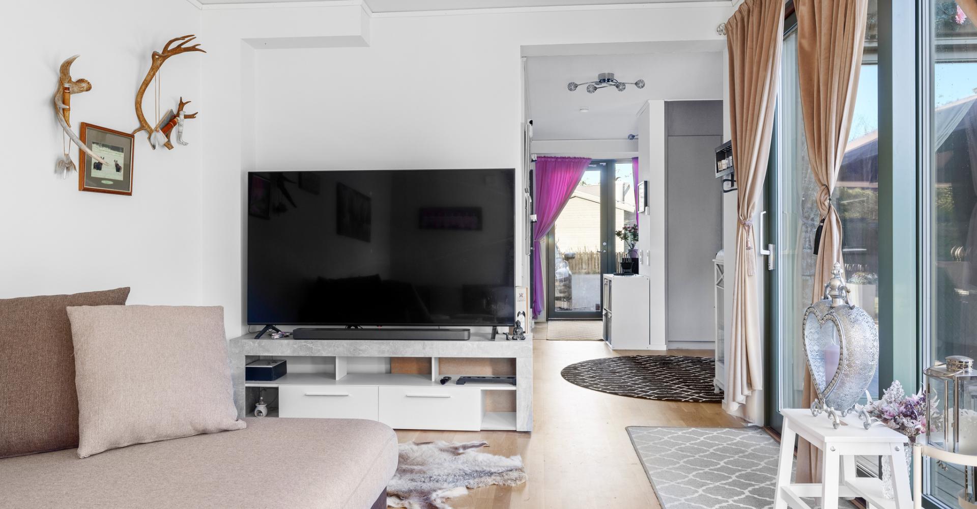 Vardagsrum med parkettgolv, målade väggar samt kamin Contura. Utgång via skjutdörrar till altan.