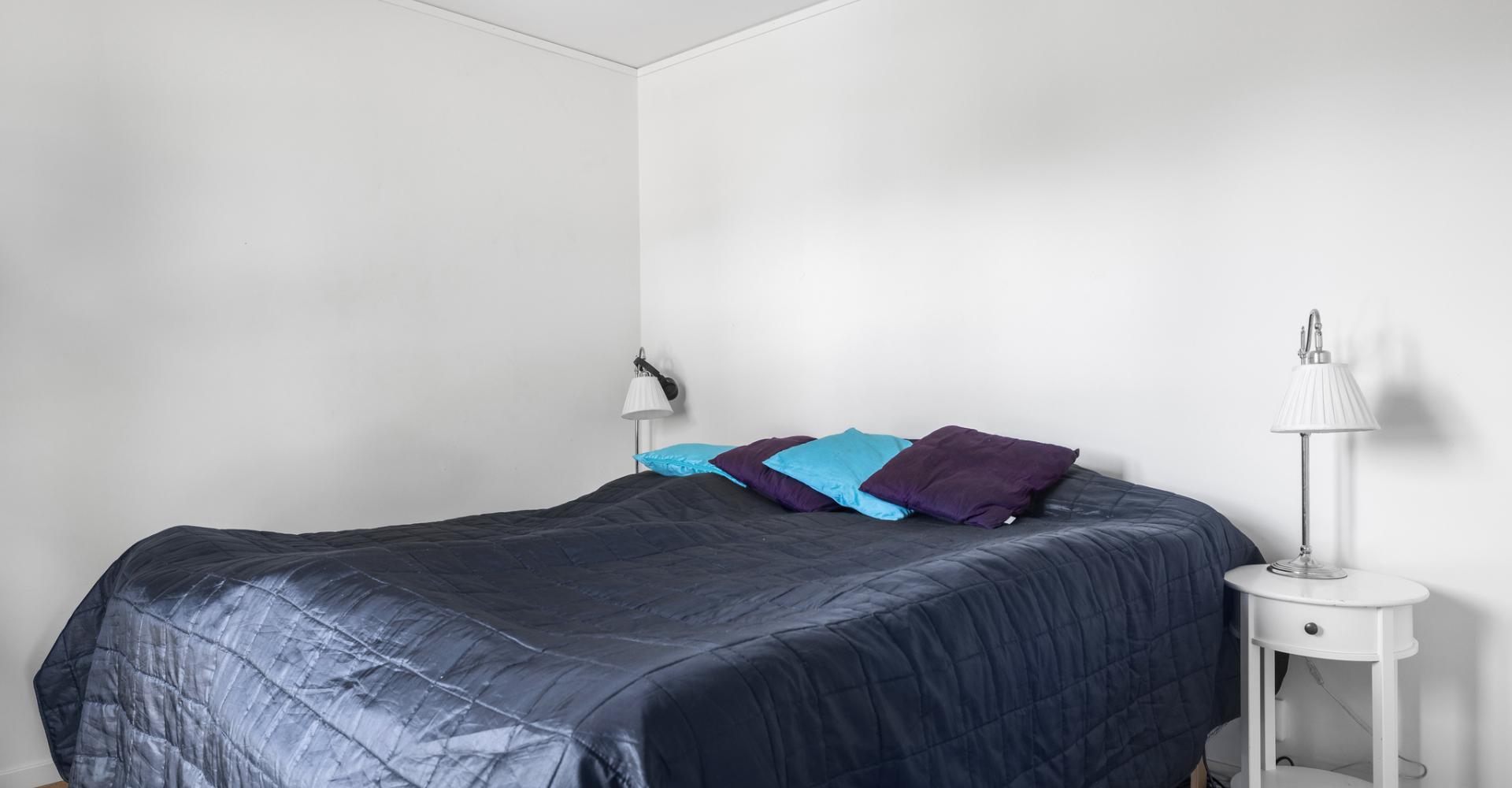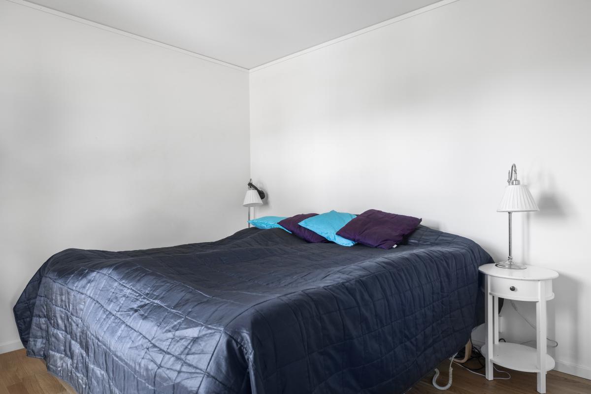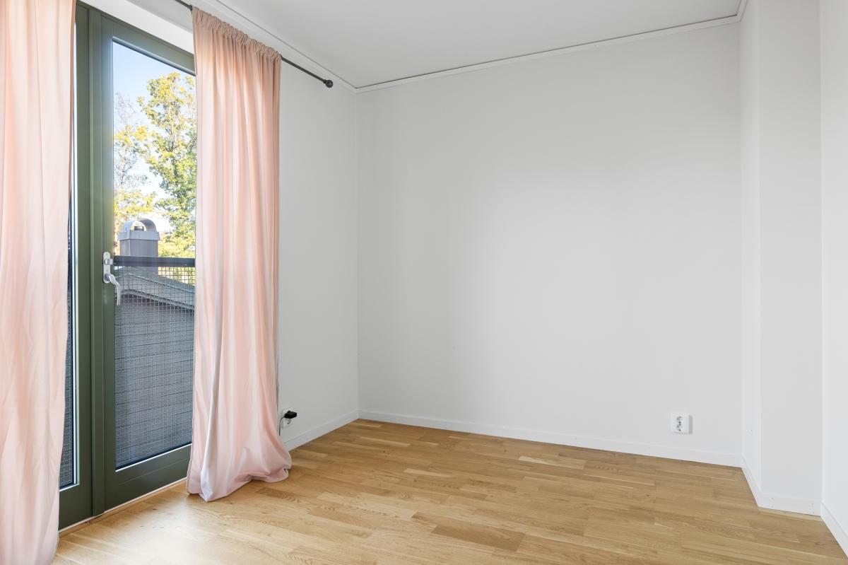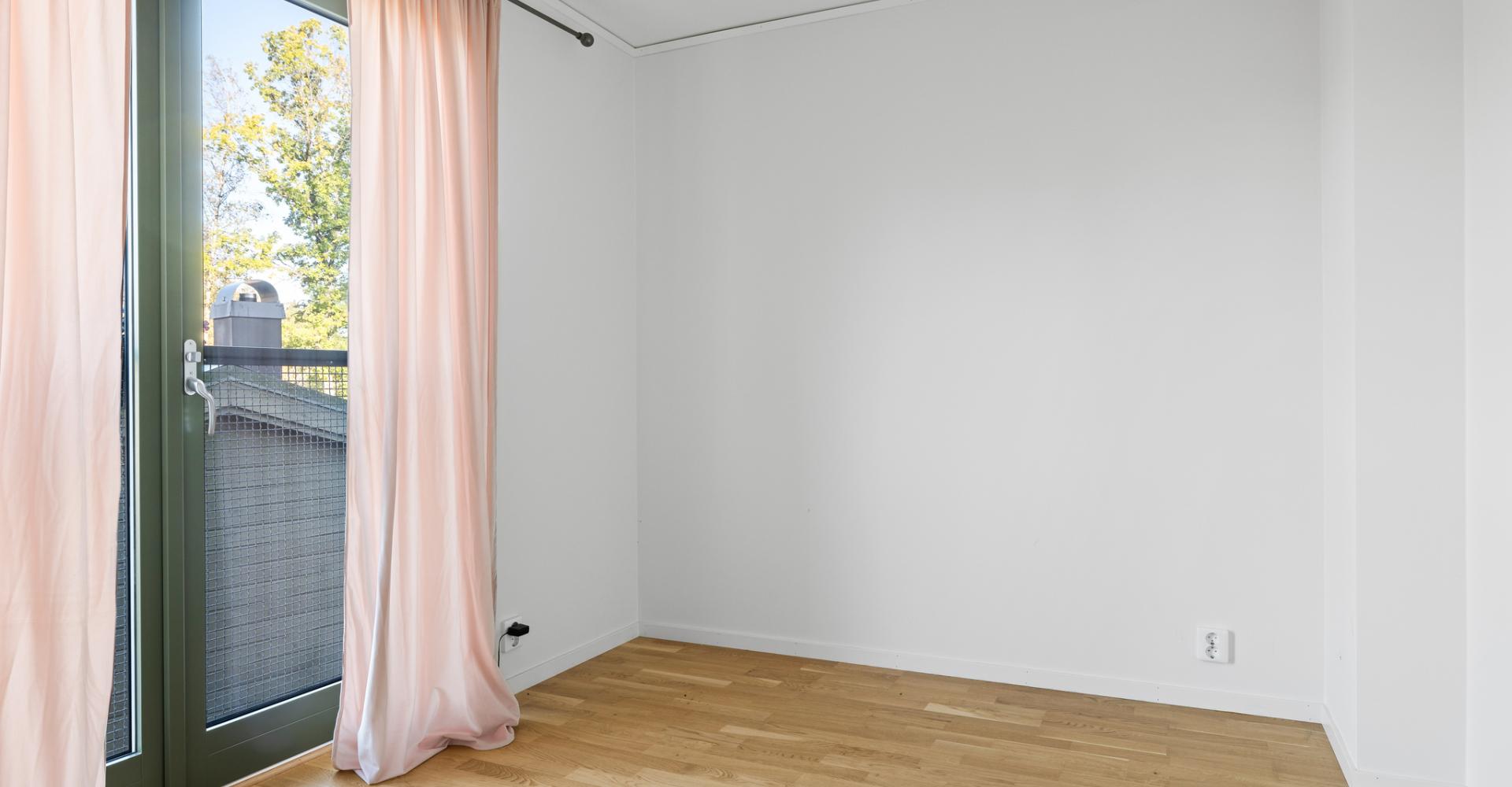 Sovrum med parkettgolv, målade väggar samt fransk balkongdörr.