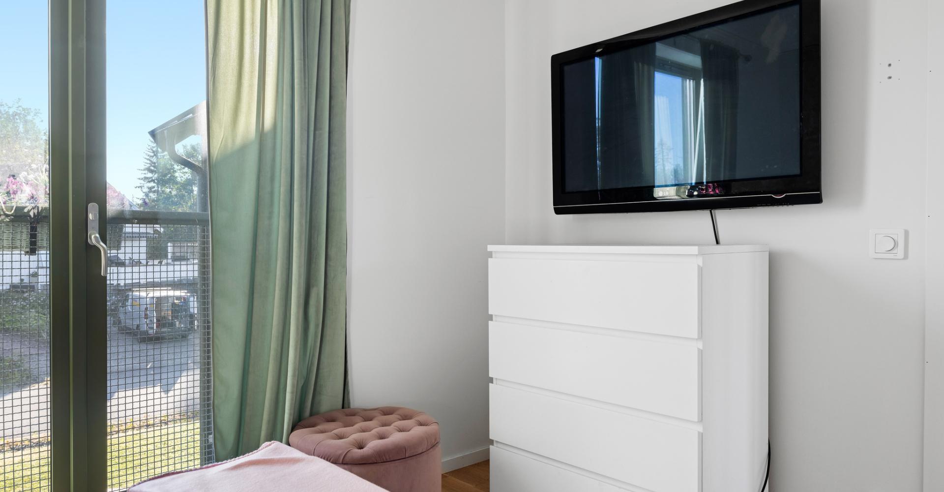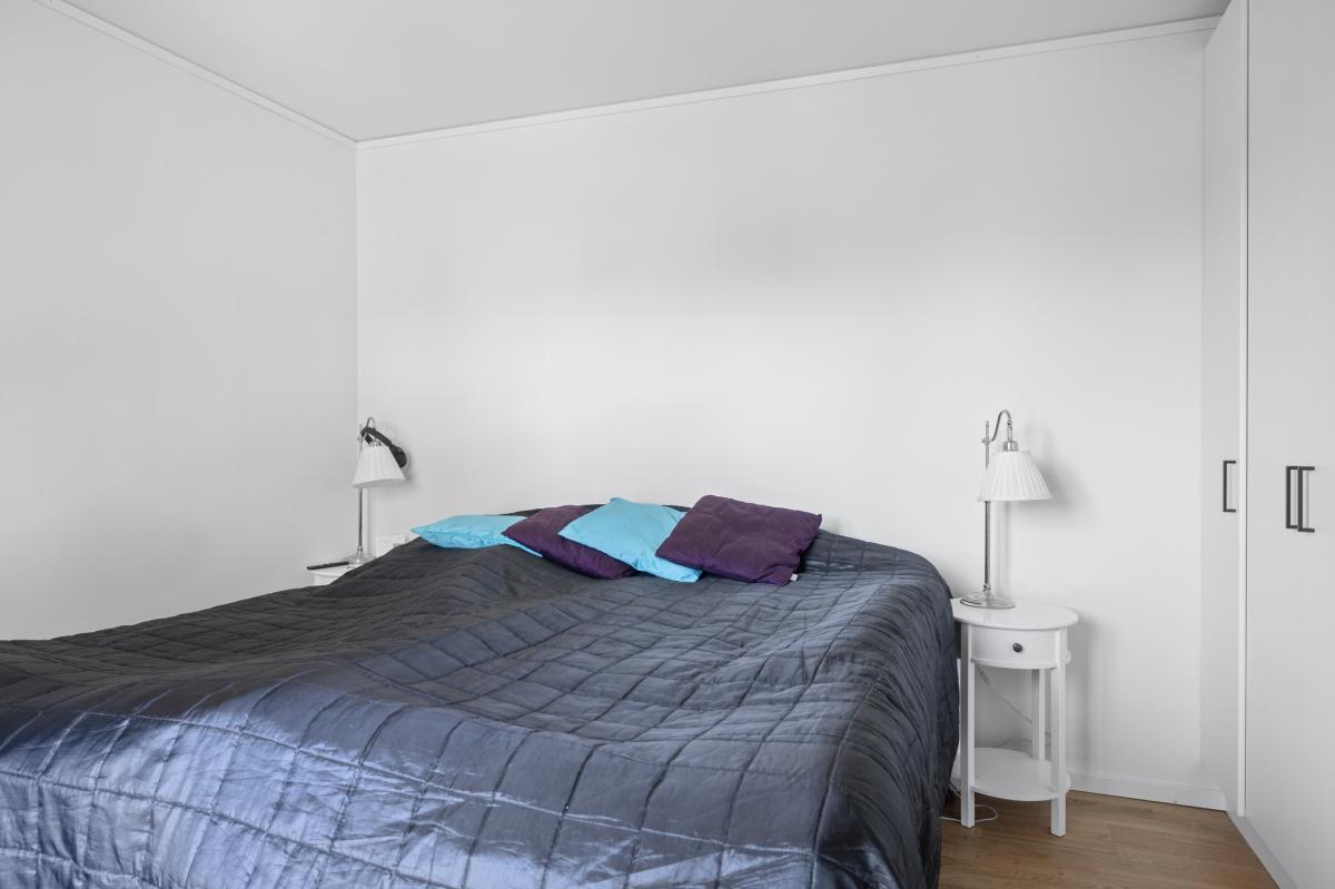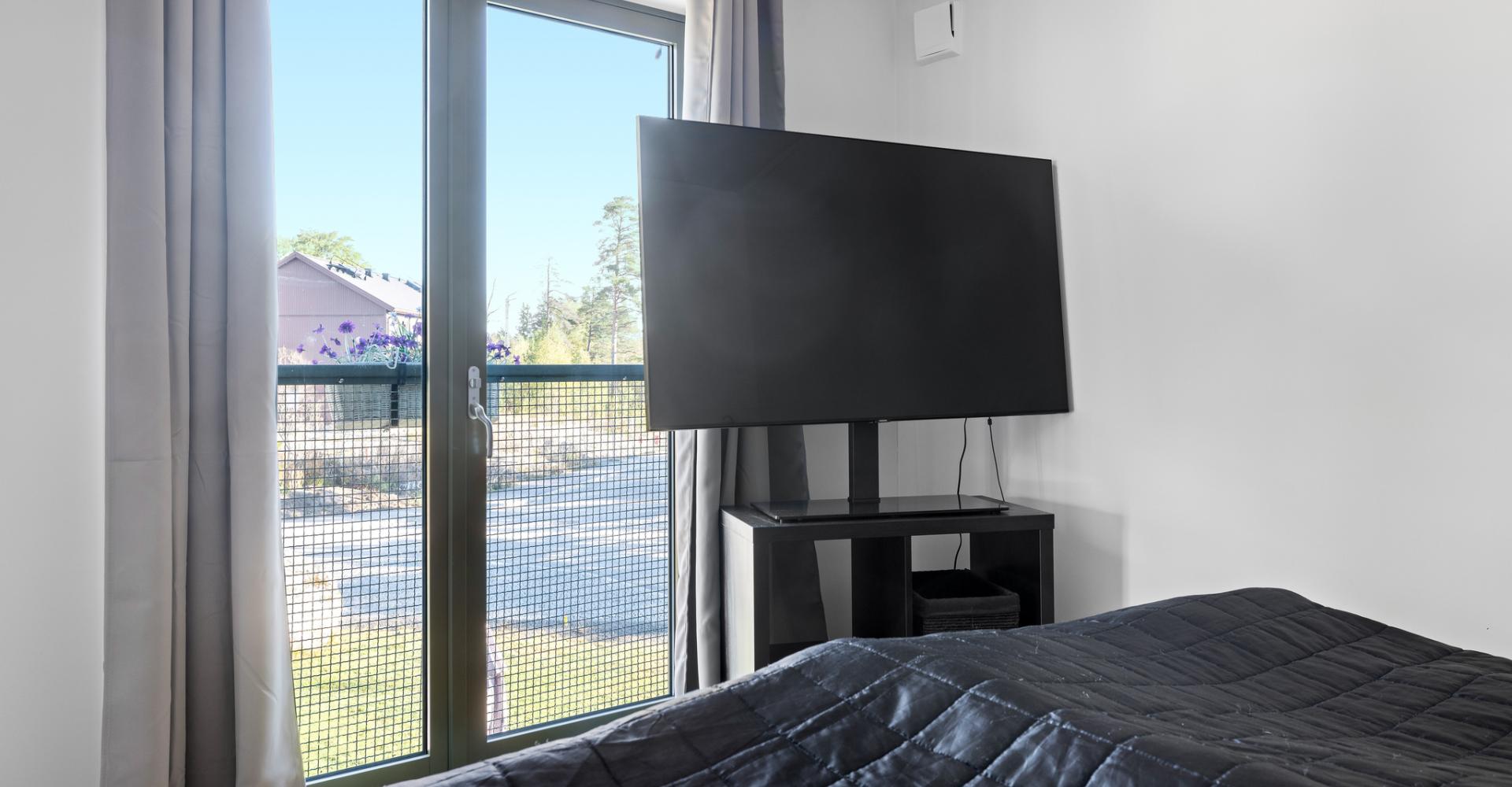 Sovrum med parkettgolv, målade väggar samt fransk balkongdörr.