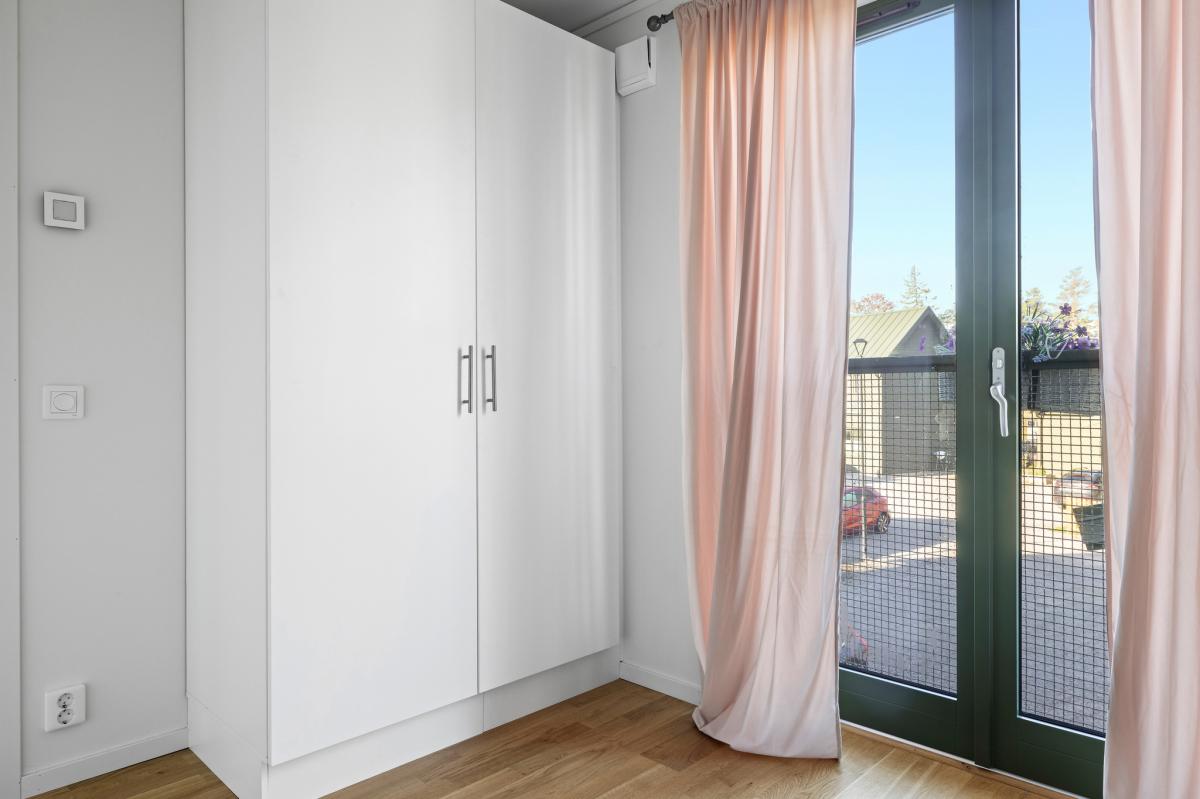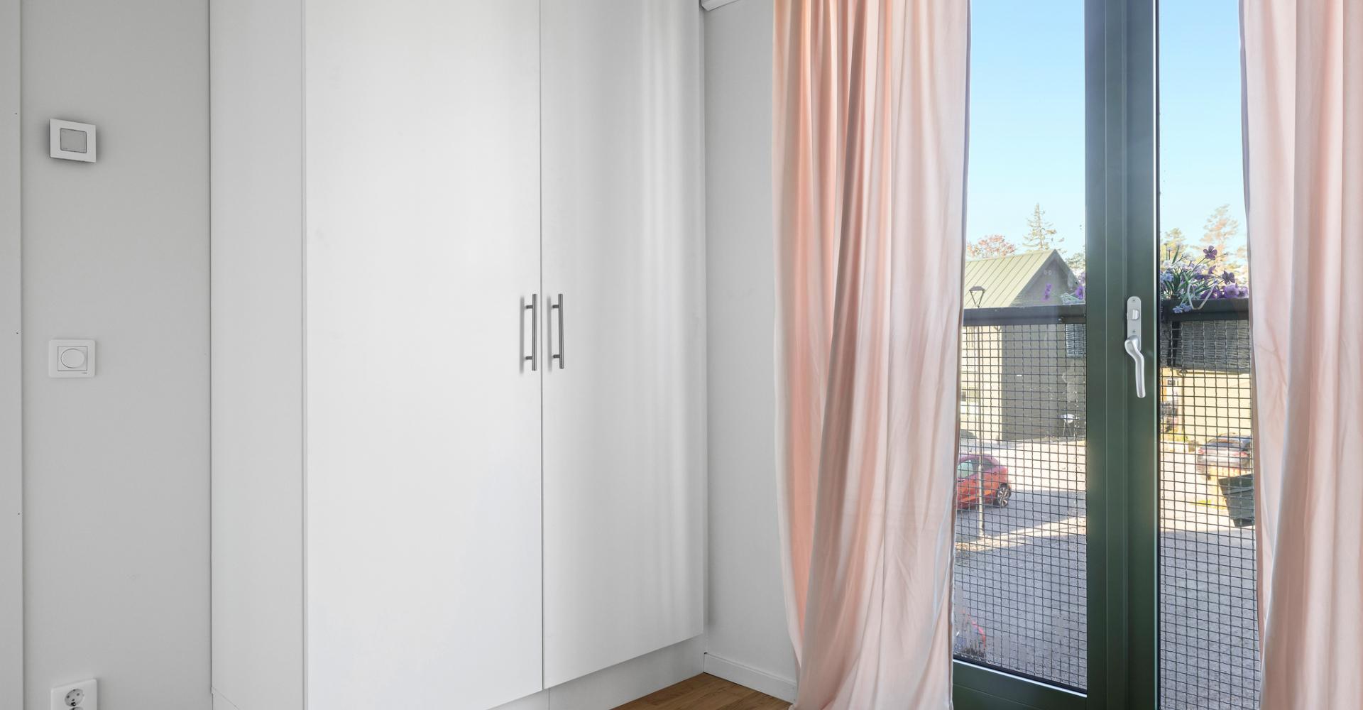 Sovrum med parkettgolv, målade väggar, 2 garderober samt fransk balkongdörr.