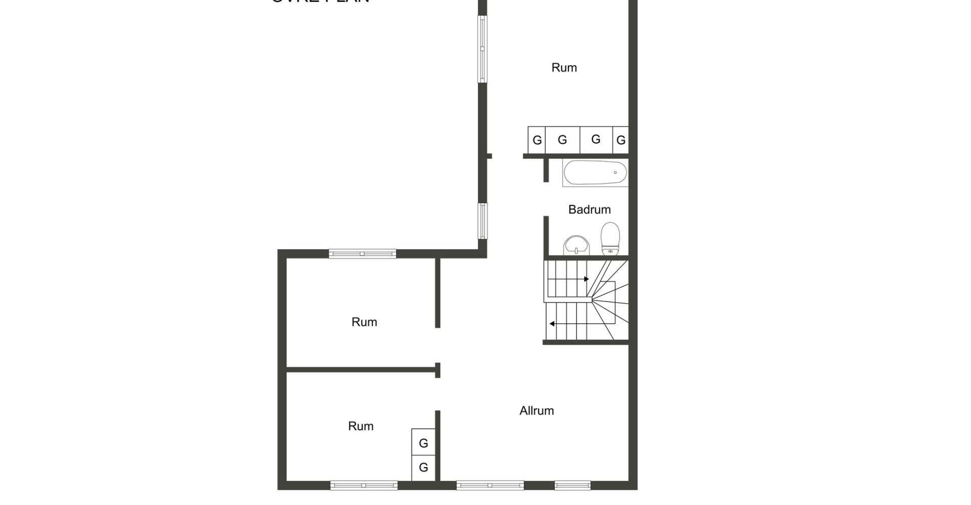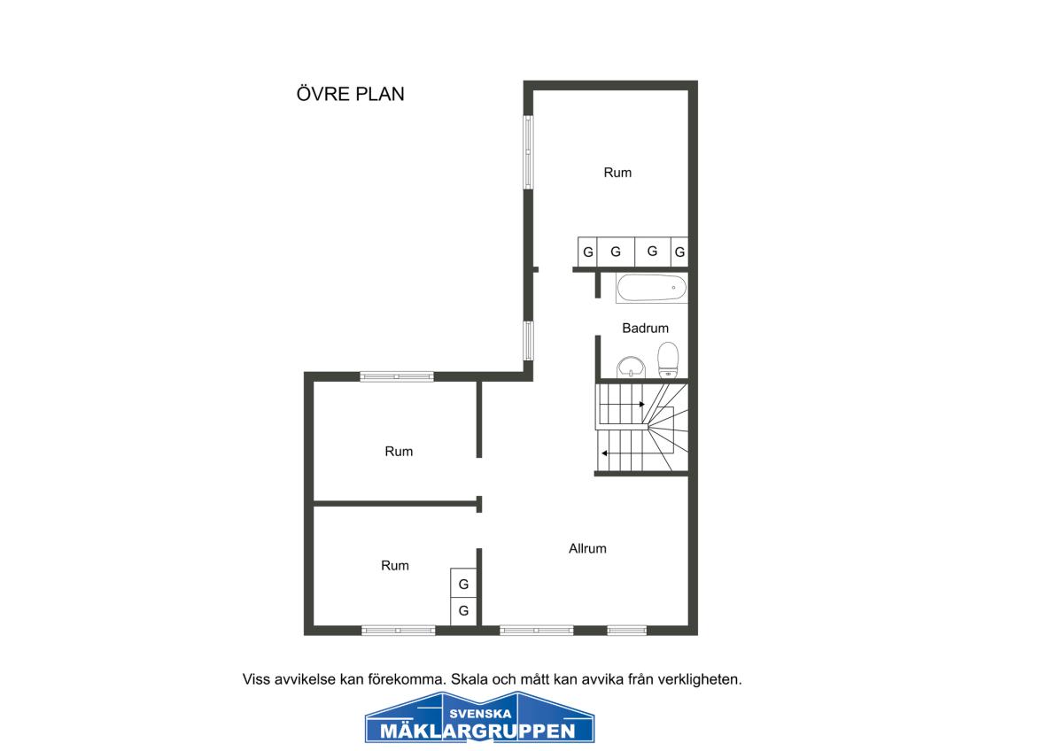 På övre plan finns det tre sovrum, fyra möjliga. Alla sovrum har fransk balkongdörr. I hela huset ligger ekparkett och väggarna är målade i vit ton. På övre plan finns också ett badrum som är helkaklat med klinkergolv, här finns badkar, handukstork. Stort allrum också det med fransk balkongdörr.