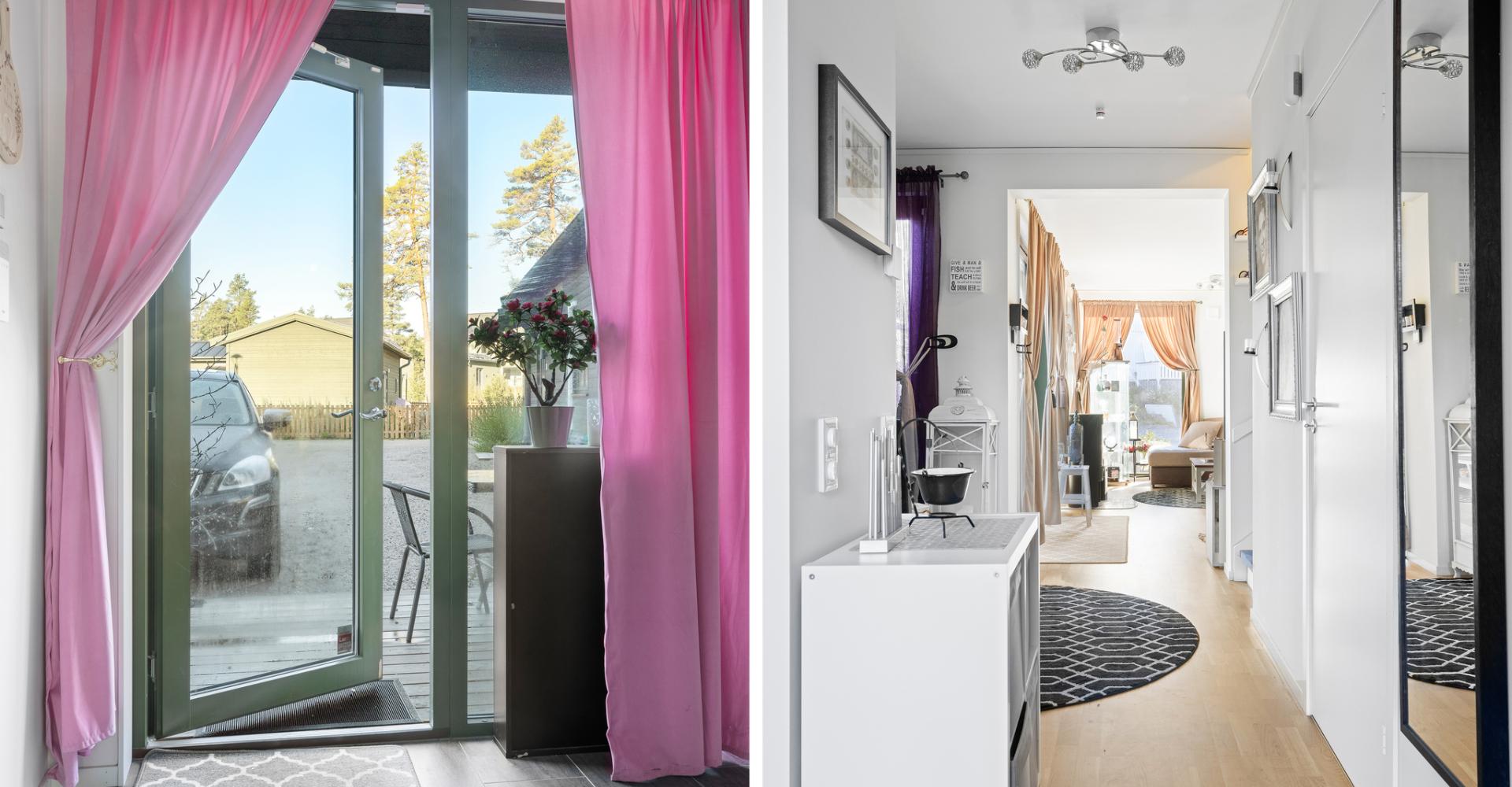 Hall med klinkergolv, målade väggar, 3 garderober. Skohylla.