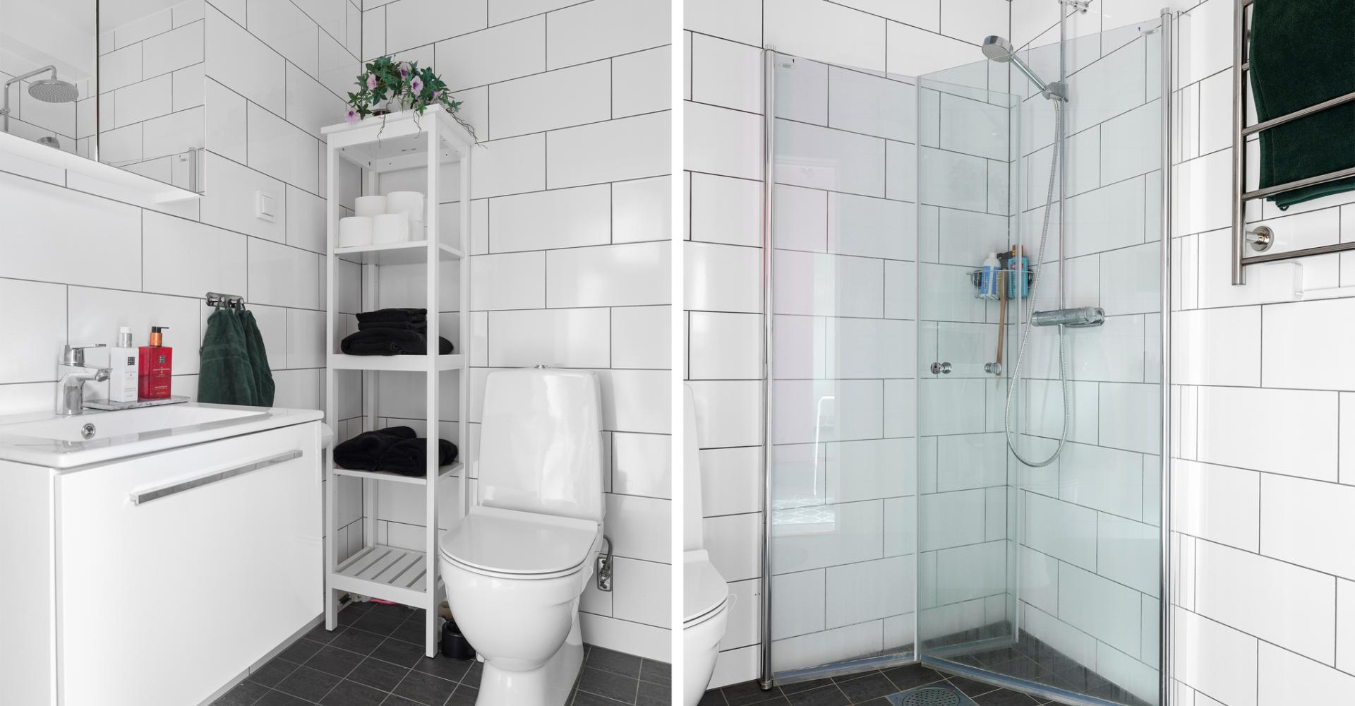 Badrum med klinkergolv samt helkaklade väggar. Badrummet är utrustat med w.c., kommod samt dusch med vikbara duschväggar, handdukstork och badrumsskåp med spegel och belysning.