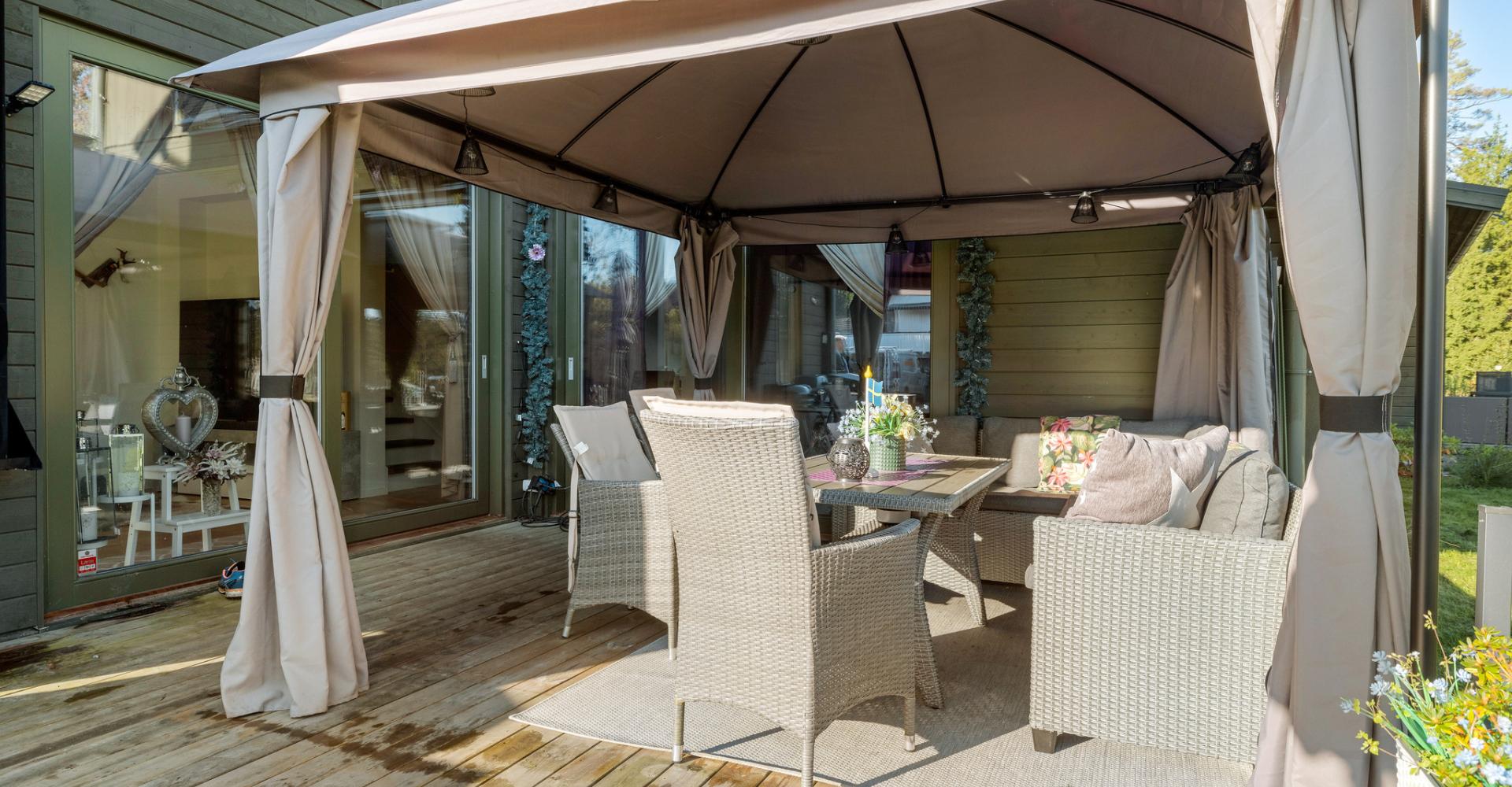 - UteplatsStor uteplats med utgång från vardagsrum och kök. Uteplatsen är trädäckad och har insynsskydd. Utemöbler ingår, så även grill.