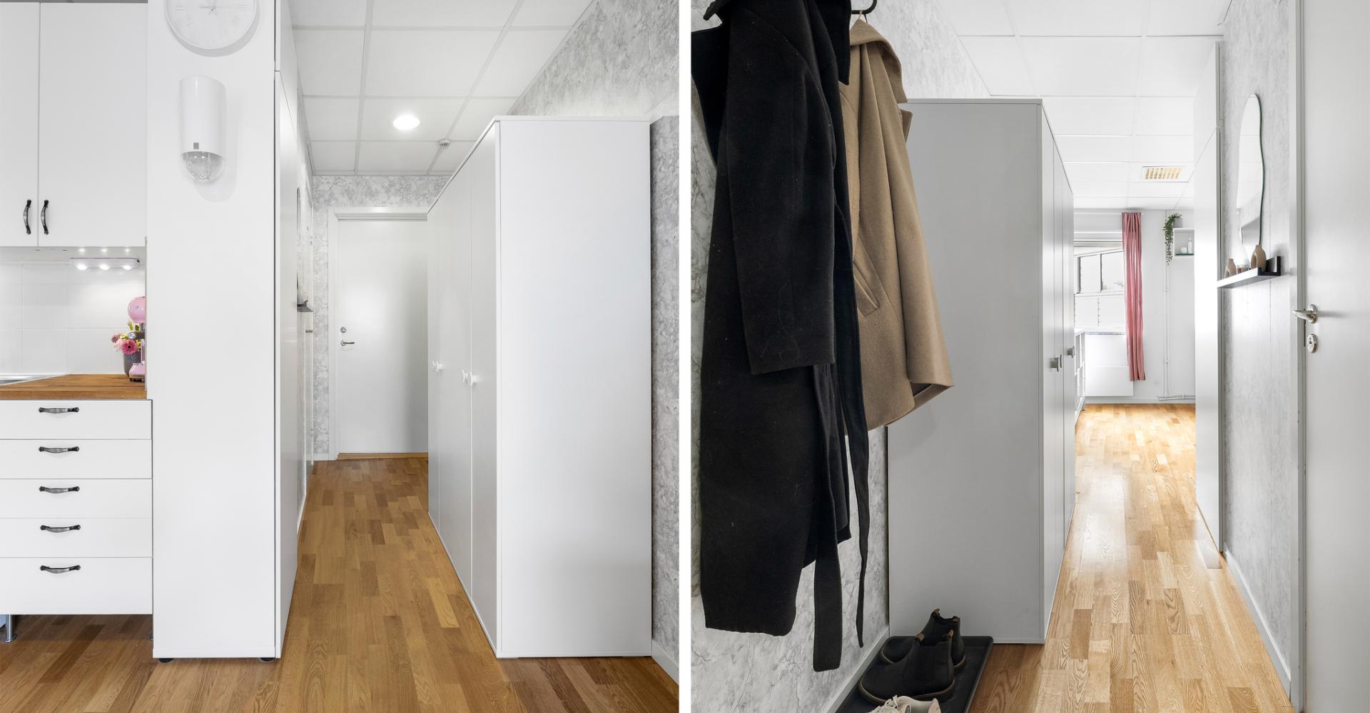 Hall med parkettgolv samt två dubbelgarderober