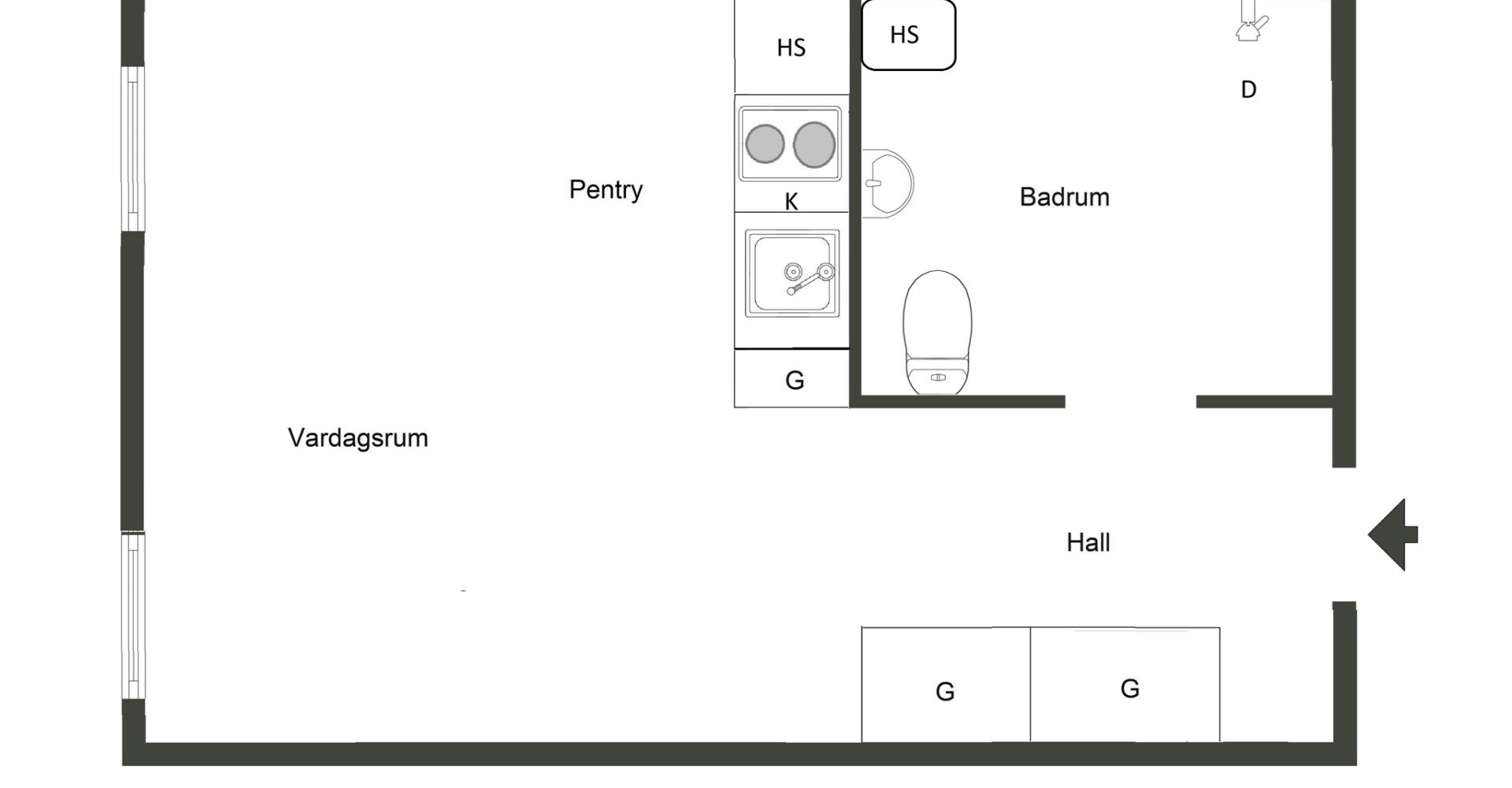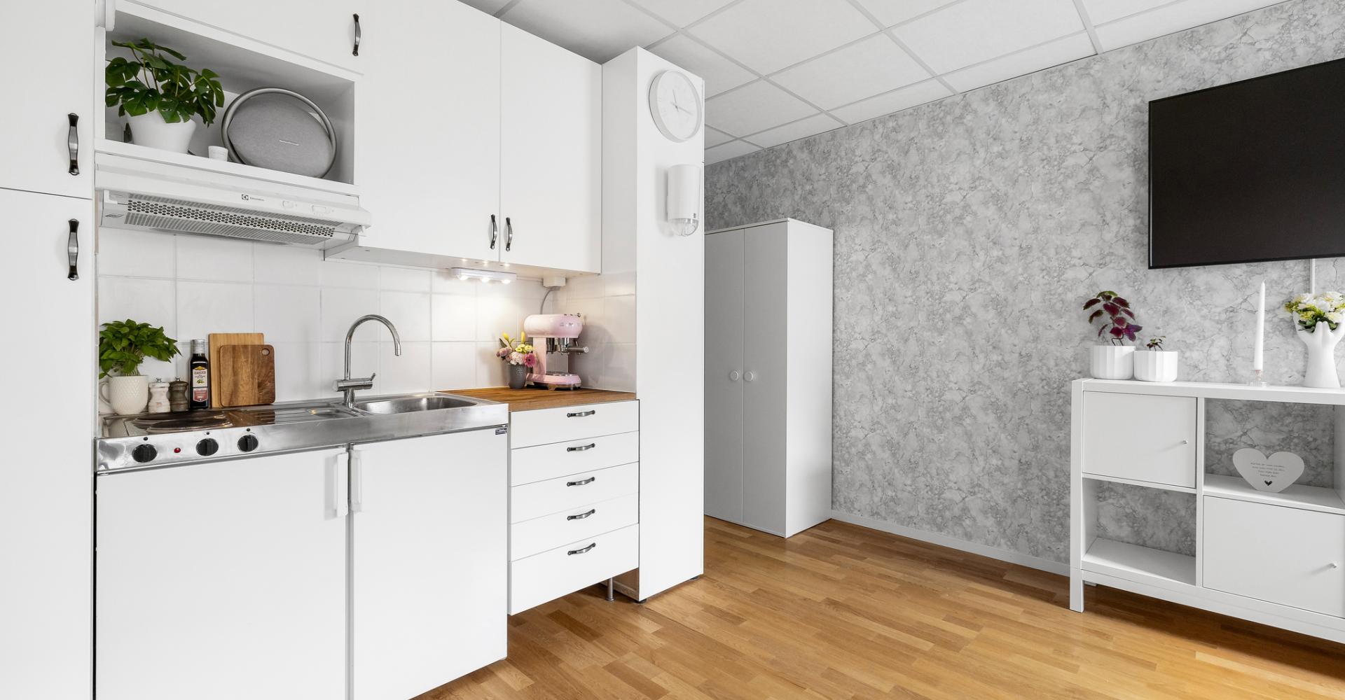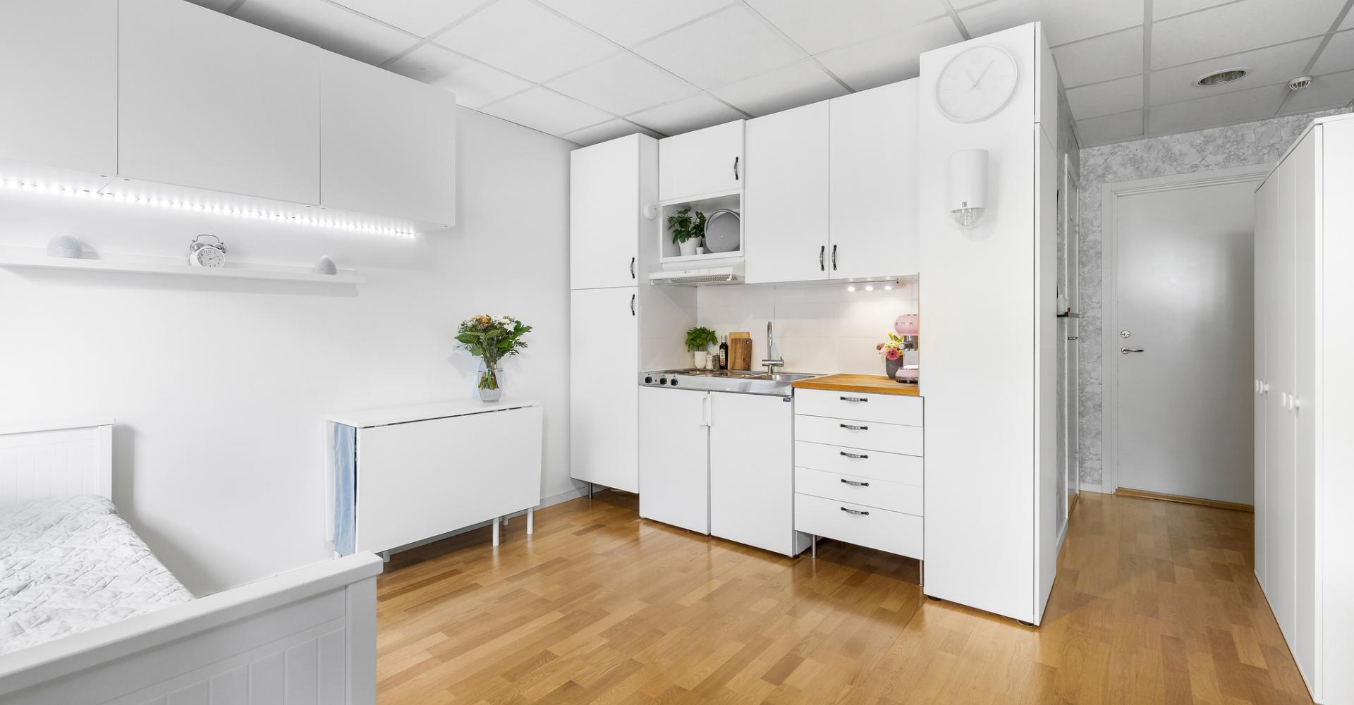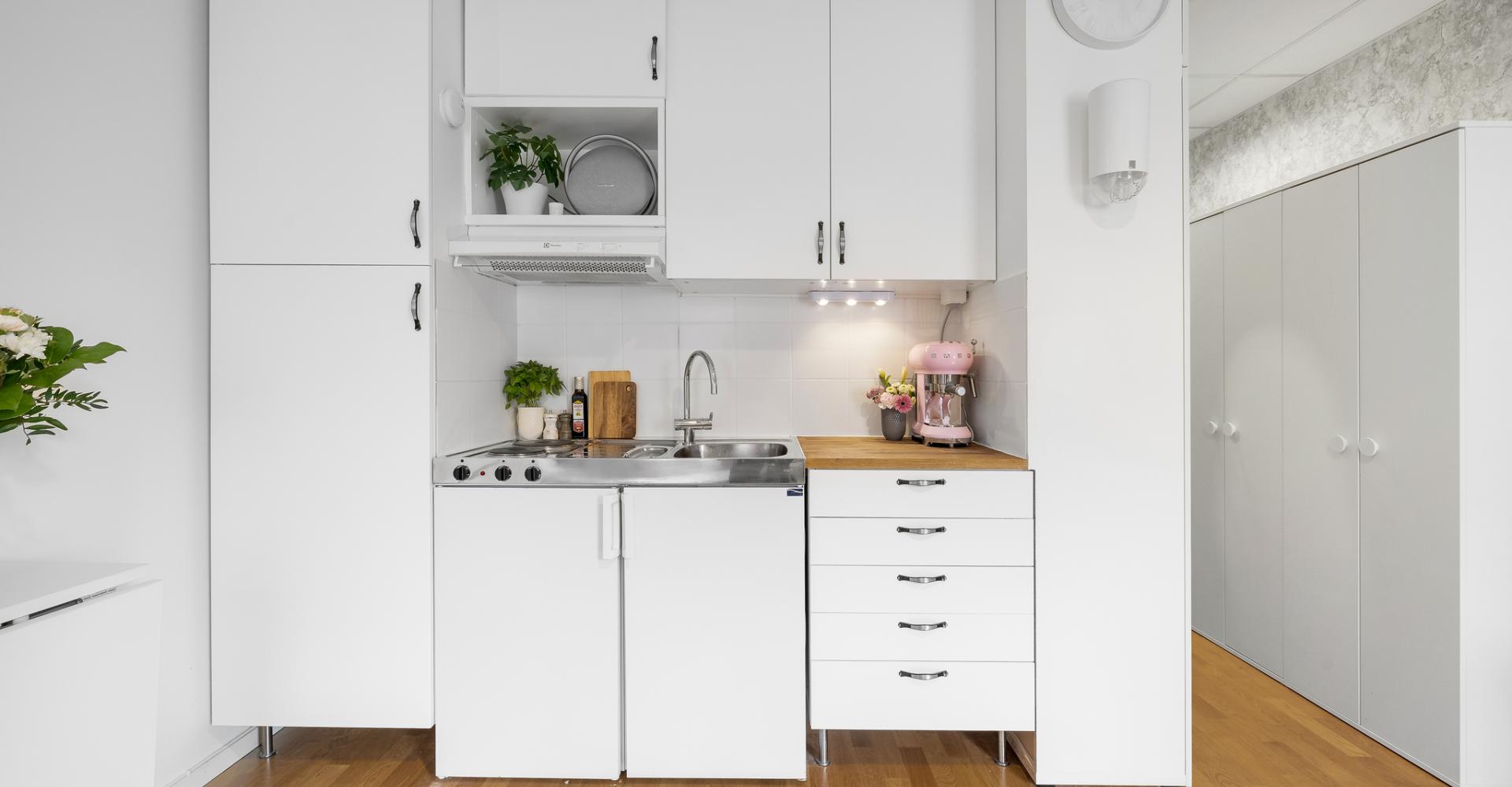 Pentryt är utrustat med spisplattor, spisfläkt samt kyl.