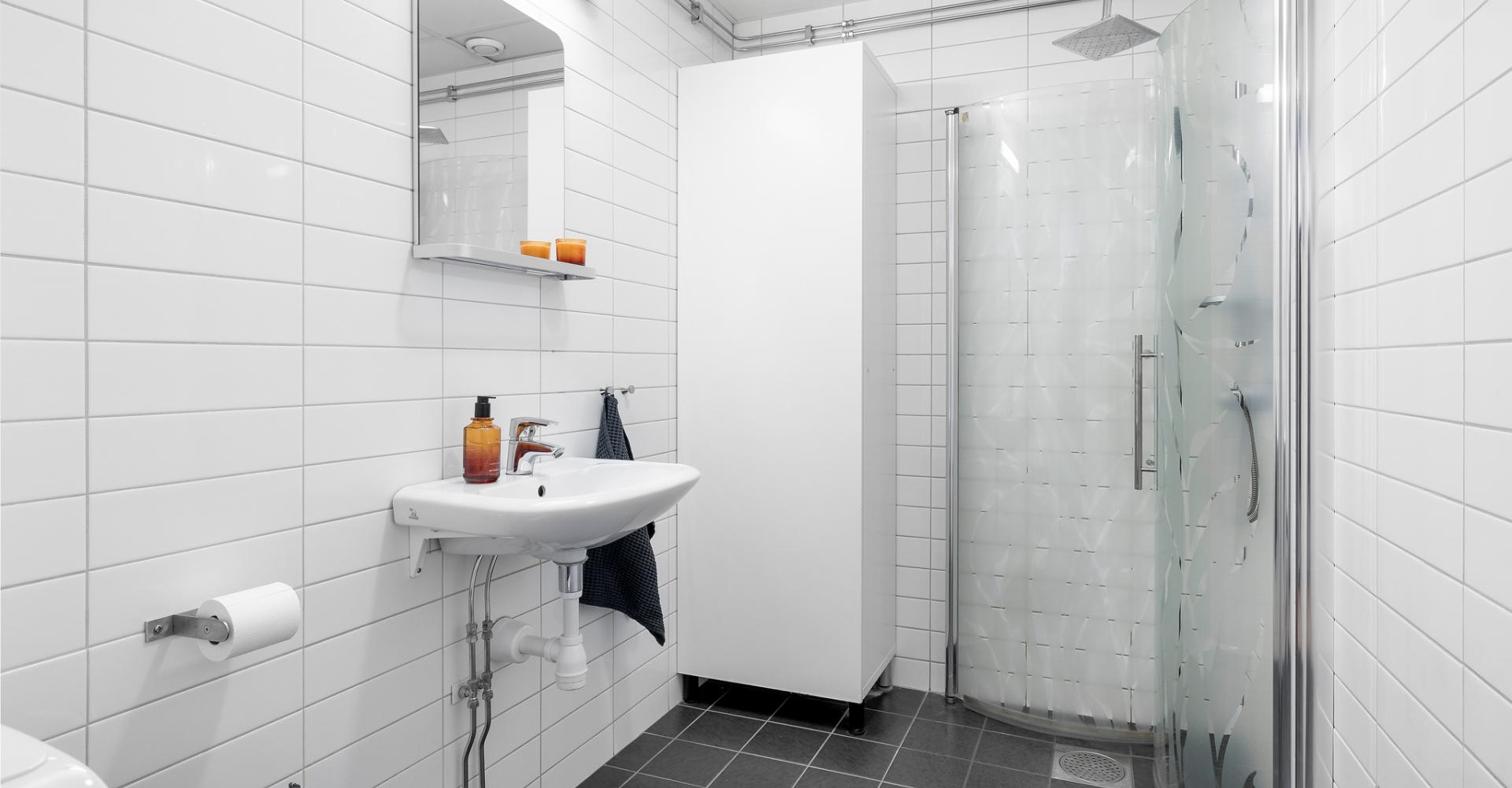 Badrummet är utrustat med w.c, handfat, högskåp samt dusch med duschväggar.