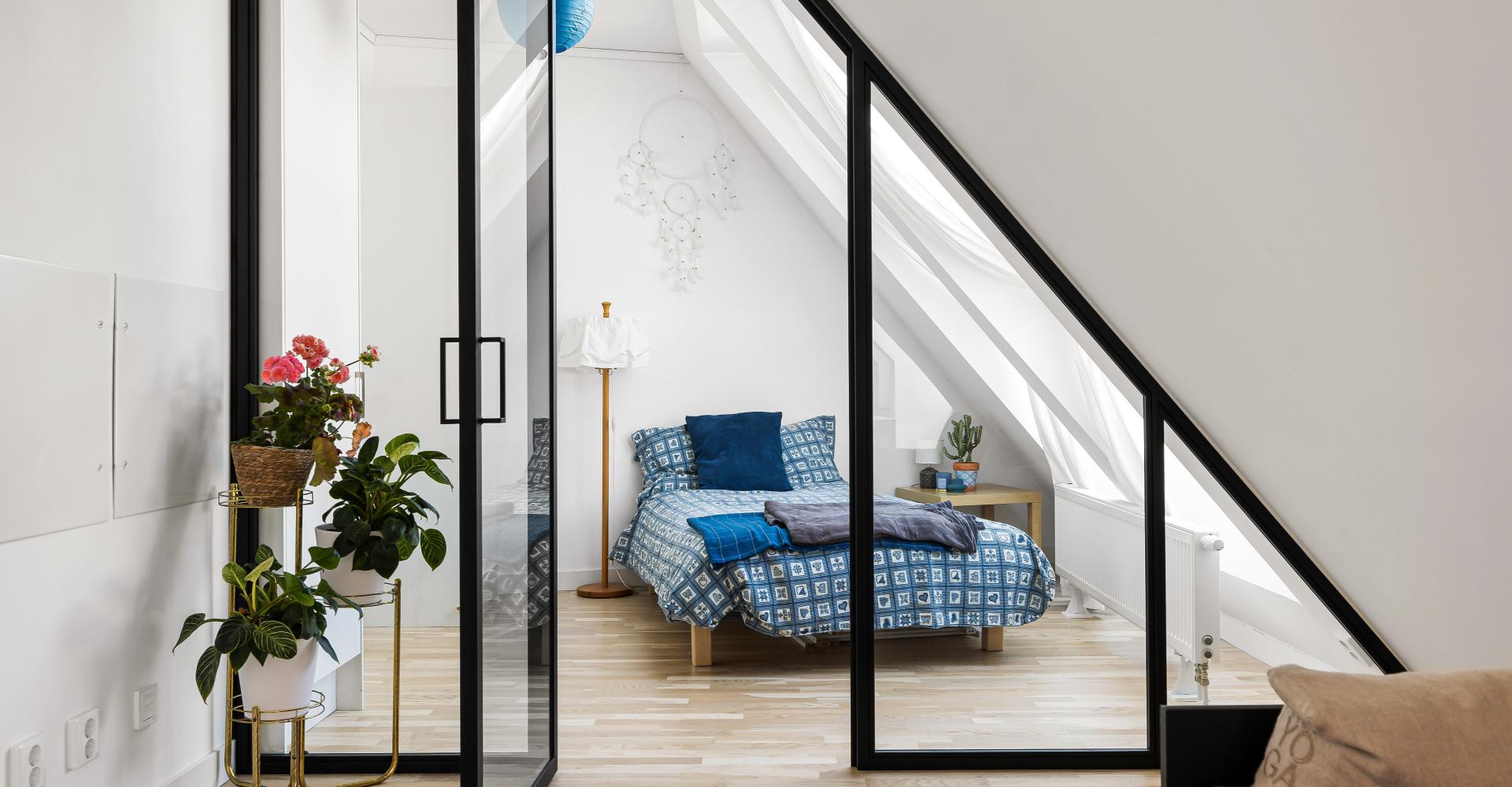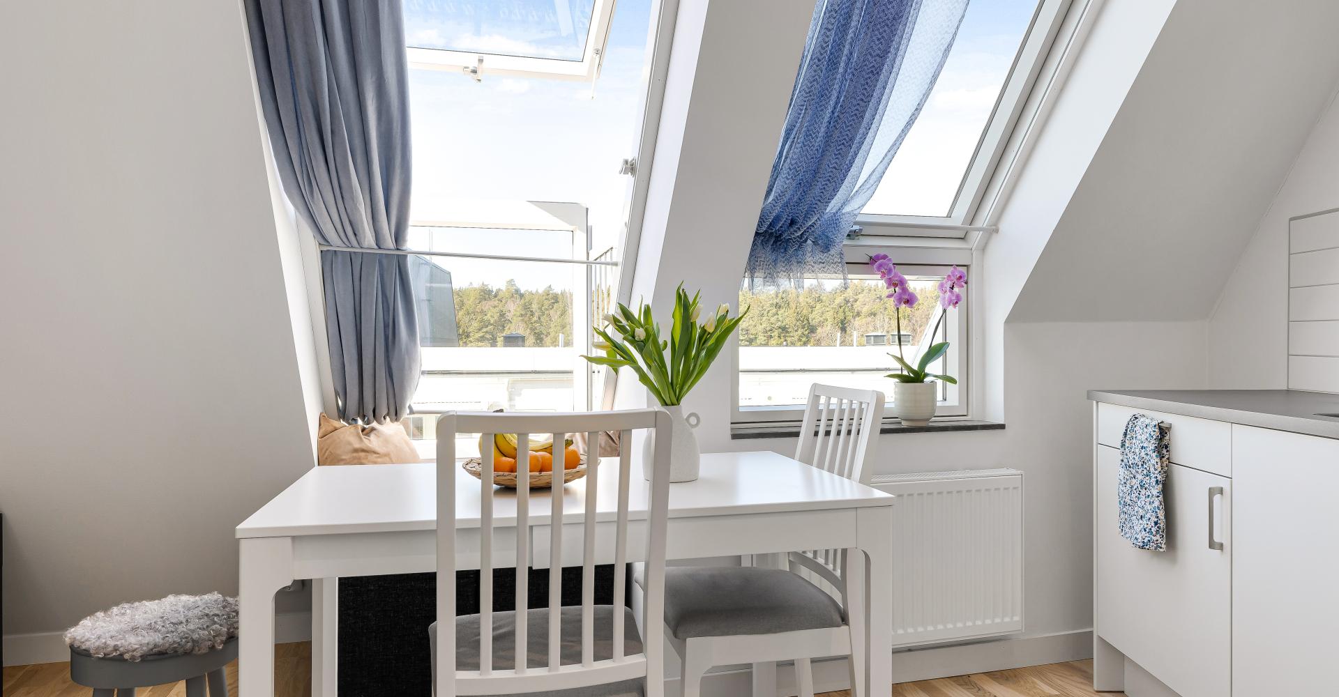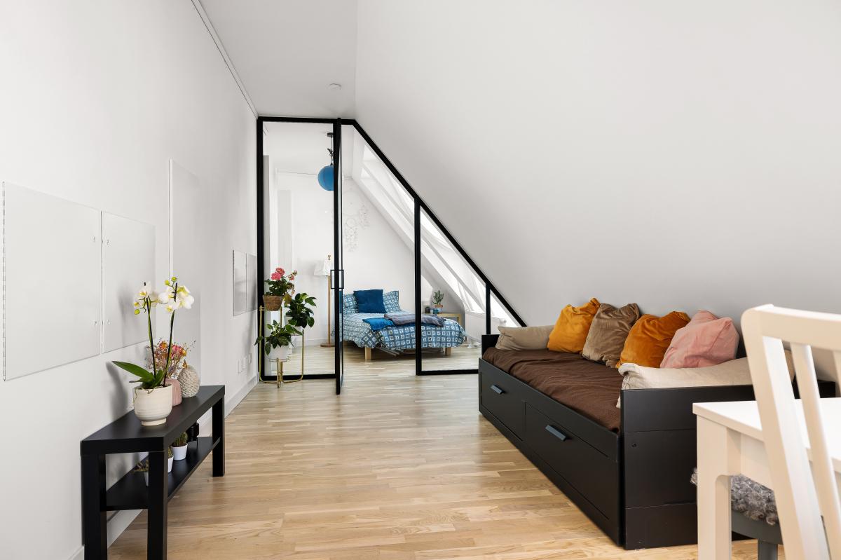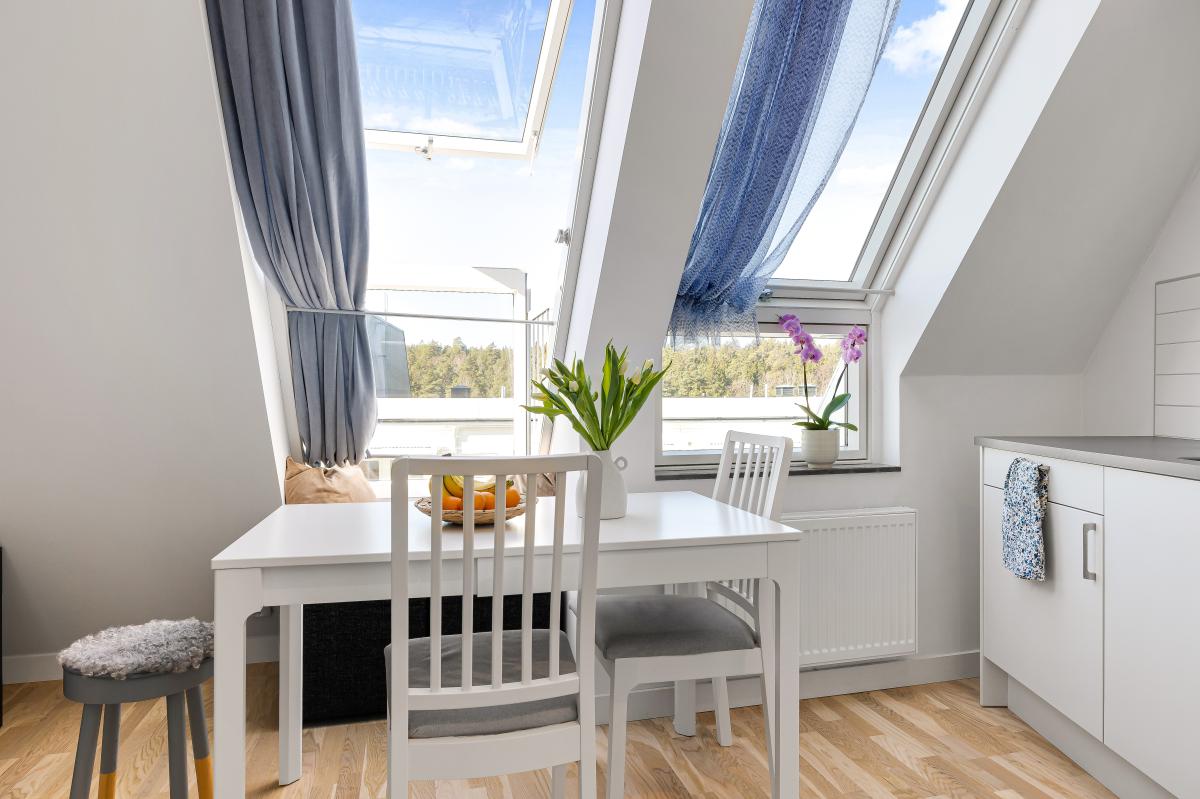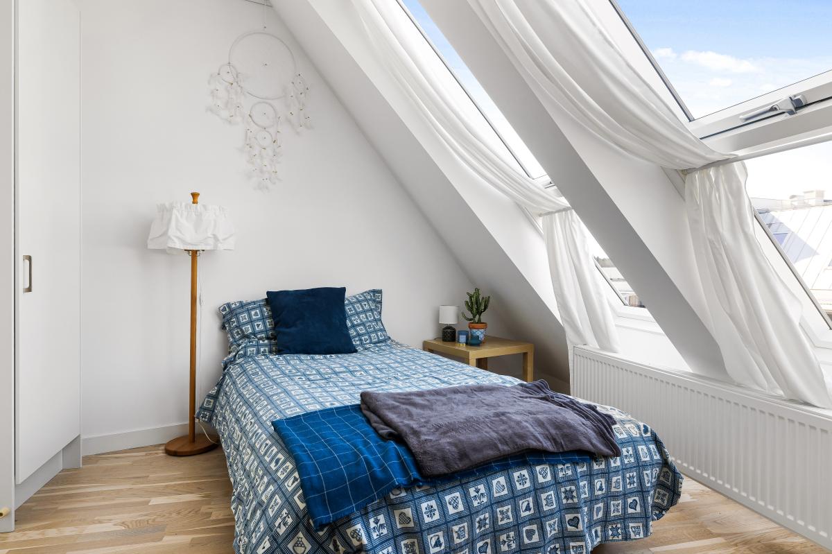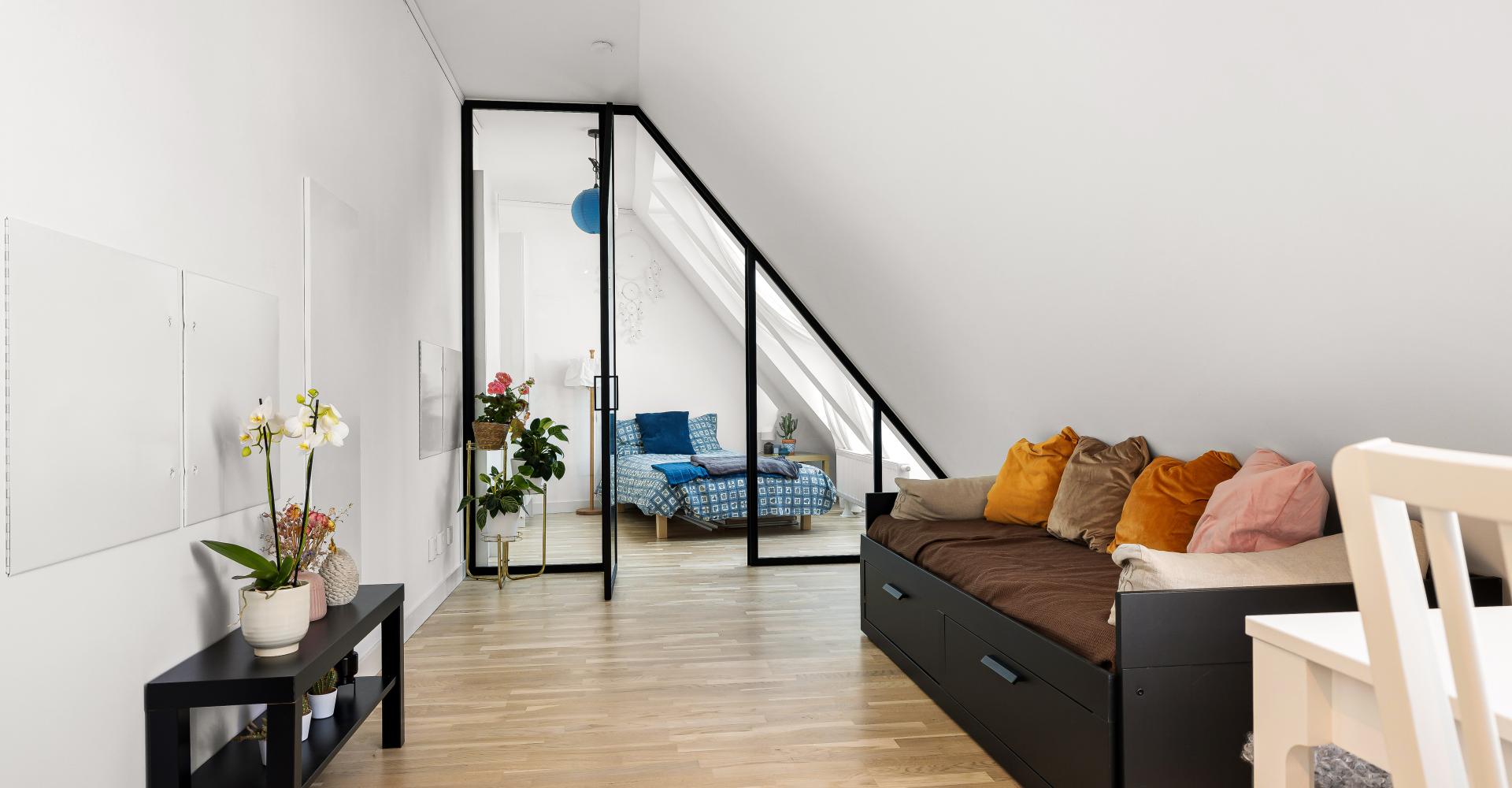 Lägenheten högst upp med härliga snedtak och fint ljusinsläpp.