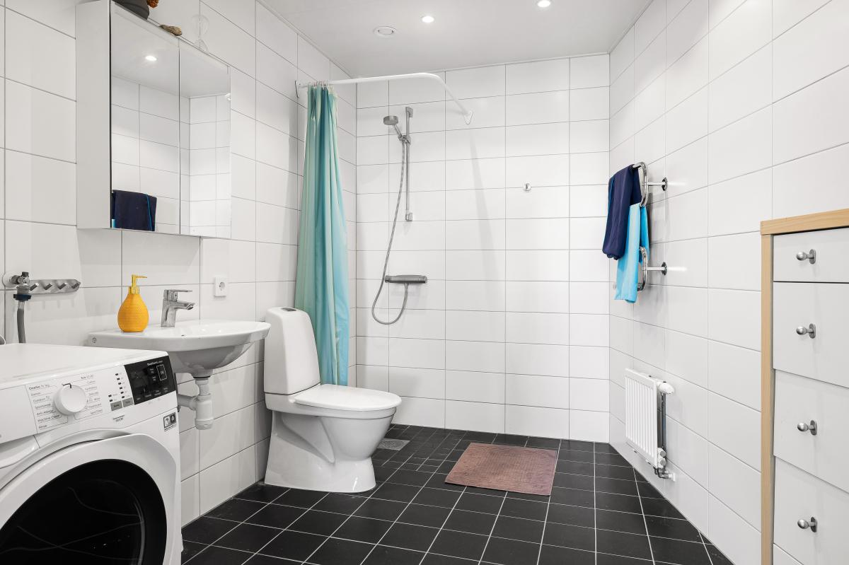 Badrum med klinkergolv (golvvärme), helkaklade väggar samt spotlights i tak. Badrummet är utrustat med w.c., handfat, badrumsskåp med spegel och belysning, dusch samt kombinerad tvättmaskin och torktumlare.