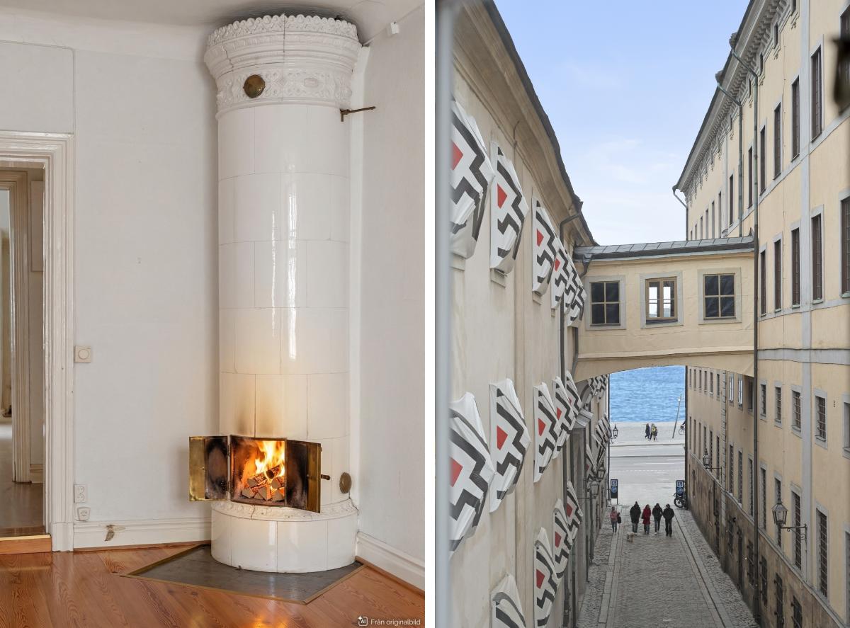 Här finns en kakelugn som tidigare renoverats av brf och därefter använts av tidigare ägare. Takspotlights. Takhöjden här är ca 2,65 cm. Ett fönster med fin kontakt mot Järntorget och längs Norra Bankogränd utsikt ner mot Skeppsbron och Saltsjön.