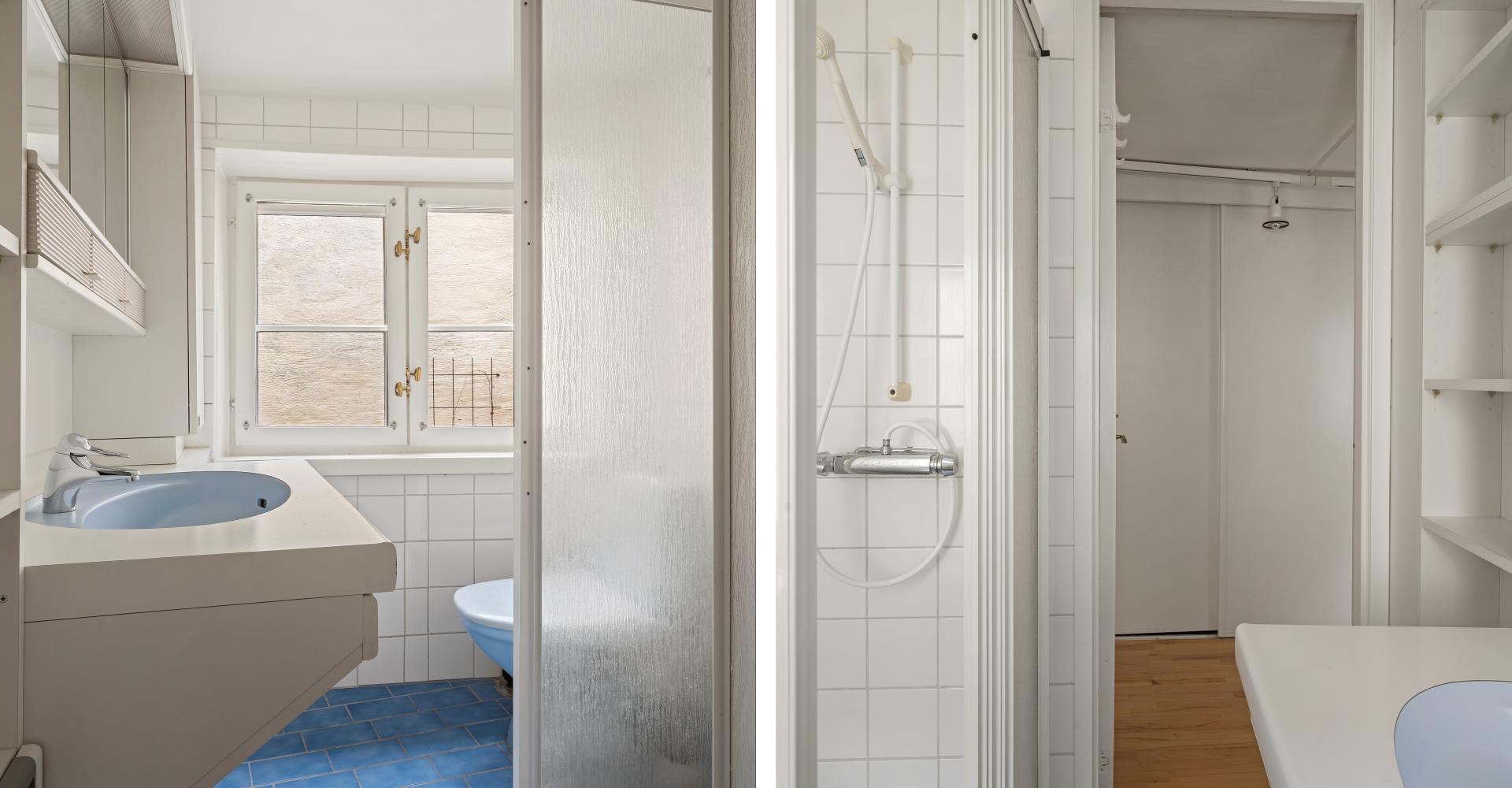 Kakel och klinker troligen uppfört i samband med totalrenoveringen 1985. Duschhörna och handfat i kommod med spegelskåp och sidoskåpsförvaring.