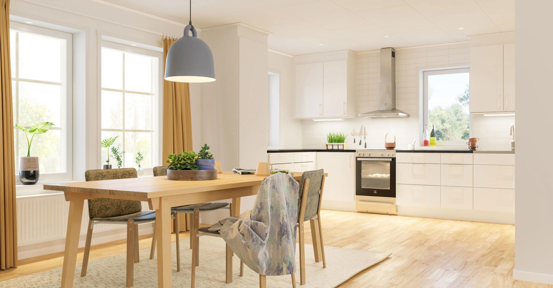 För dig som söker ett mindre hus med plats för vänner och middagar är Greta ett lysande val. Här är det integrerade köket/vardagsrummet det största av alla bland Älvsbyhus mindre enplanshus.