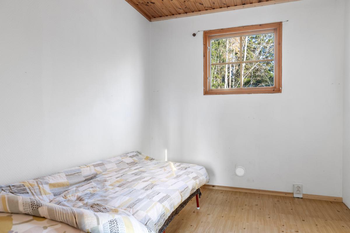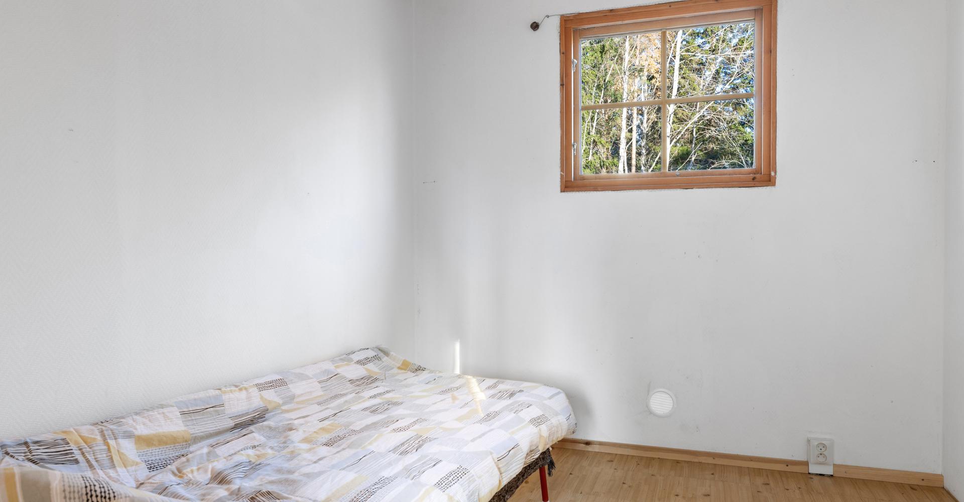 Sovrum med plastmatta, vitmålad väv och trätak.