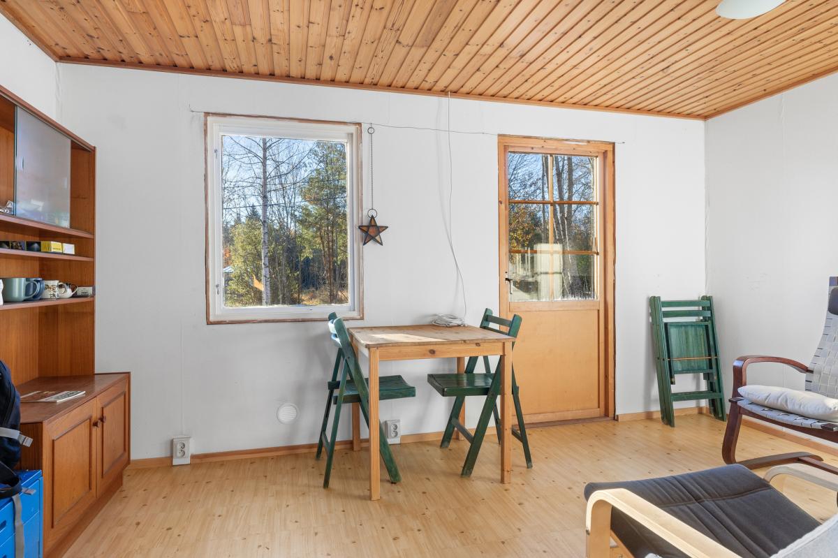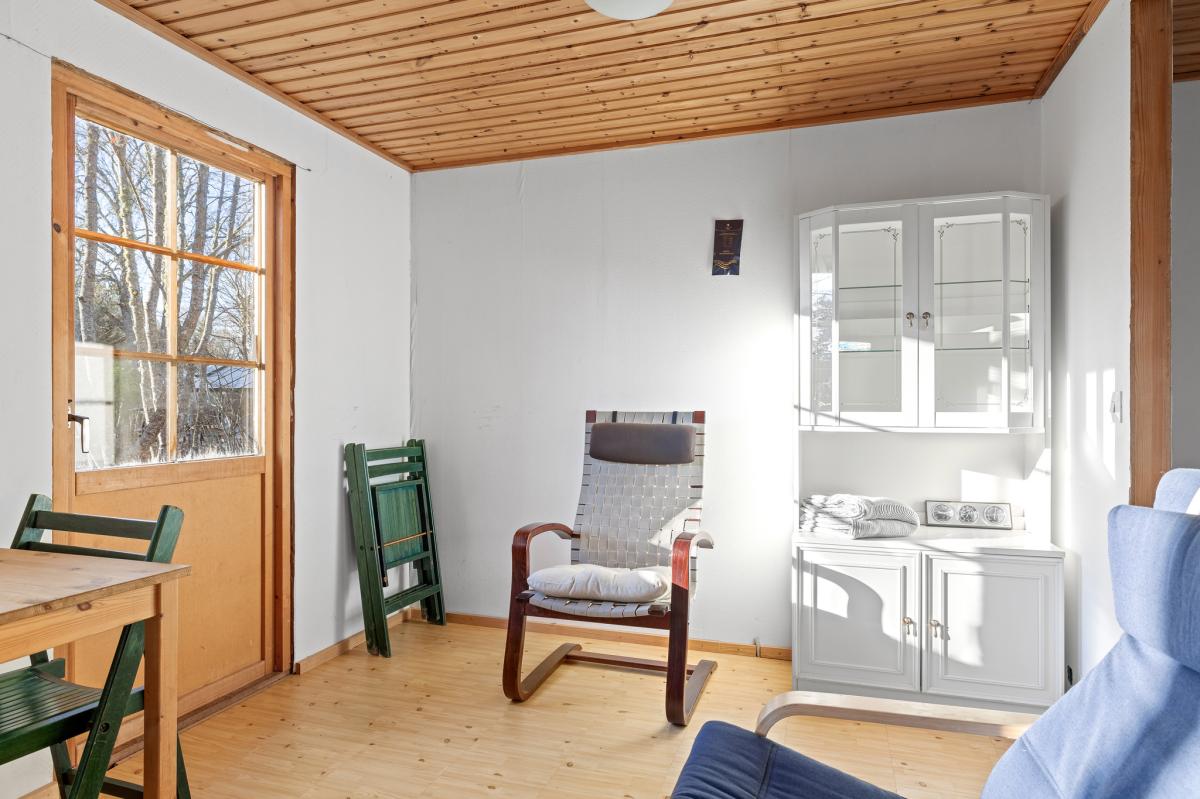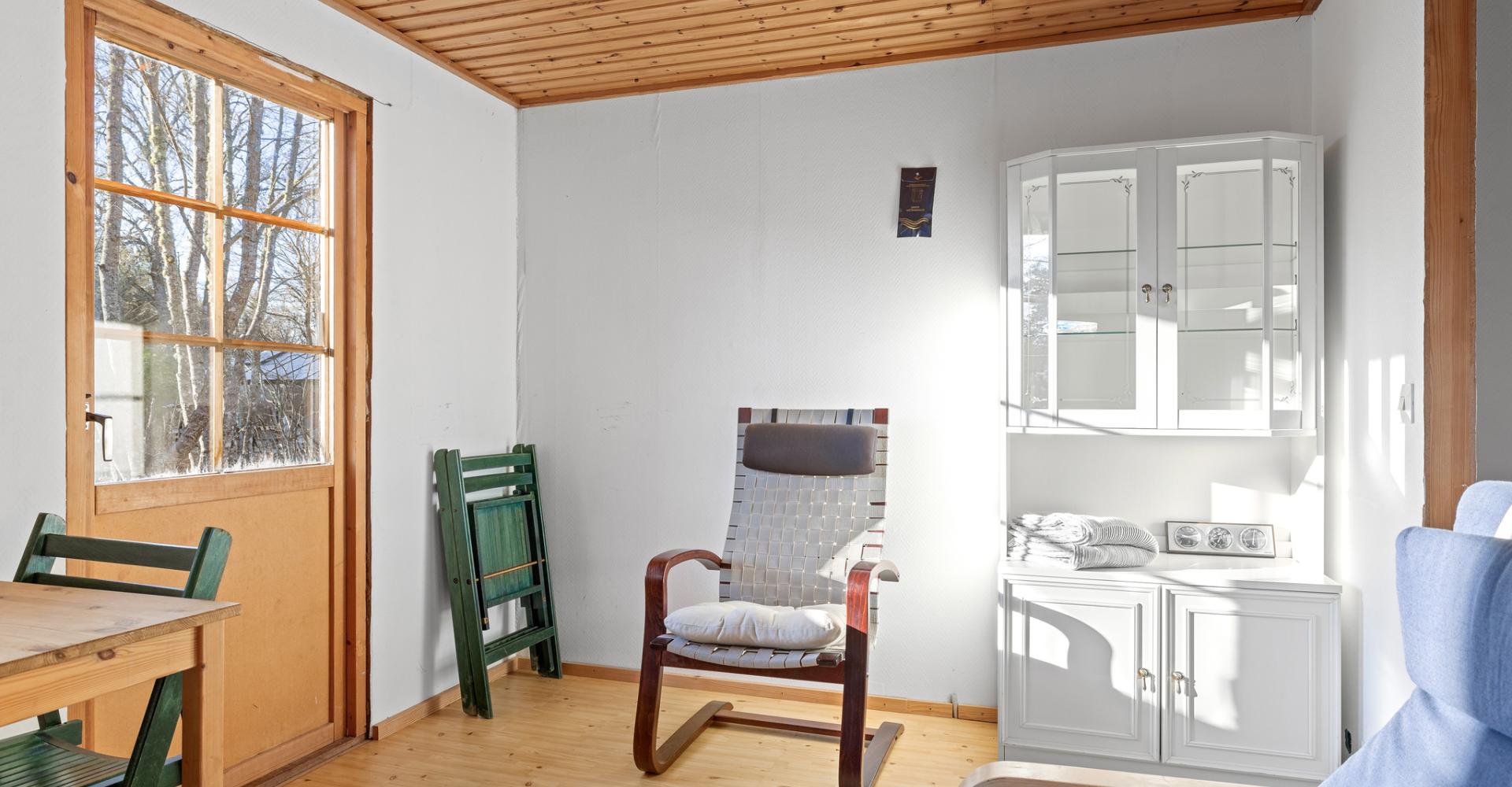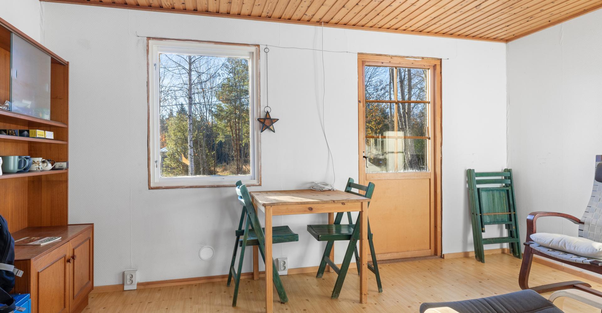Vardagsrum/allrum med plastmatta, vitmålad väv, trätak och kyl/frys. Utgång till tomten.