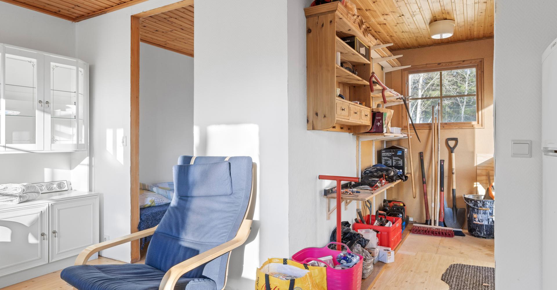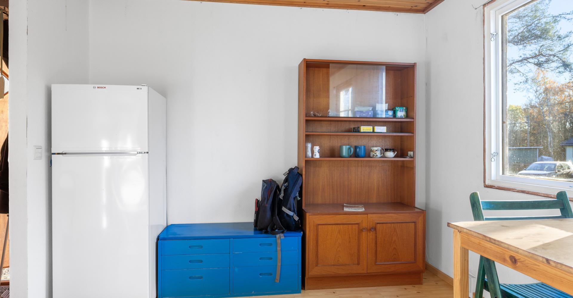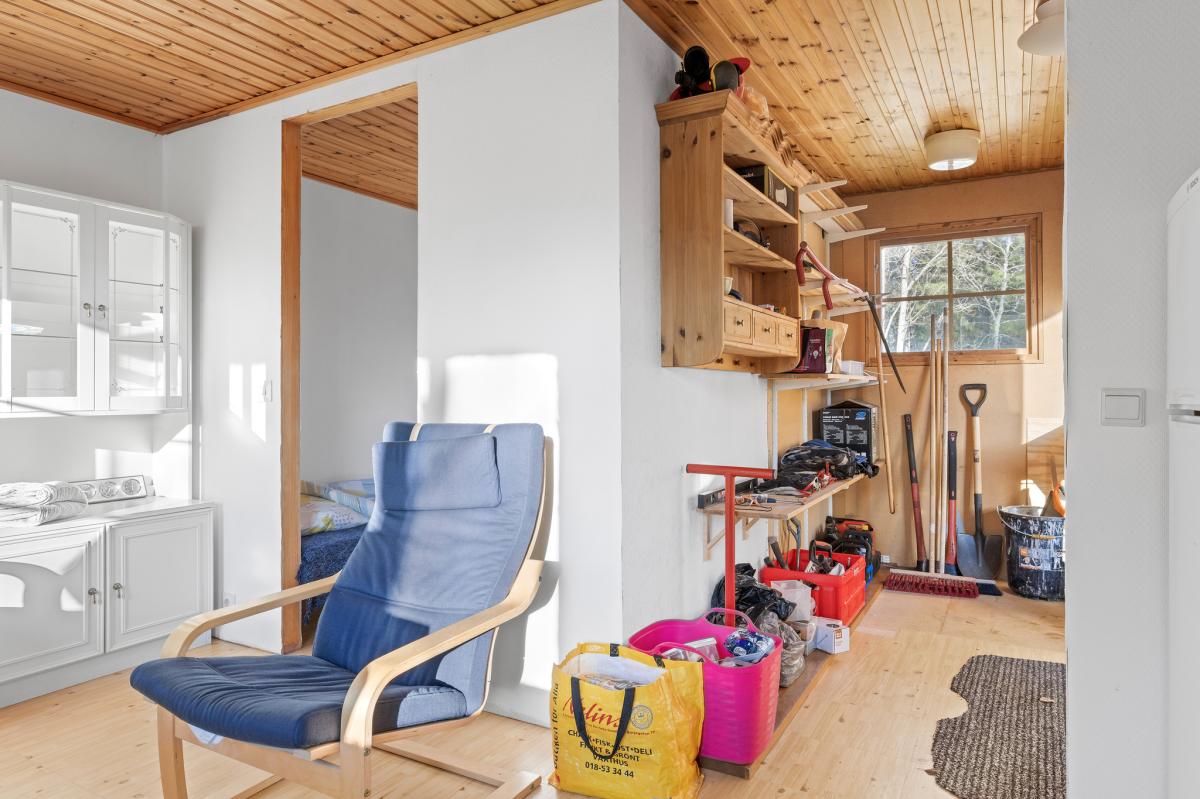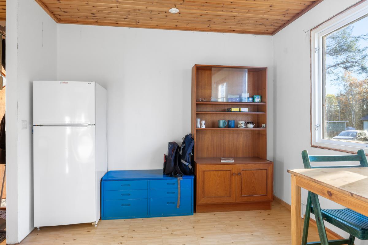 Vardagsrum/allrum med plastmatta, vitmålad väv, trätak och kyl/frys. Utgång till tomten.