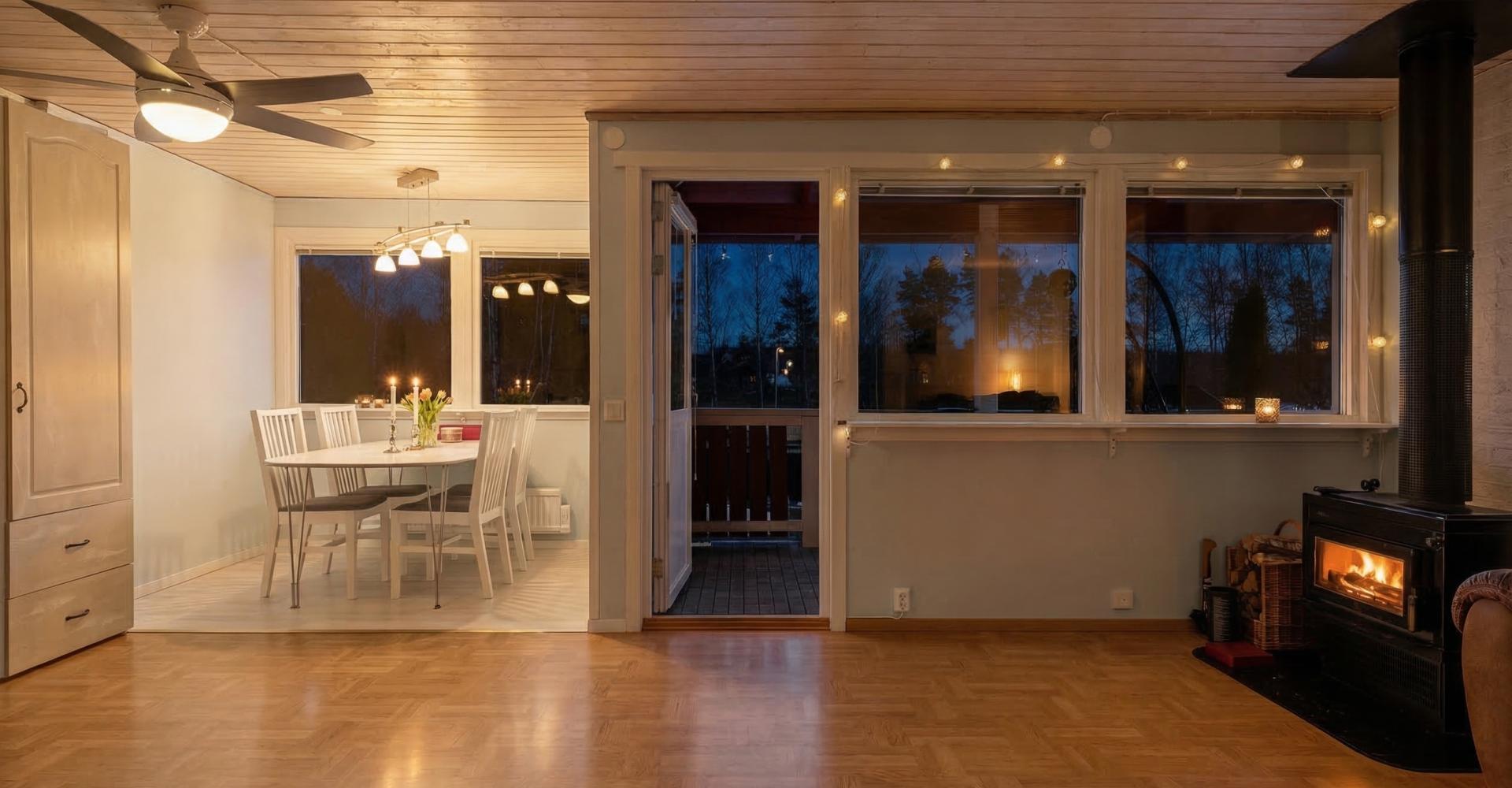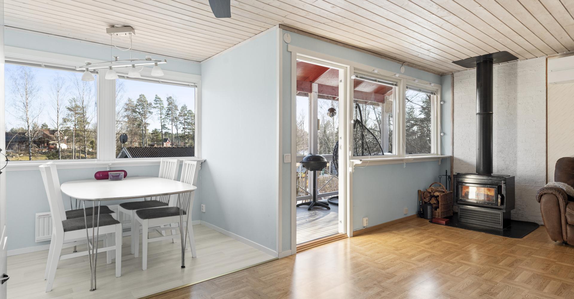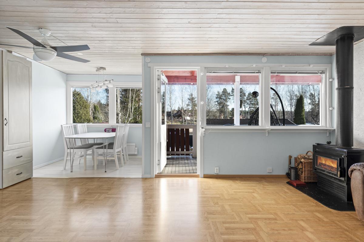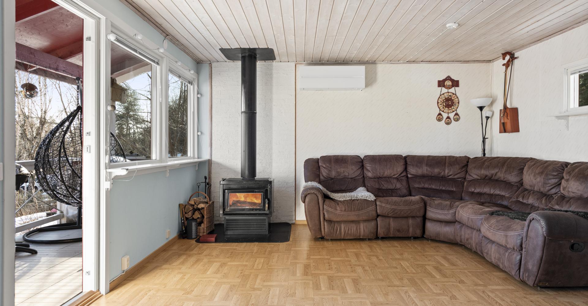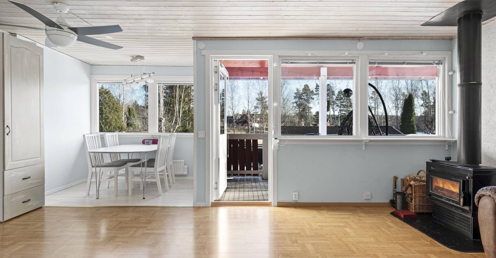 Vardagsrum med laminatgolv, tapet, trätak samt kamin, utgång till altan under tak.