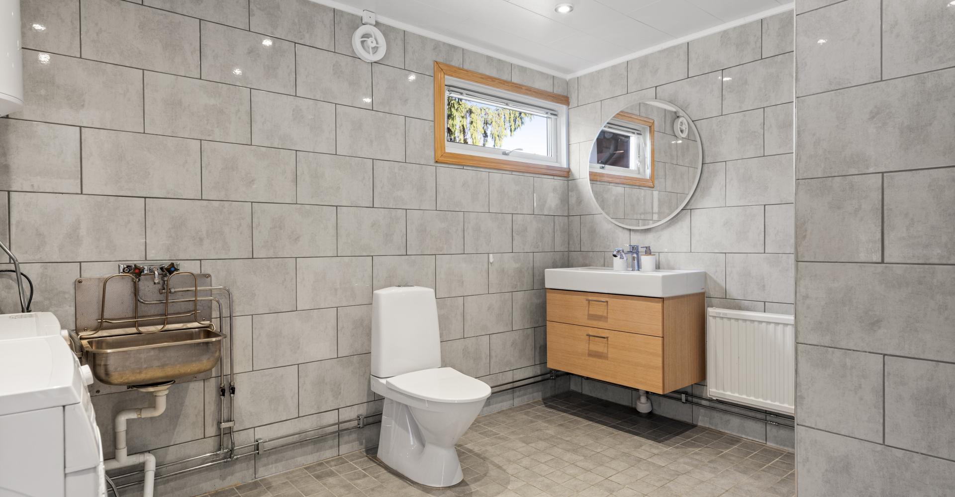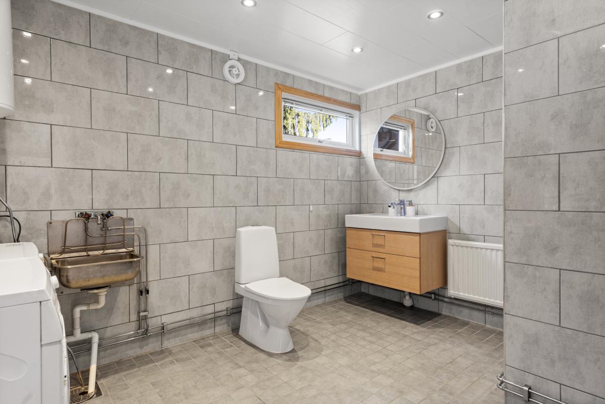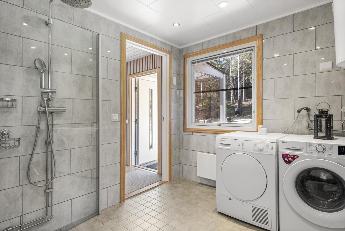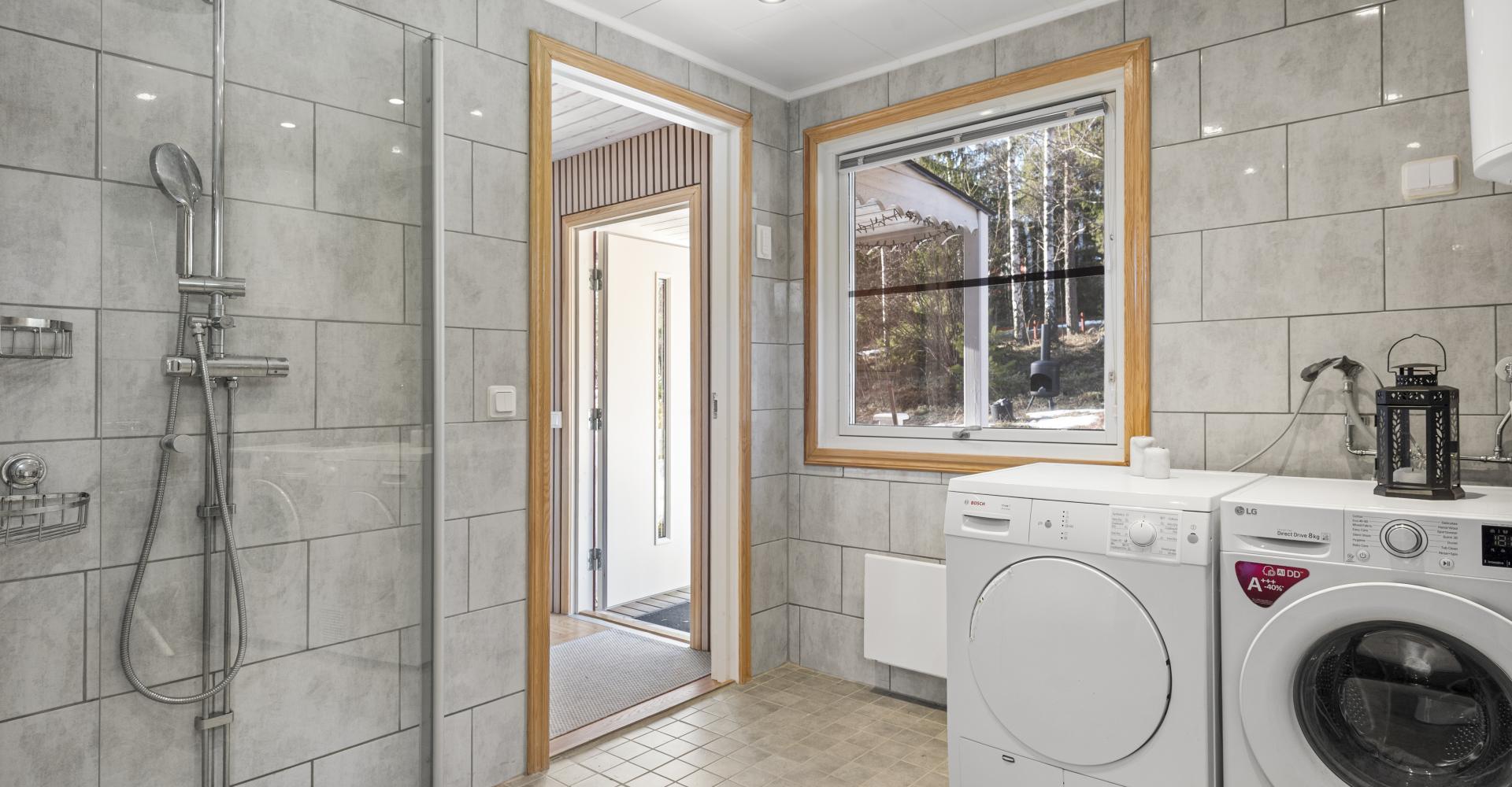 Badrummet är utrustat med w.c., kommod, badrumsskåp med belysning, dusch, tvättmaskin, torktumlare, tvättho samt varmvattenberedare.