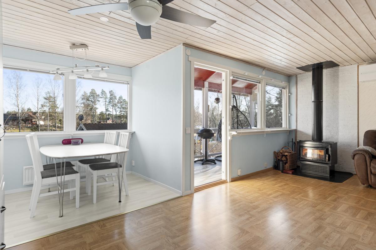Vardagsrum med utgång till altan under tak