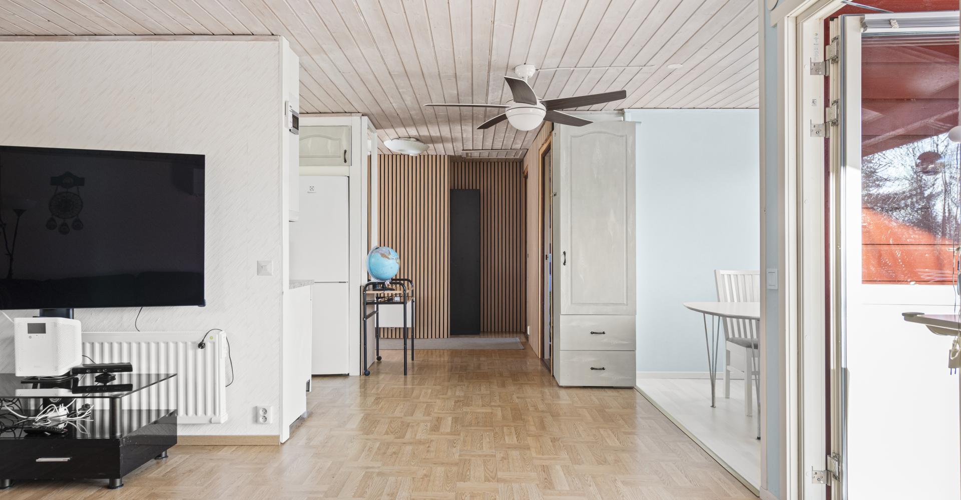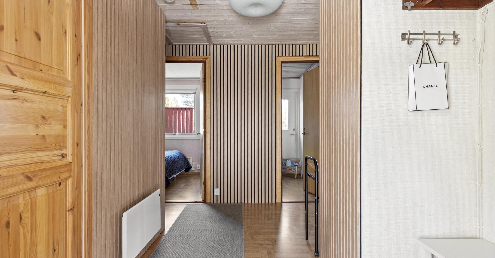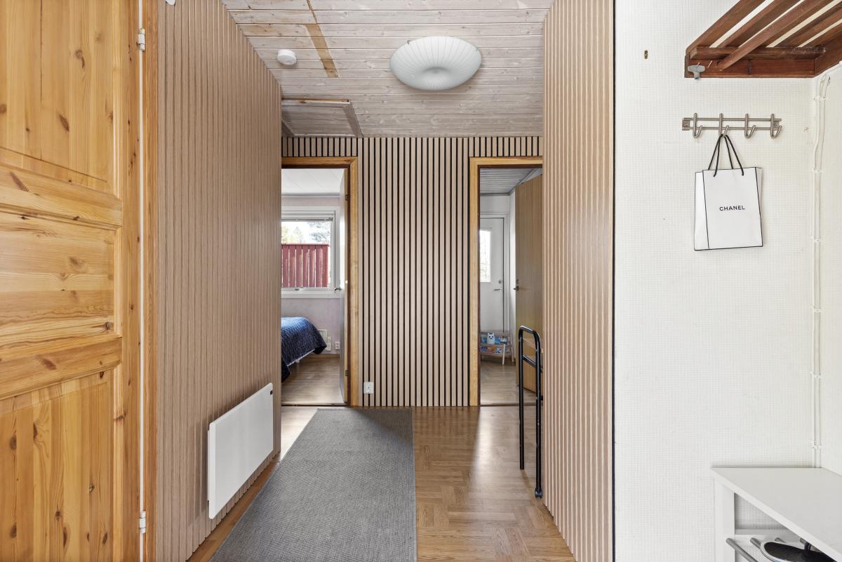 Hall med laminatgolv, panel på en vägg , trätak samt ny ytterdörr -23.