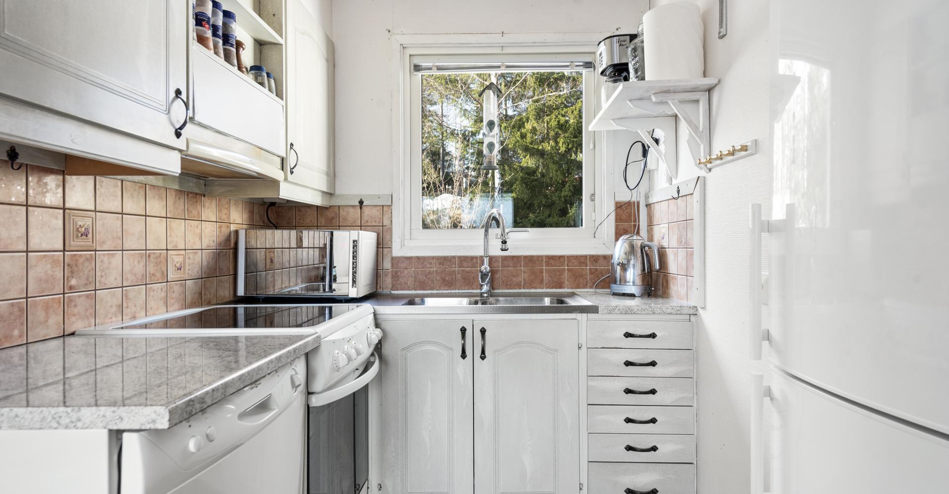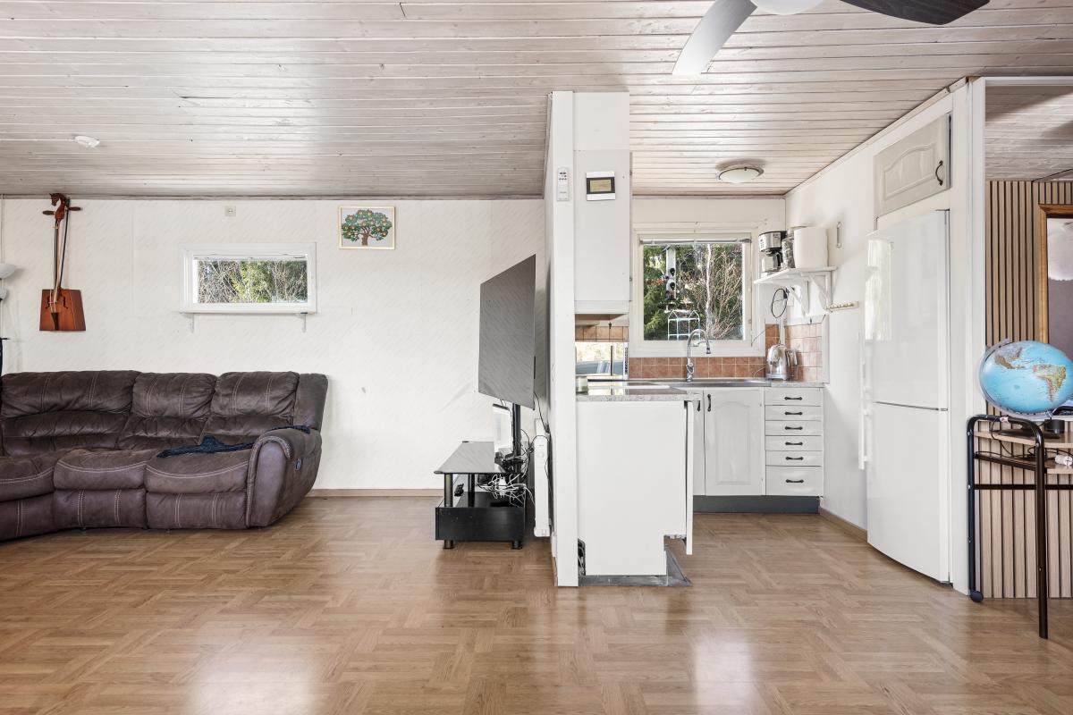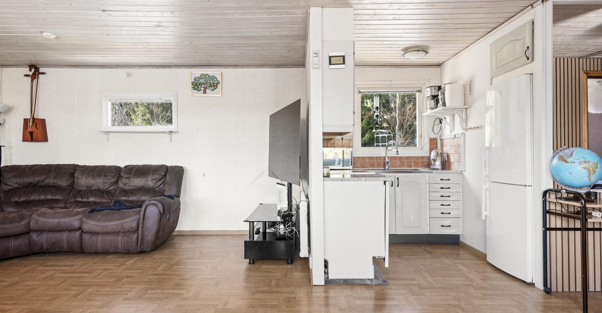 Köket är utrustat med spis med häll, spisfläkt, kyl/frys -17 samt diskmaskin.