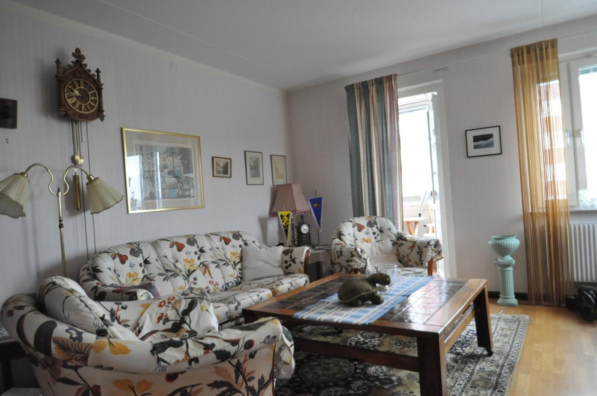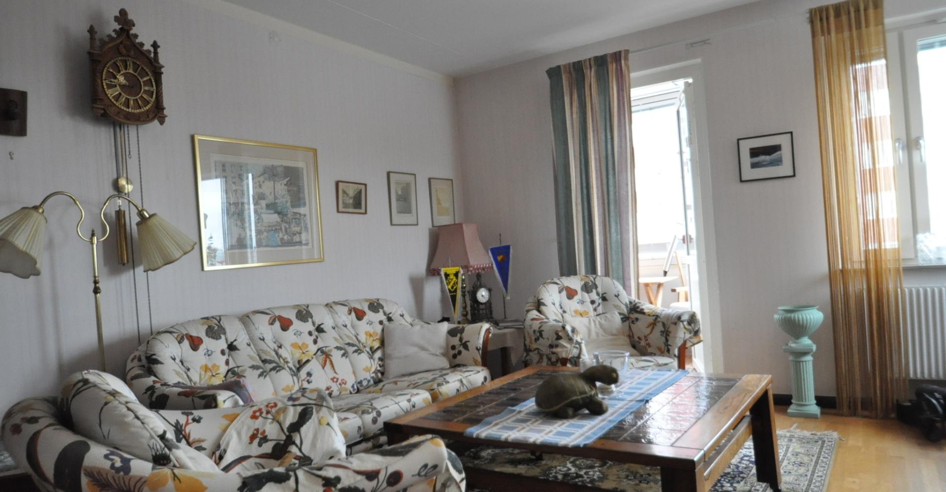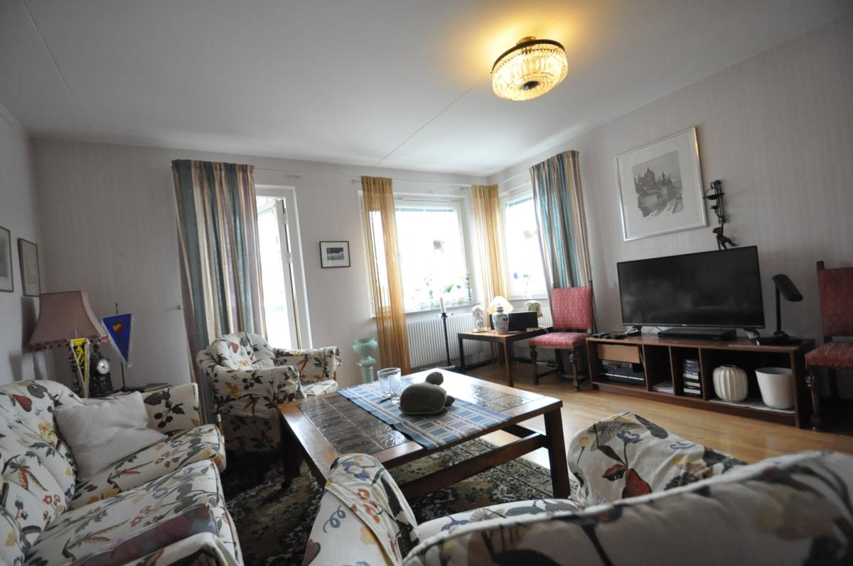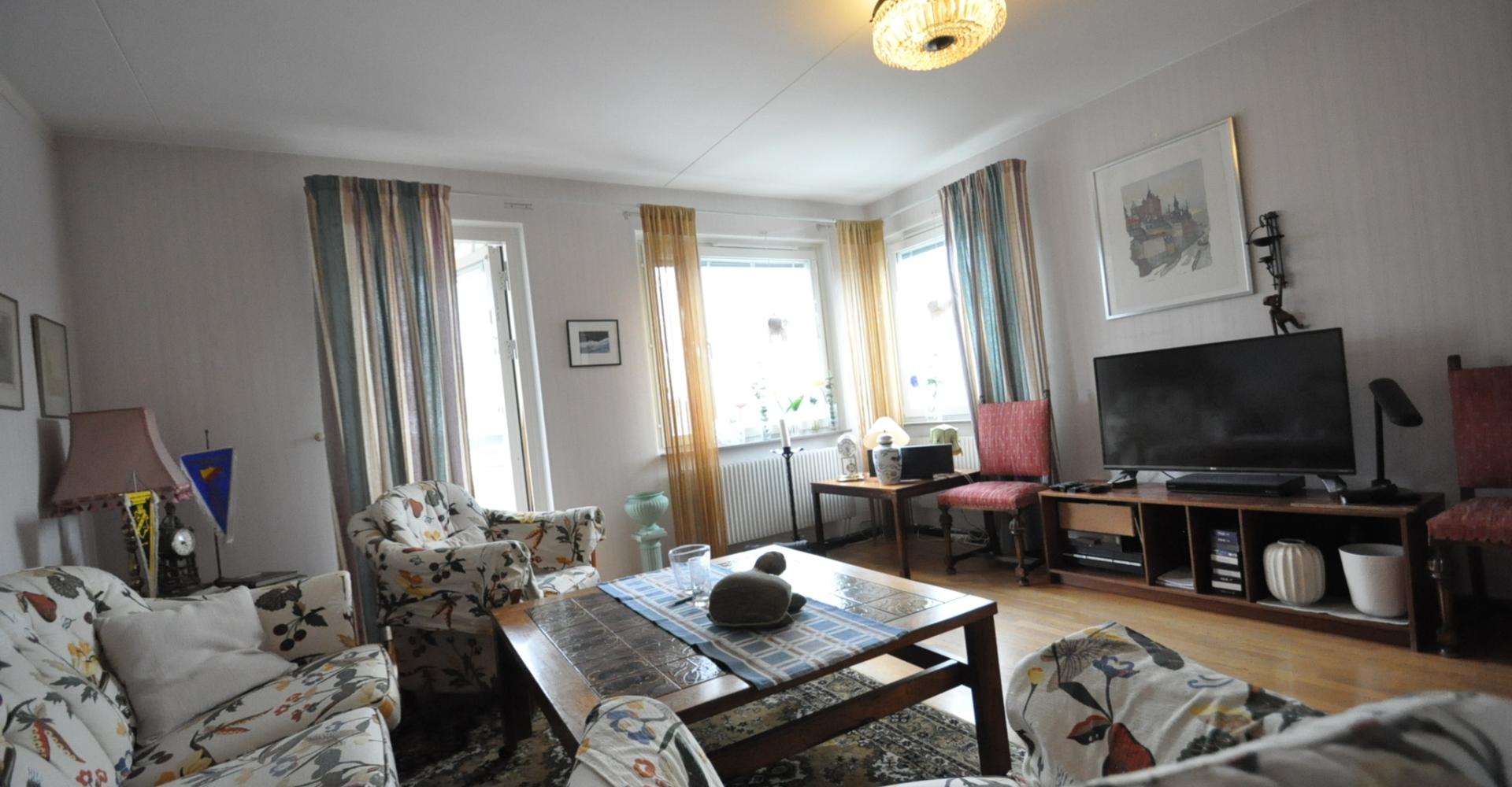 Vardagsrum: Hörnrum med stort ljusinsläpp, parkettgolv, persienner i fönstren, utgång till balkongen med trätrall på golvet, fin utsikt, förmiddagssol . Valv till kökets matplats.