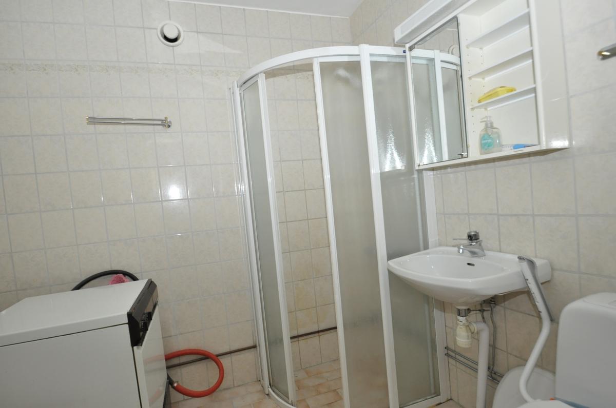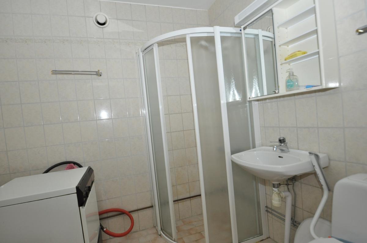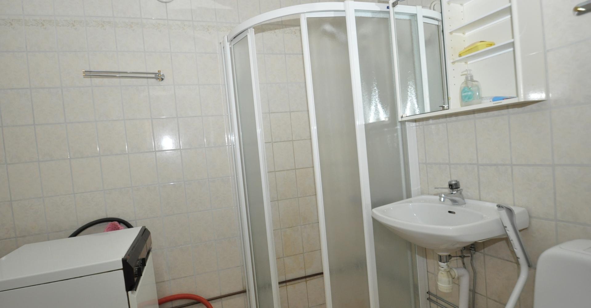 Badrum: Klinkergolv, kaklade väggar, wc, handfat, duschkabin, tvättmaskin, förvaringsskåp.
