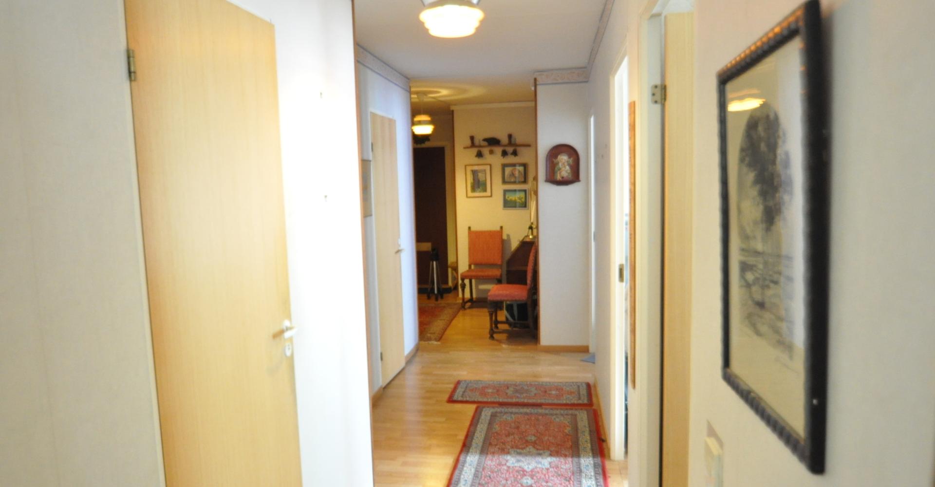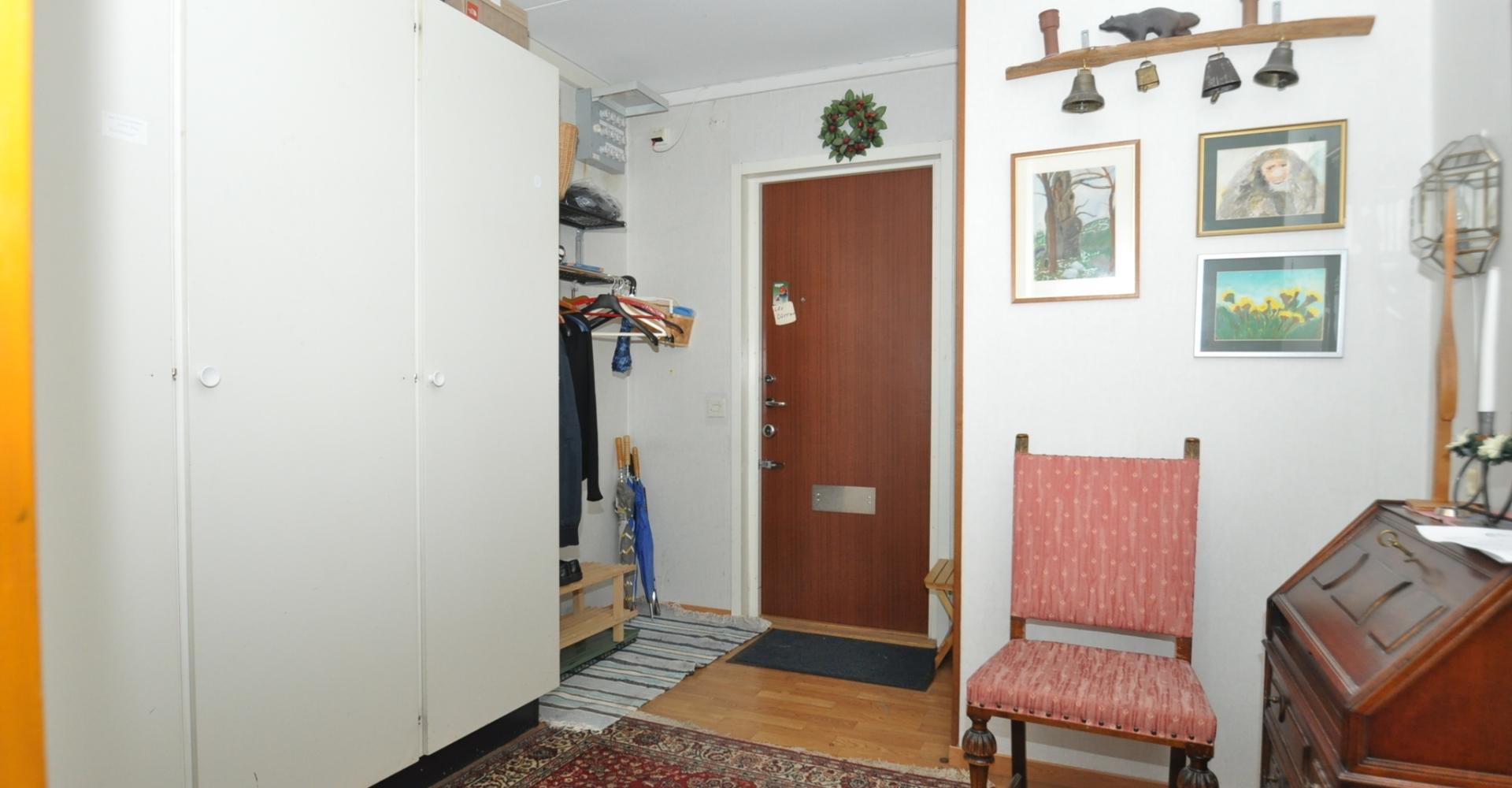 Hall: Hatthylla/klädhängare, tre st garderober, säkerhetsdörr