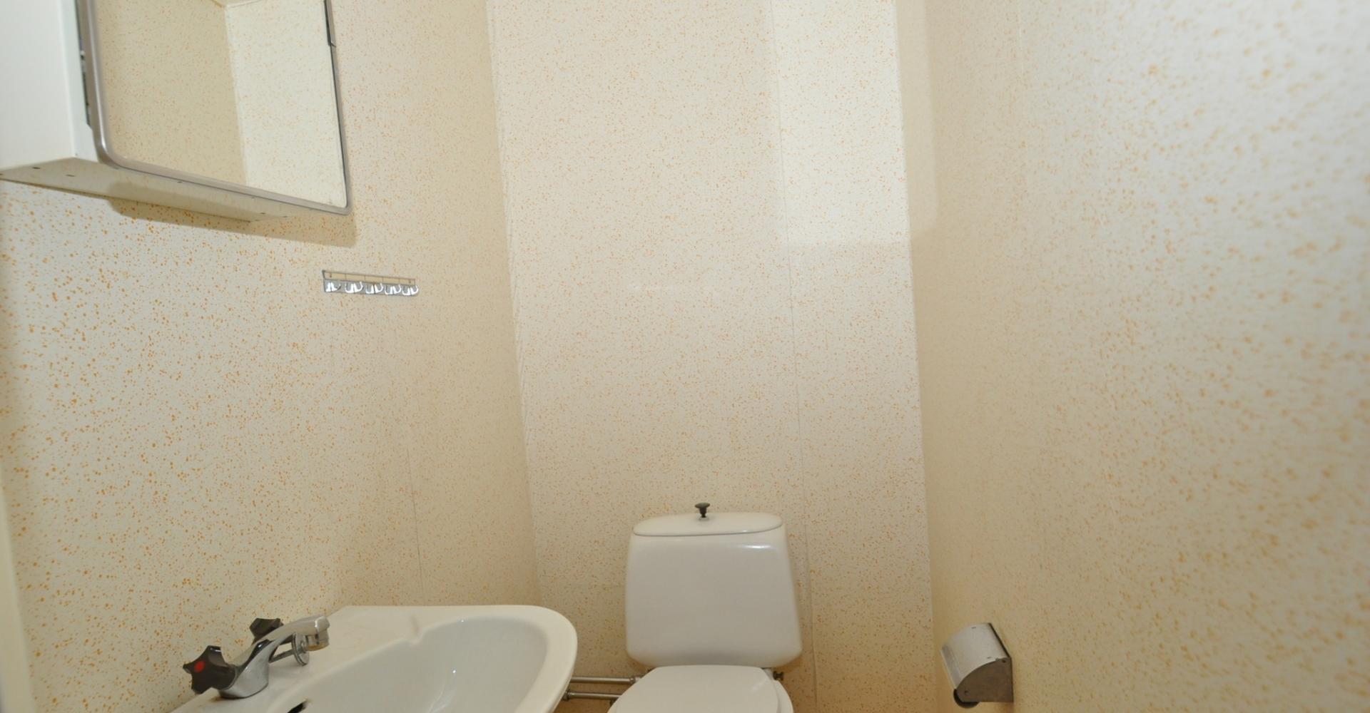 Separat wc och handfat, linoleumgolv, våtrumstapet.
