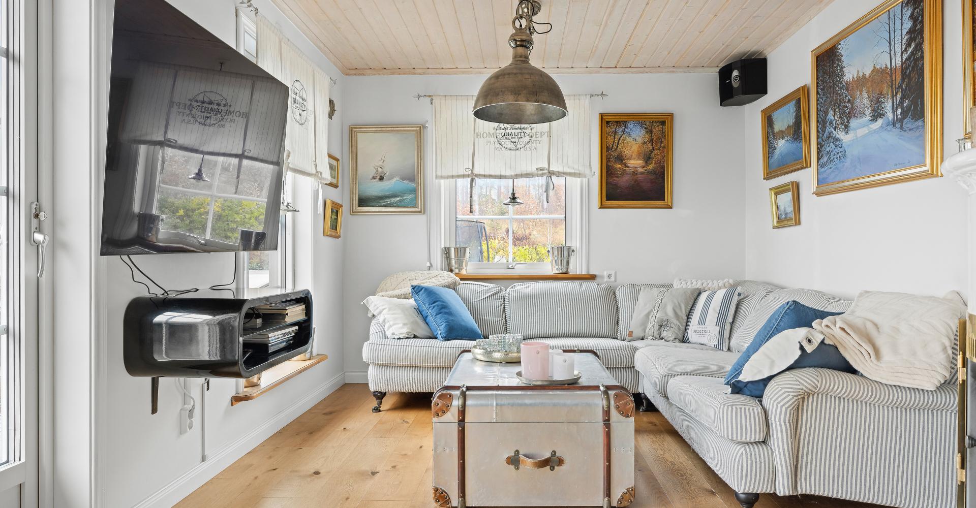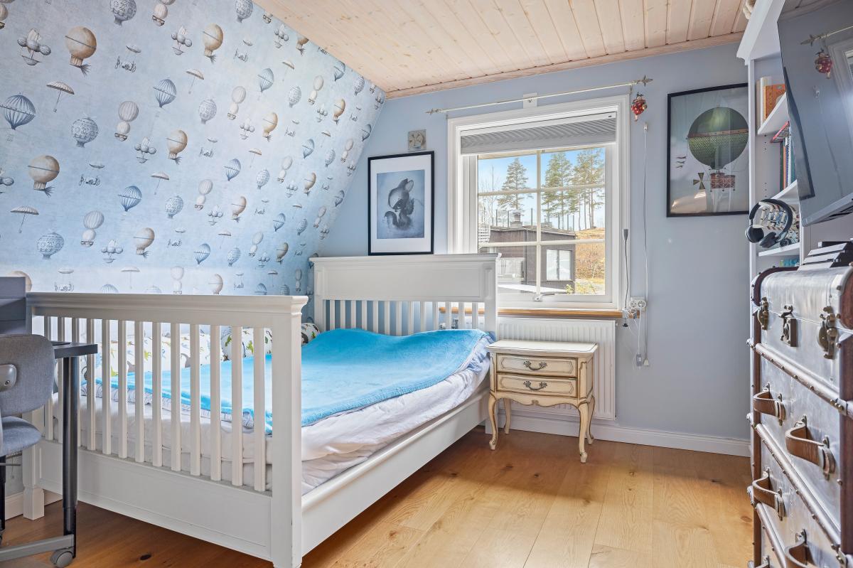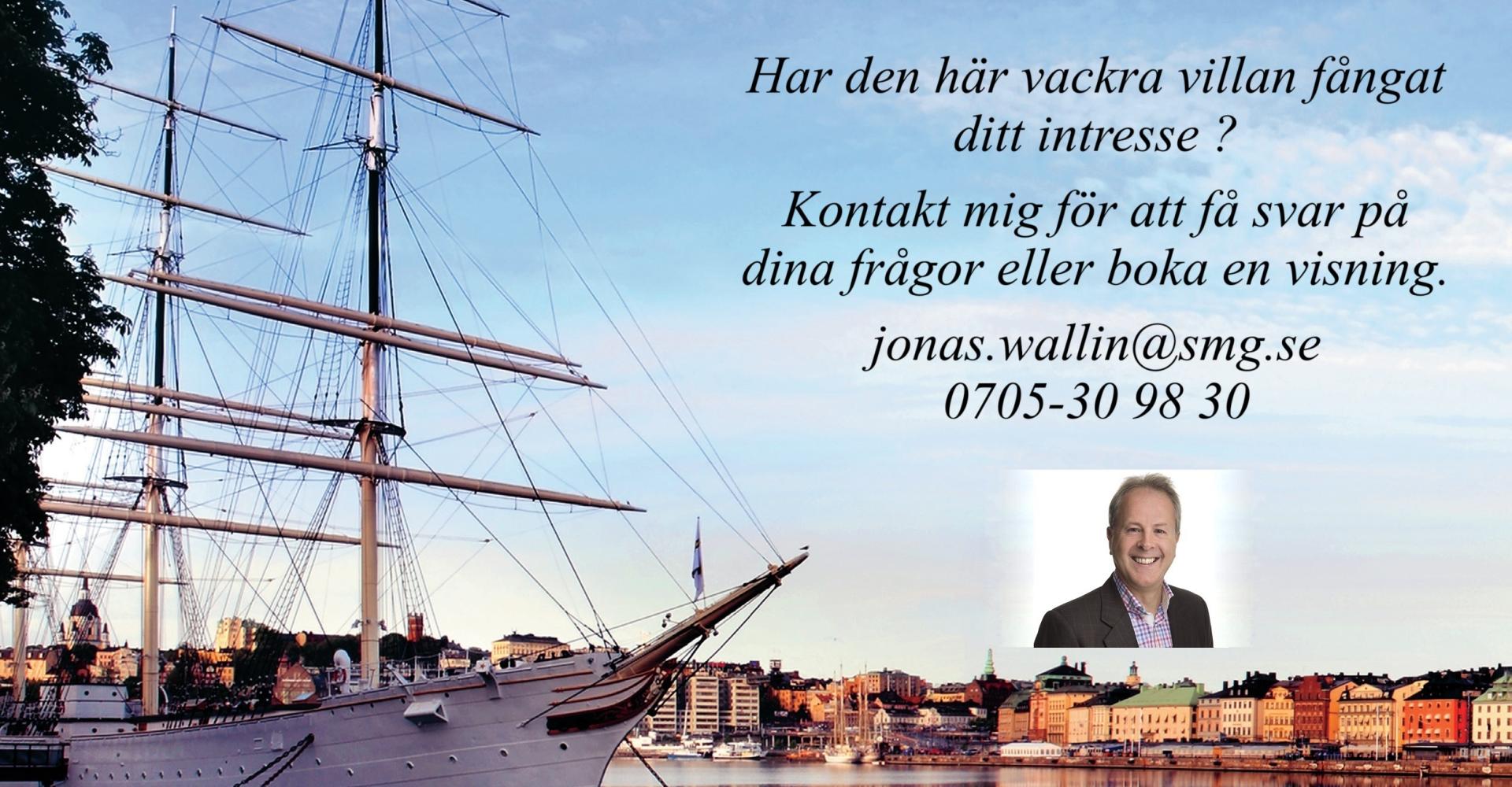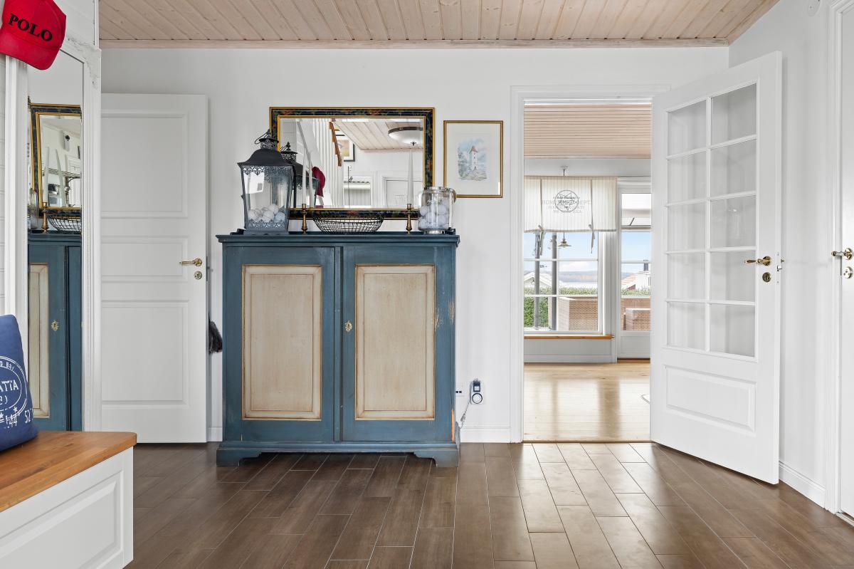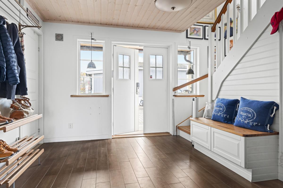 Invändigt möts du i entrén av en stor möblerbar hall med platsbyggd förvaring, ett stort och fint platsbyggt och påkostat lantkök med både ett rejält skafferi samt stor matplats med utgång direkt till den härliga altanen. Vidare finns ett vardagsrum med en stilfull och effektiv kakelugn i centrum av huset, en biblioteksdel som även kan göras om till ett extra sovrum/gästrum om behov finns. Med ingång från hallen finns även en tvättstuga/groventré samt ett stort fint badrum. Huset har mycket påkostade speciallösningar så som tex golvmaterial, platsbyggd förvaring, detaljer som extra stora fönster åt sjösidan för maximal utsikt och ljusinsläpp, handgjorda och kantfrästa fönsterbrädor samt ett inbyggt ljudsystem, Sonos, som finns både inne med infällda takhögtalare i tex kök badrum och vardagsrum samt på terrassen.