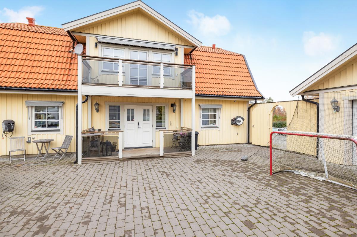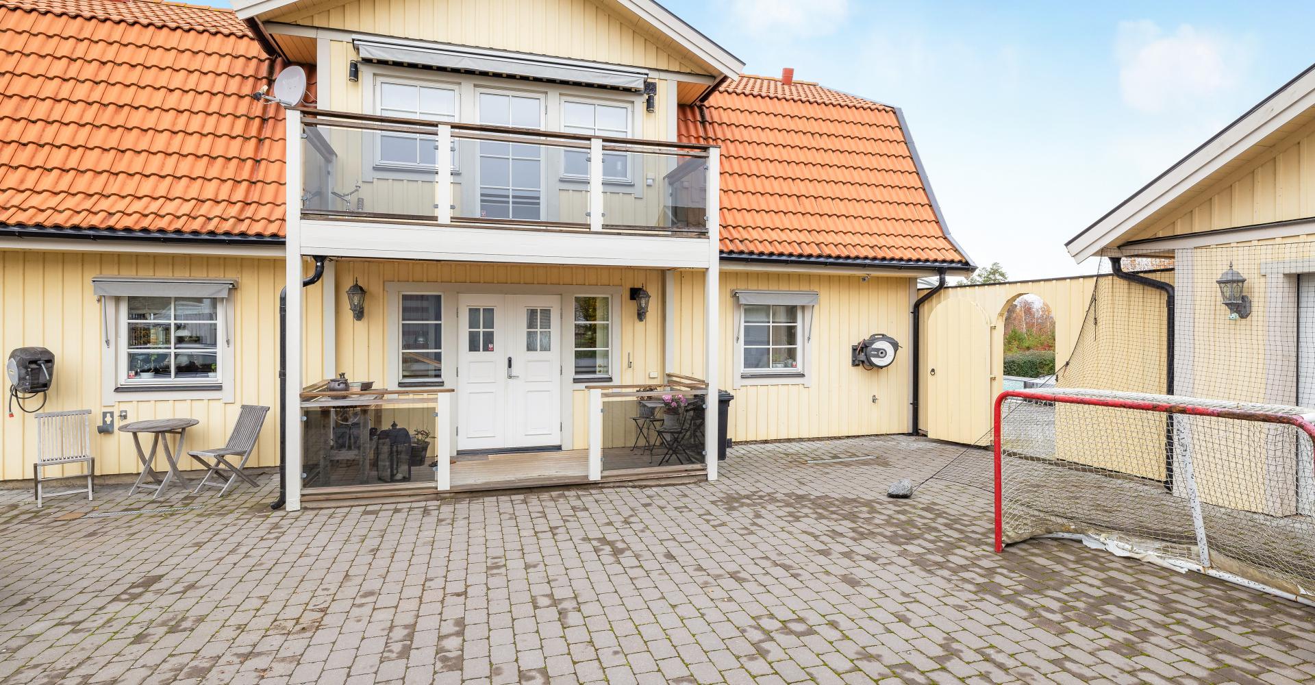 På husets framsida finns en stor stenlagd uppfart med plats för många bilar. Bra bärighet i stenläggningen som skall klarar vikten av en lastbil. En fint putsad mur skärmar av