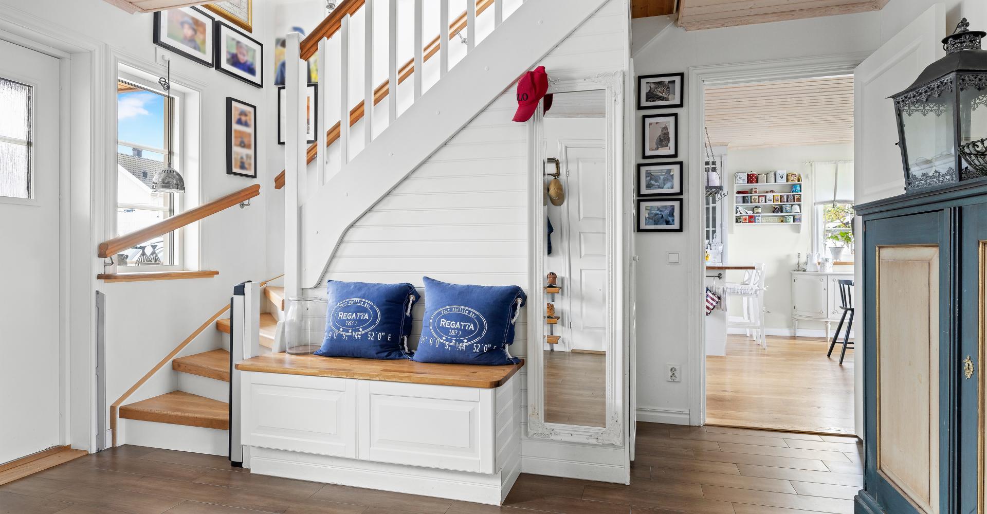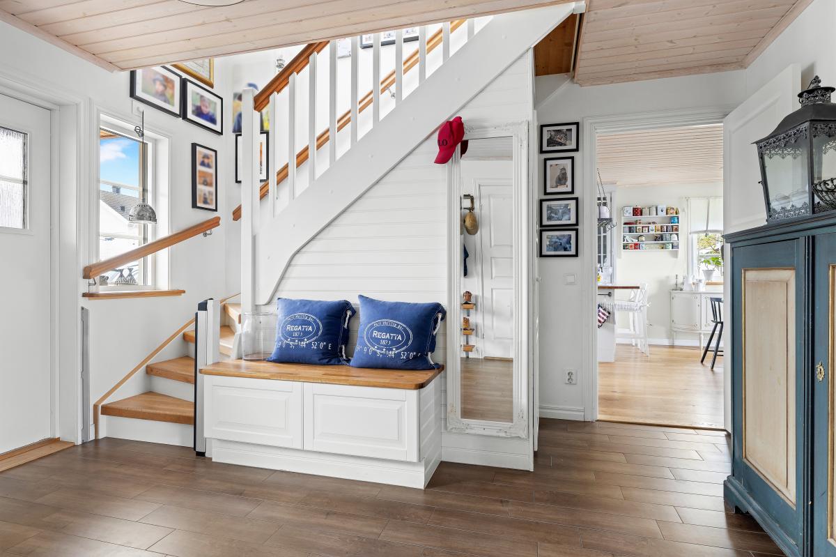 Rymlig möblerbar hall med stilrent och slitstarkt stengolv. Platsbyggd förvaring under trappen samt platsbyggd sittbänk med förvaringslådor.