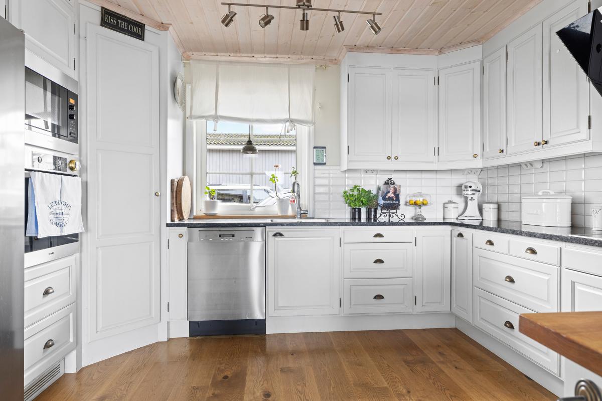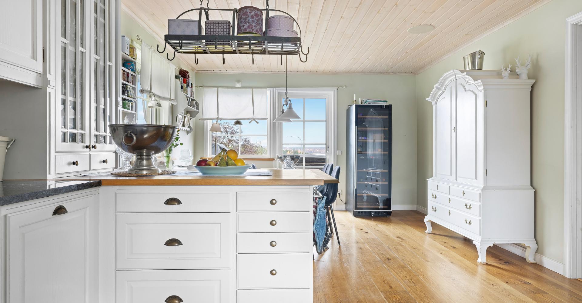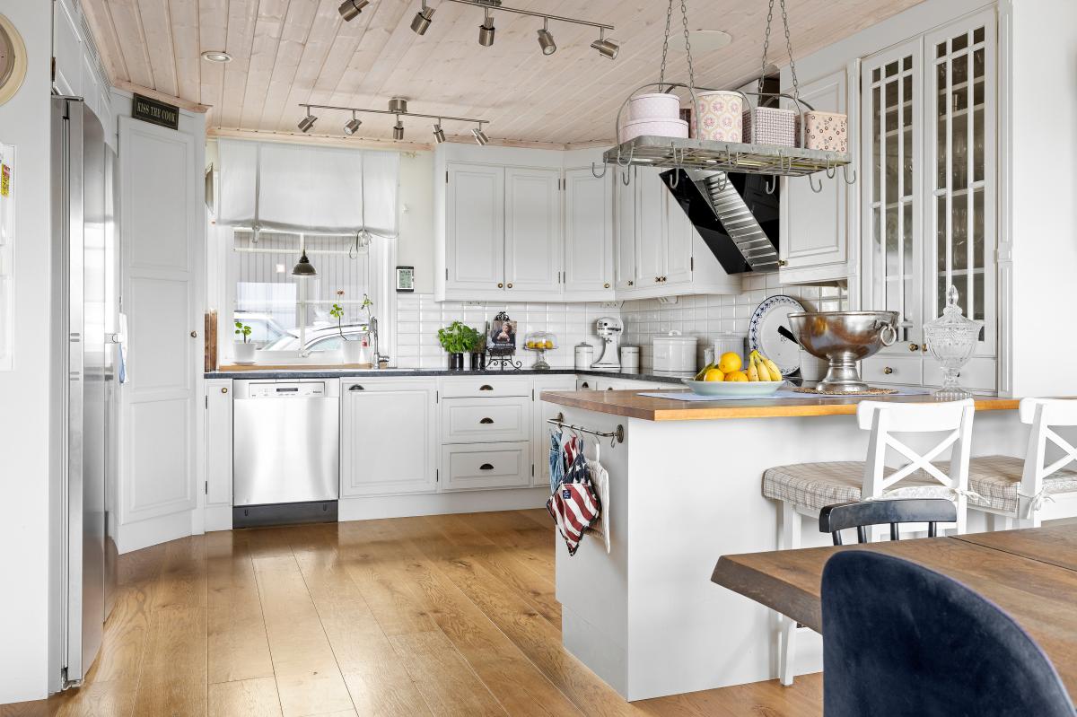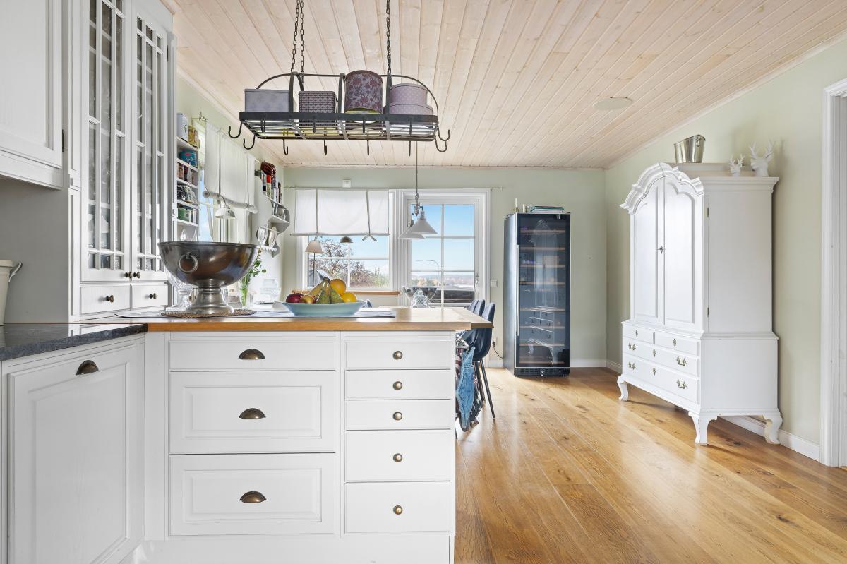 Exklusivt och påkostat lantkök från Alsikekök med stort hörnskafferi för matförvaring. Bänkskiva i granitsten och köks-ö med ekskiva med utskjut för frukosthäng/sittplatser. Vitt stänkskydd/kakel ovan bänk. Maskinell utrustning: Diskmaskin, spisfläkt, induktionshäll, hel kyl och frys samt ugn och mikro i bekväm arbetshöjd. Samtliga vitvaror från Miele. Köket är mycket väl tilltaget med rejäla arbetsytor. Den öppna storköksmiljön erbjuder plats för ett större matbord där 8-10 sittande får plats. Direkt utgång till altanen som erbjuder en härlig sjökontakt och magiska solnedgångar sommartid. Målade väggar och exklusivt enstavigt ekgolv från Rappgo mörkaskog. Här finns även takinfällda högtalare anslutna till Sonos ljudsystem.