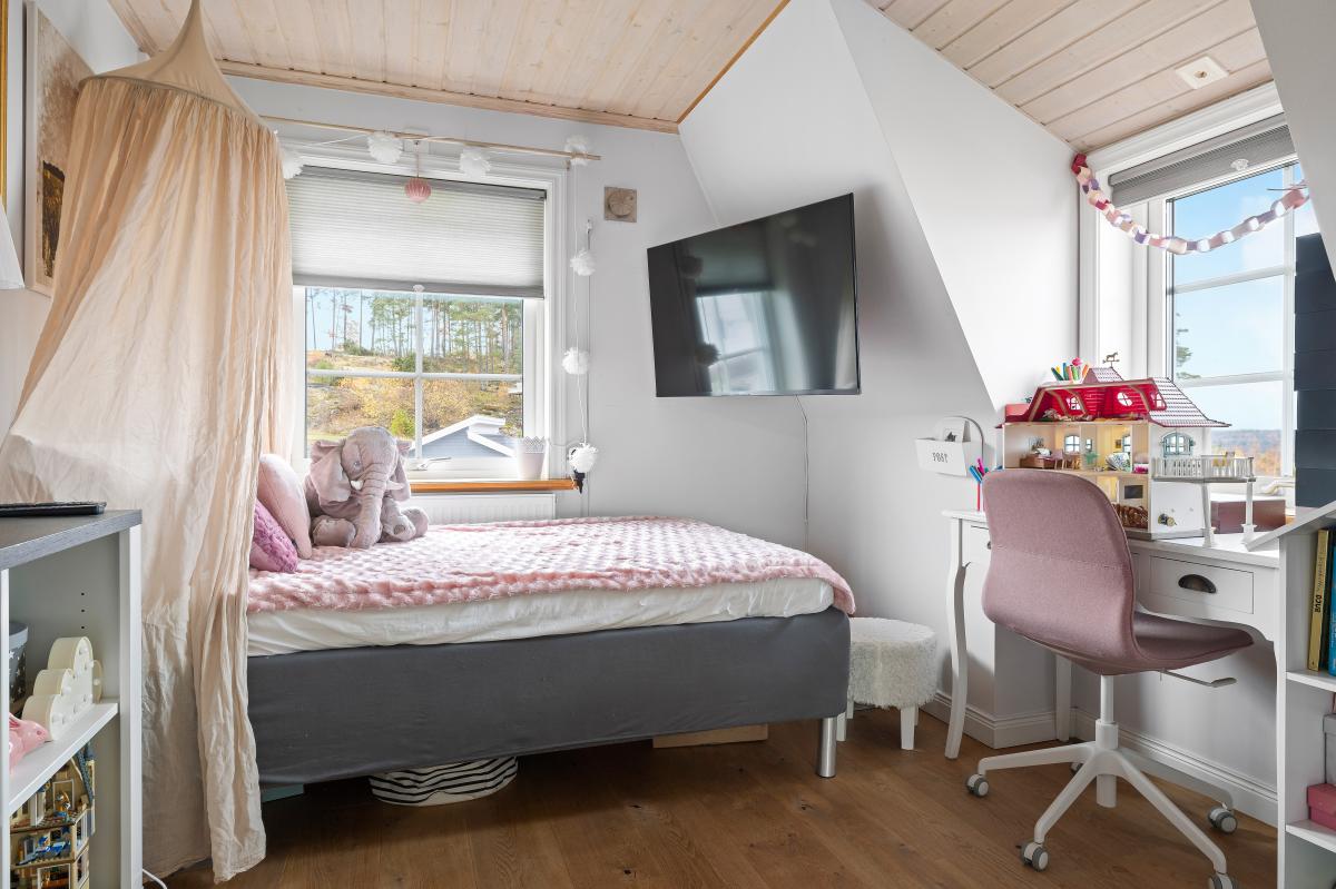 Rymligt sovrum med plats för både säng, skrivbord och förvaring . Enstavigt trägolv även här.