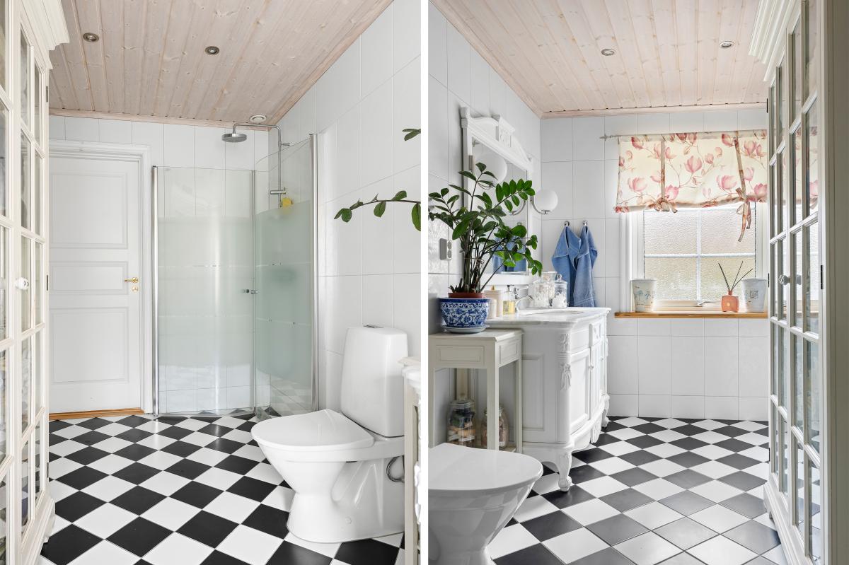 Fint ljust helkaklat badrum med golvvärme. Här finns förutom wc både badkar och dusch. Dubbla handfat i kommod med marmorskiva.