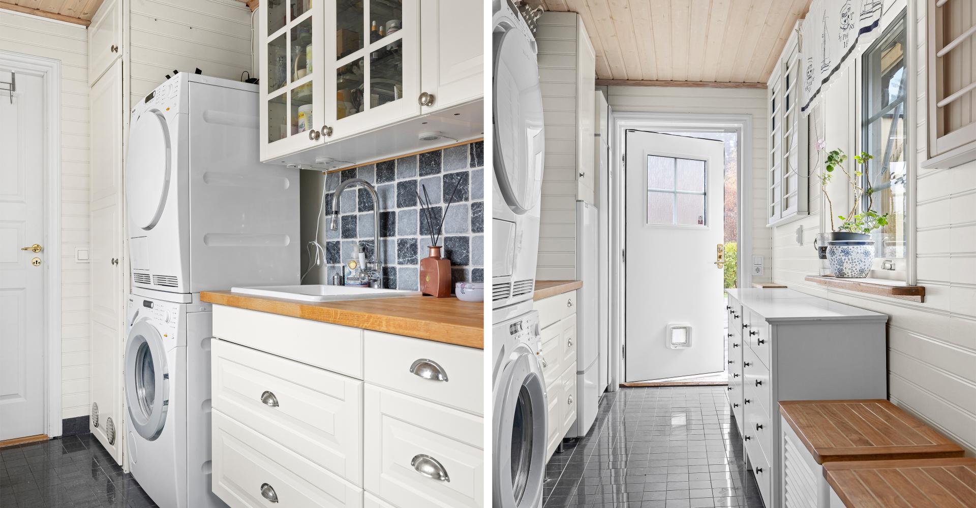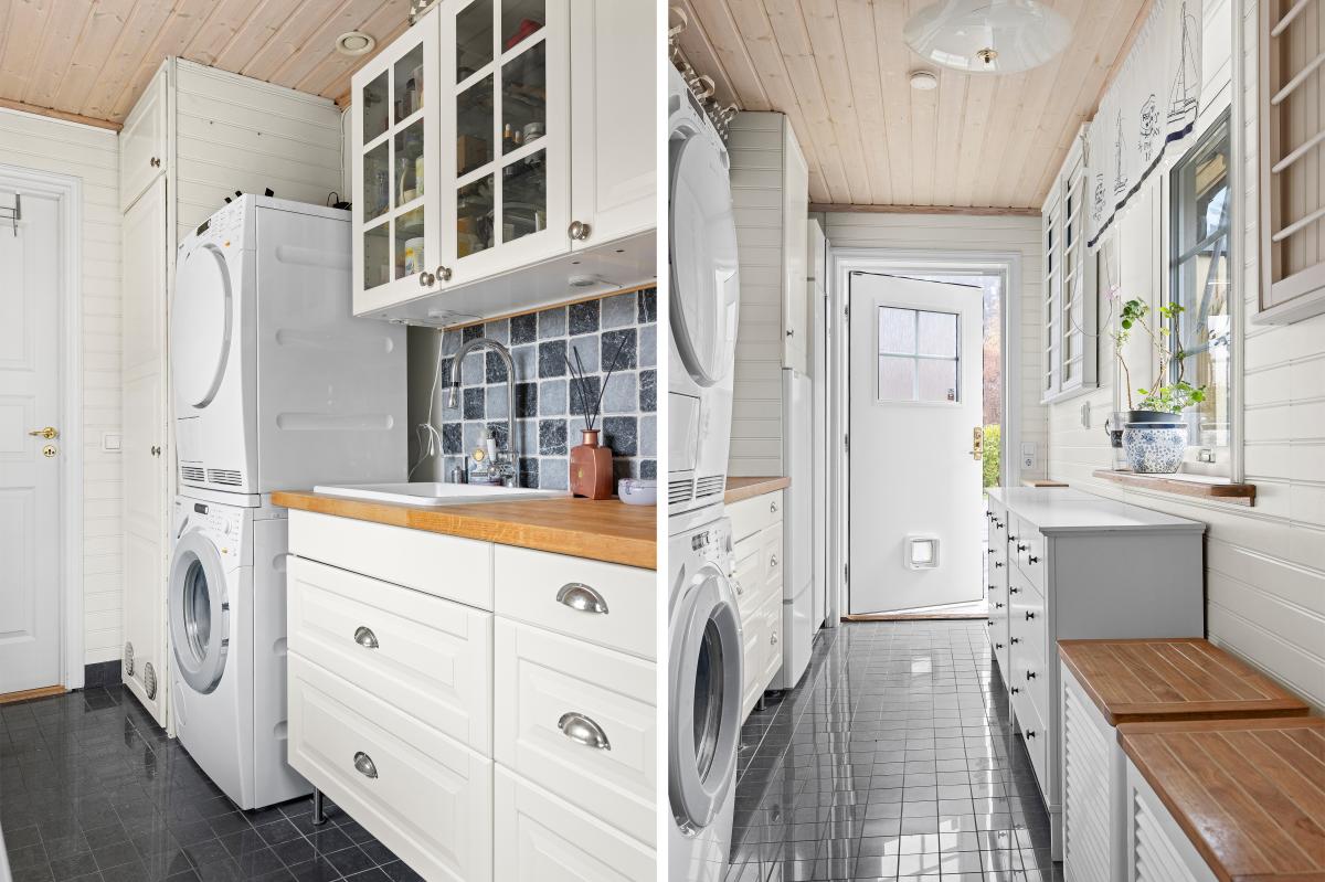 Praktisk tvättstuga och teknikrum med granitgolv. Groventré. Tvättmaskin, torktumlare, Frånluftvärmepump, platsbyggd skåpsförvaring med bla städskåp och el-central.