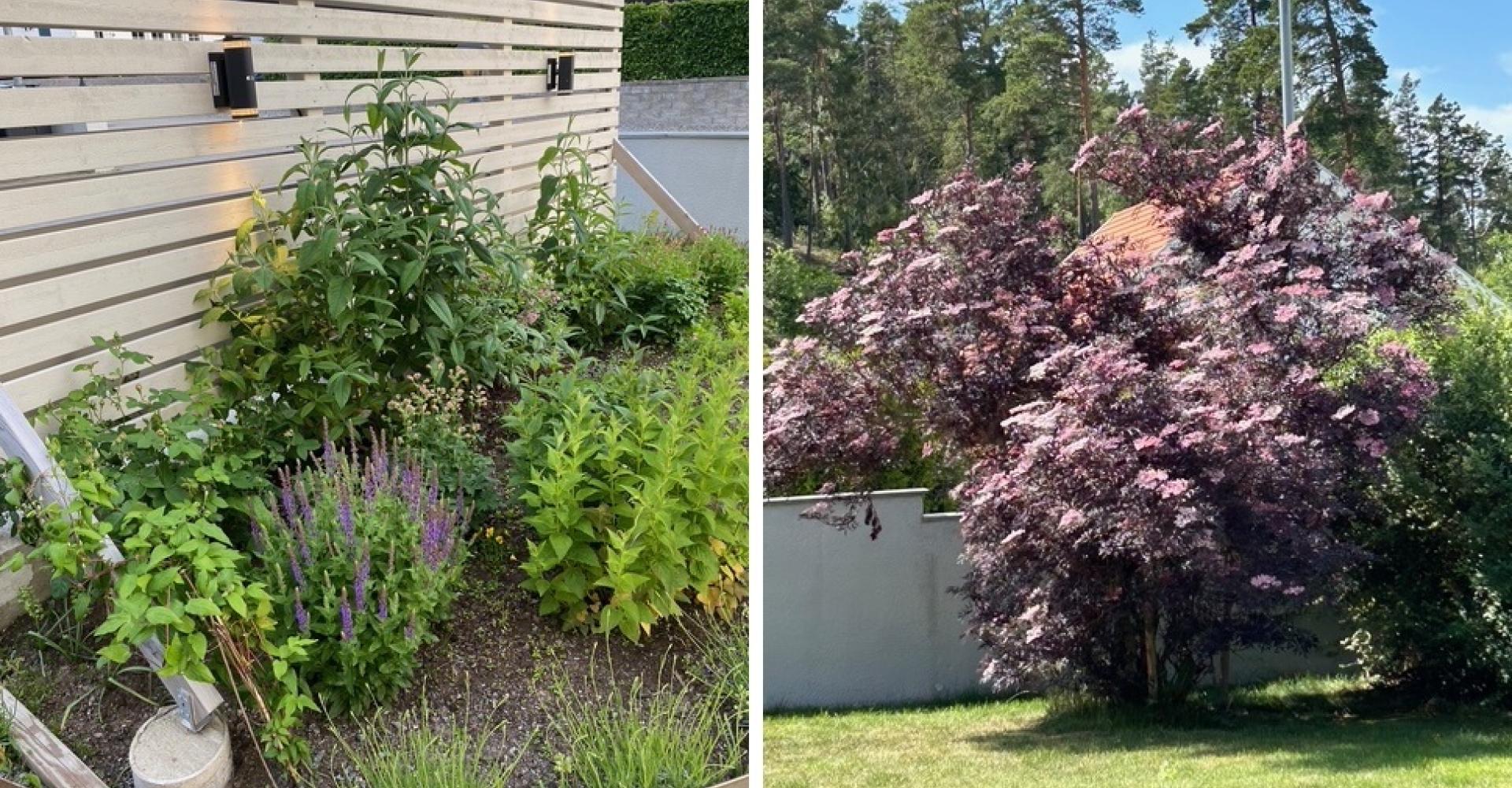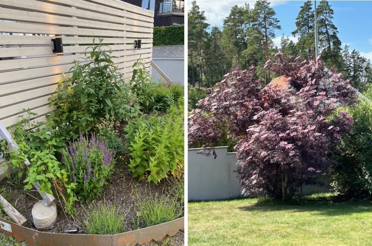 tomten mot gatan och även in mot garaget. En vintergrön ligusterhäck avskärmar mot grannen nedanför.