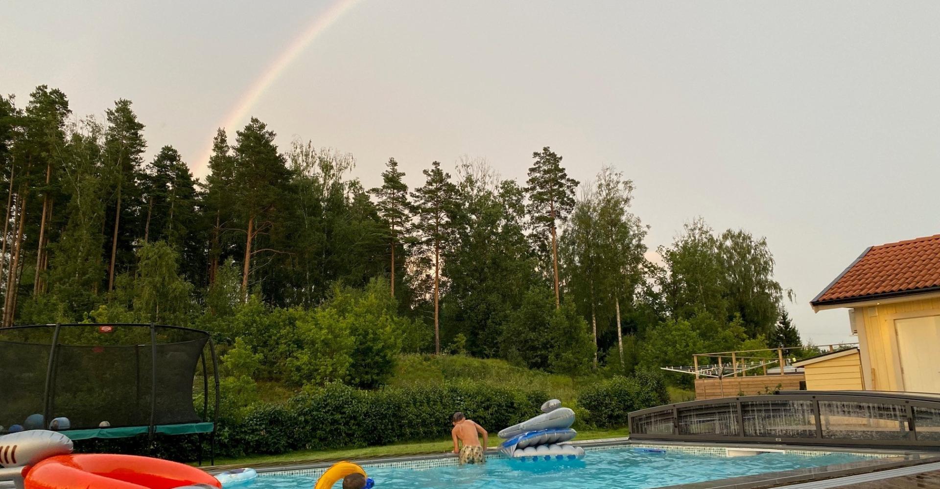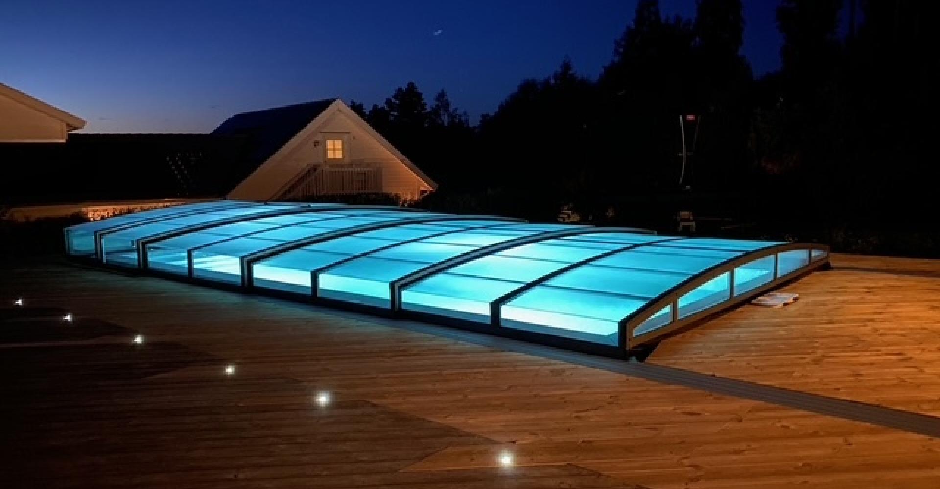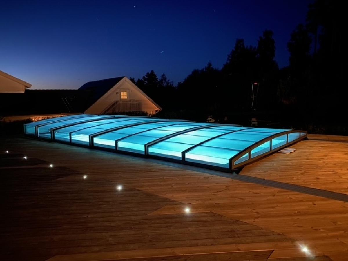 Termocellgjuten saltvattenpool om 4x8 meter med modernt pooltak. Separat spabad/bubbepool finns även.
