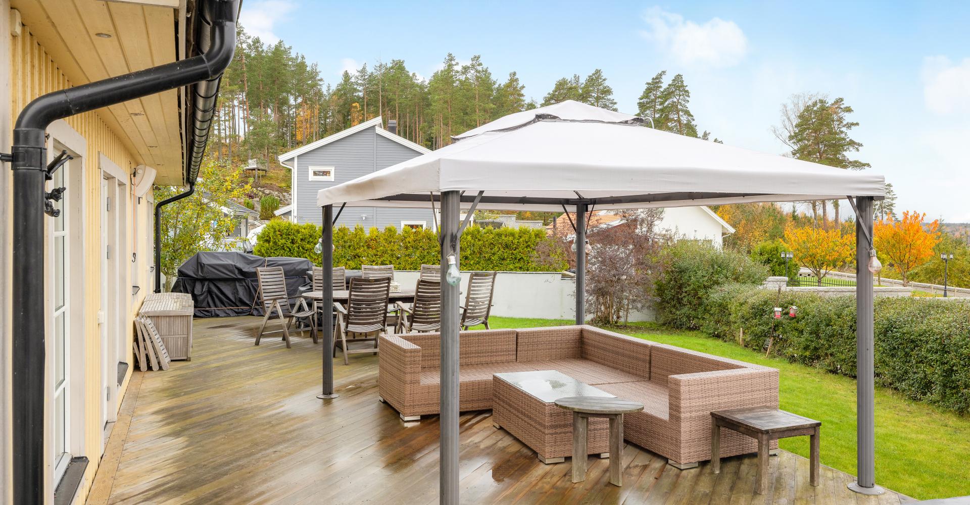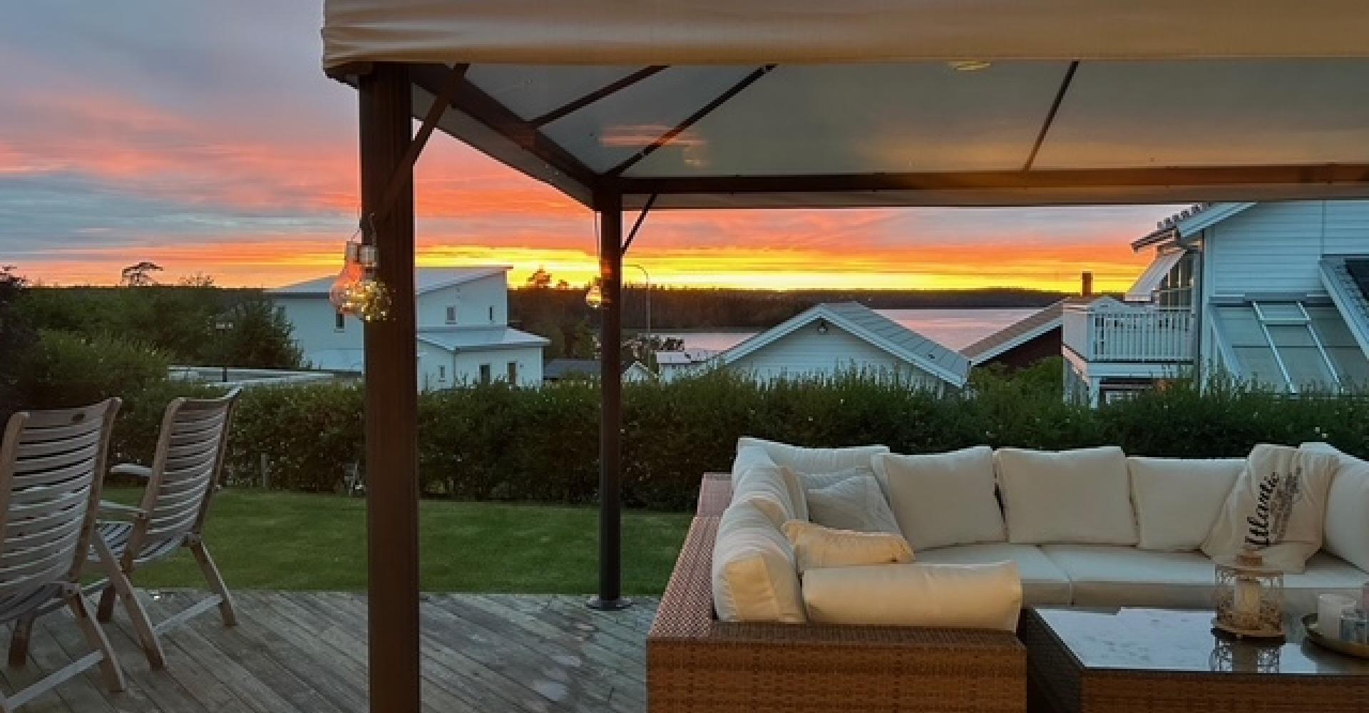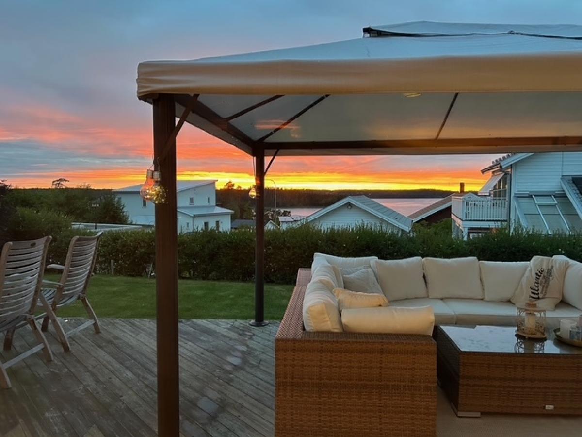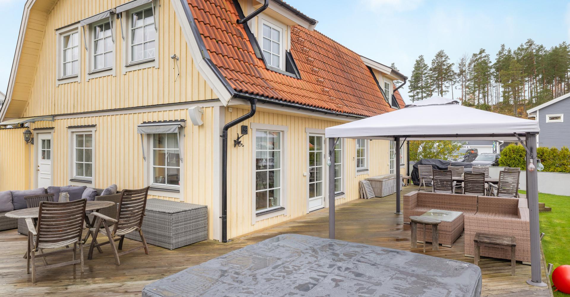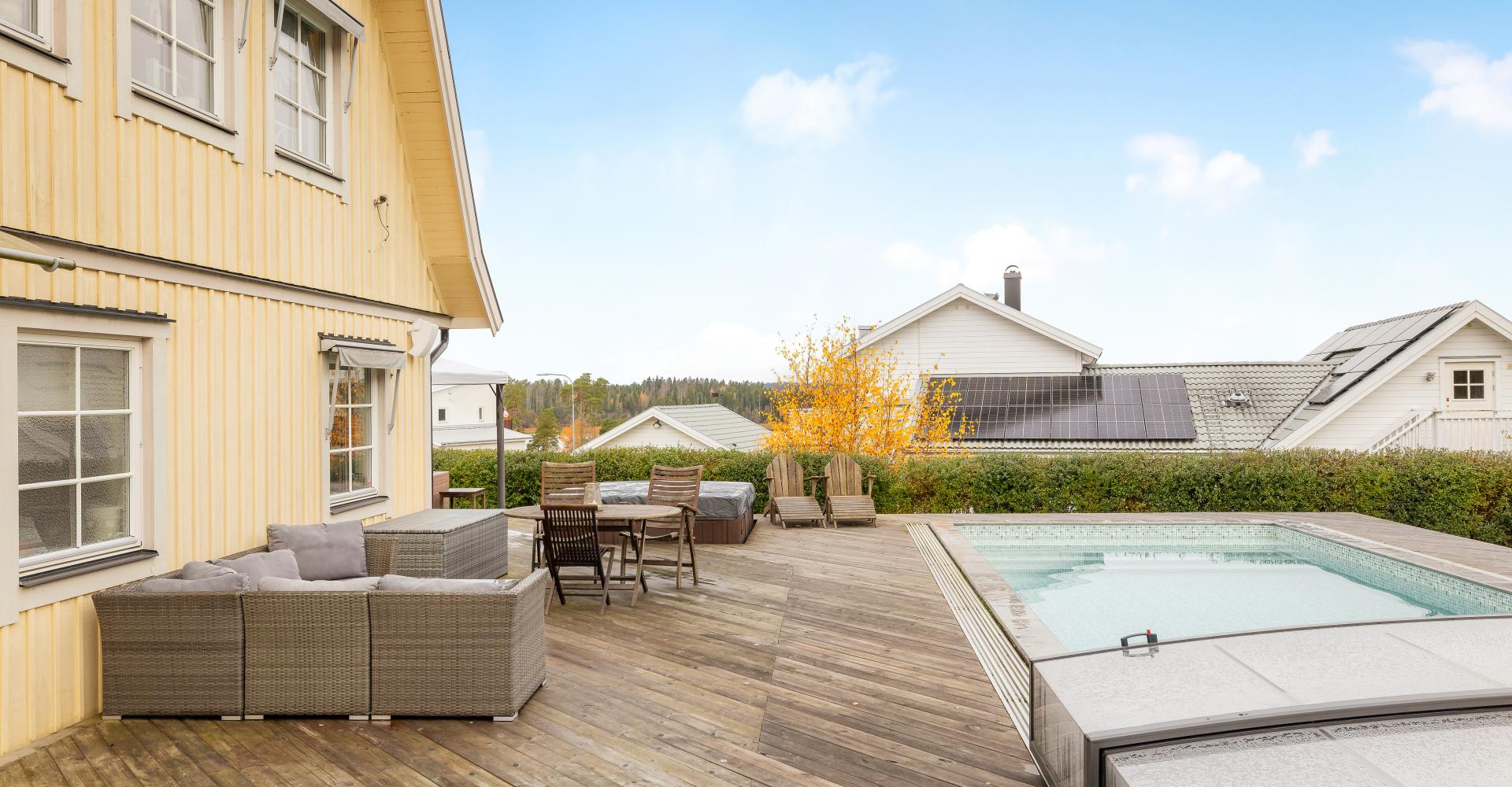 Helglasad spröjsad altandörr som tar dig ut till den stora altanen med Mälarutsikt där plats finns både för sittgrupper, utekök och annan möblering. Altanen löper sedan vidare bort mot trädgården med gräsyta för lek och bus samt poolområdet med både bubbelpool och riktig gjuten pool uppvärmd med värmepump och skyddande skjutbart pooltak.