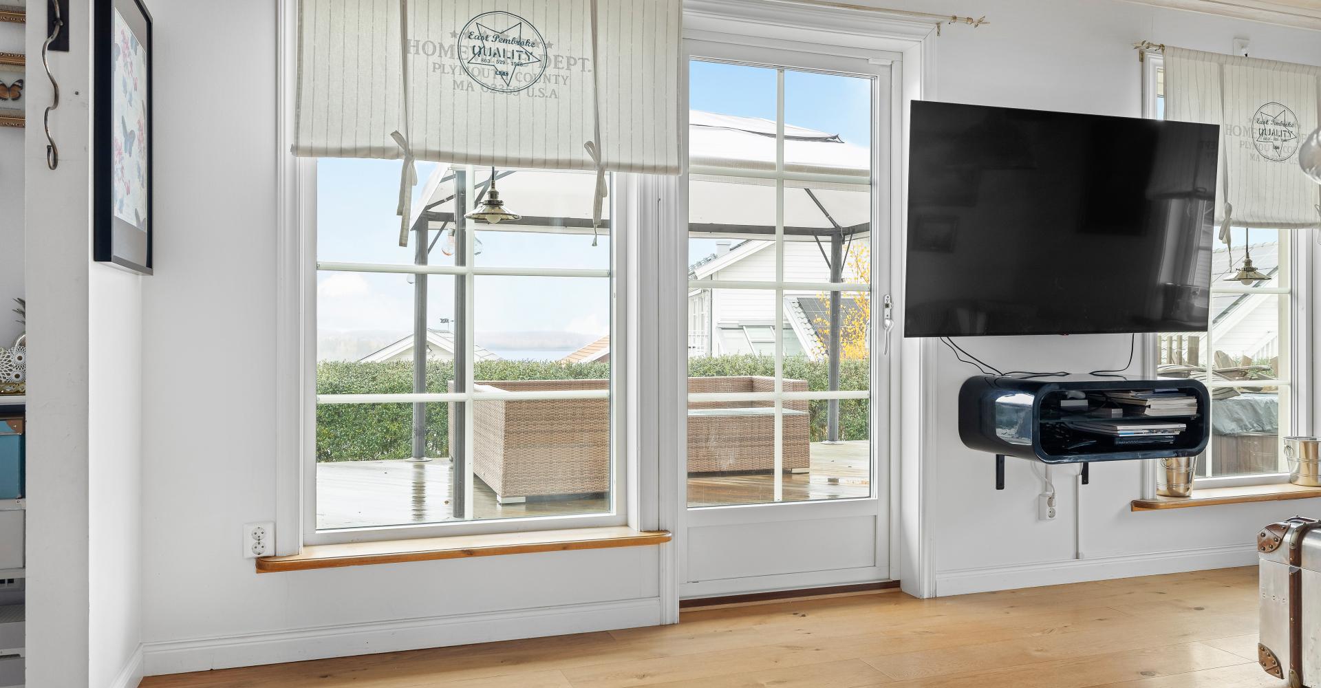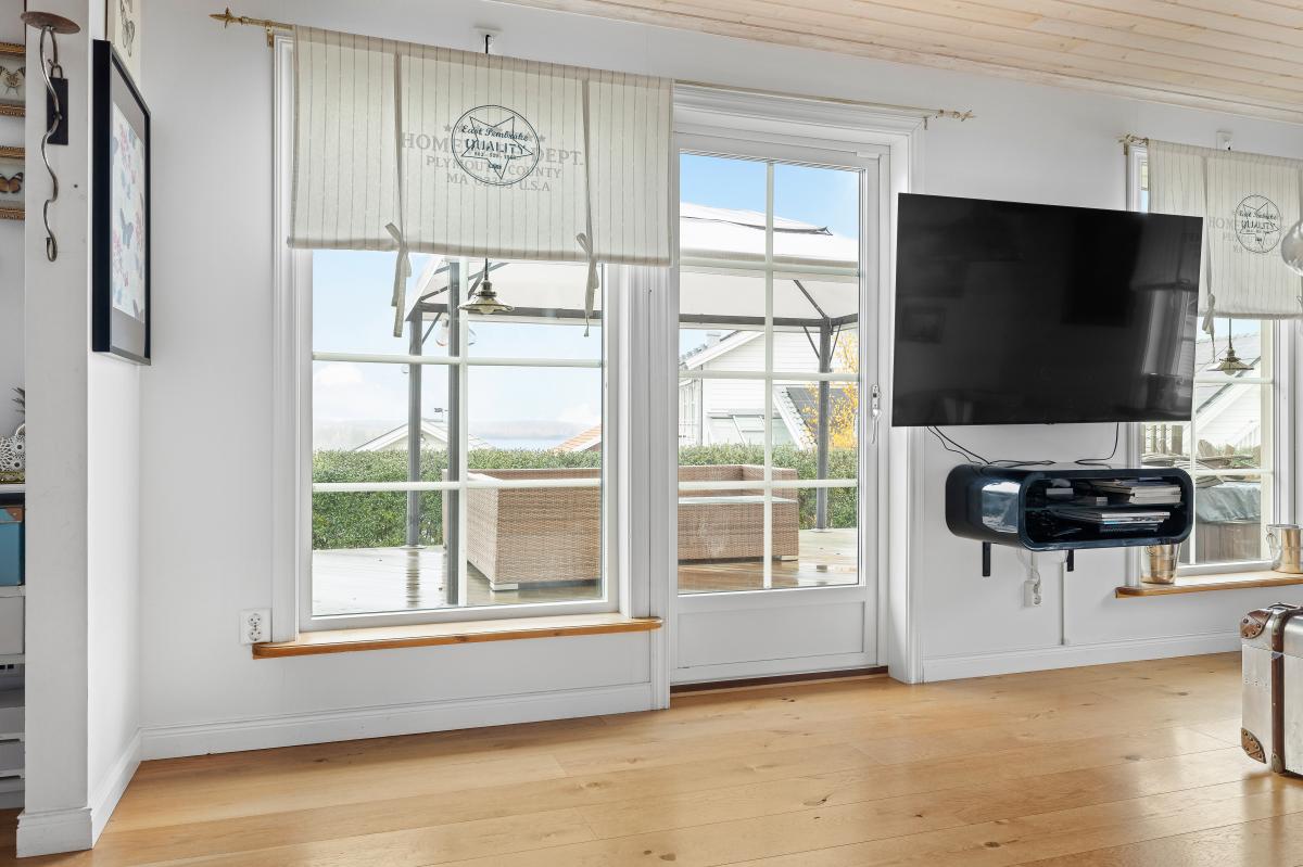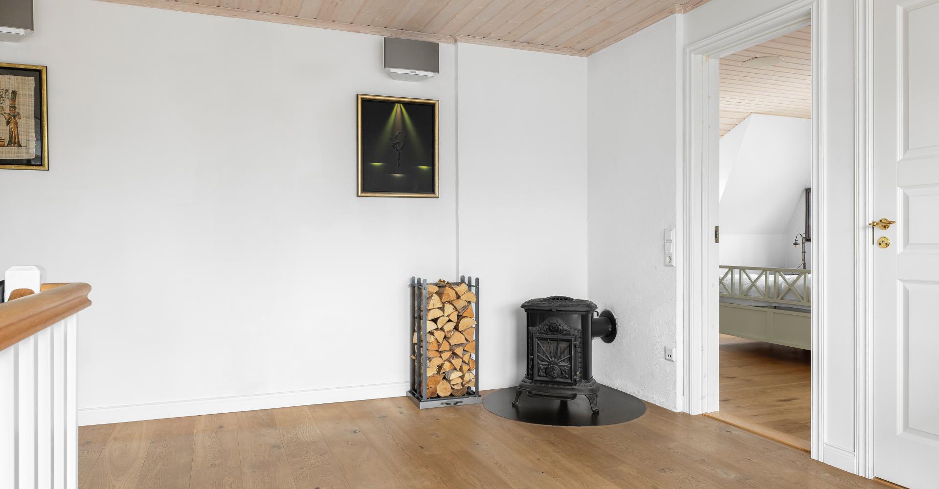 Härligt allrum med stora fönsterpartier och helglasad dörr ut mot balkongen med glasat räcke för bästa ljusinsläpp. Enstavigt trägolv. Fin gjutjärnskamin som kan tändas upp om det skulle bli alltför kyligt om vintrarna. Här finns även väggmonterade högtalare anslutna till Sonos ljudsystem.