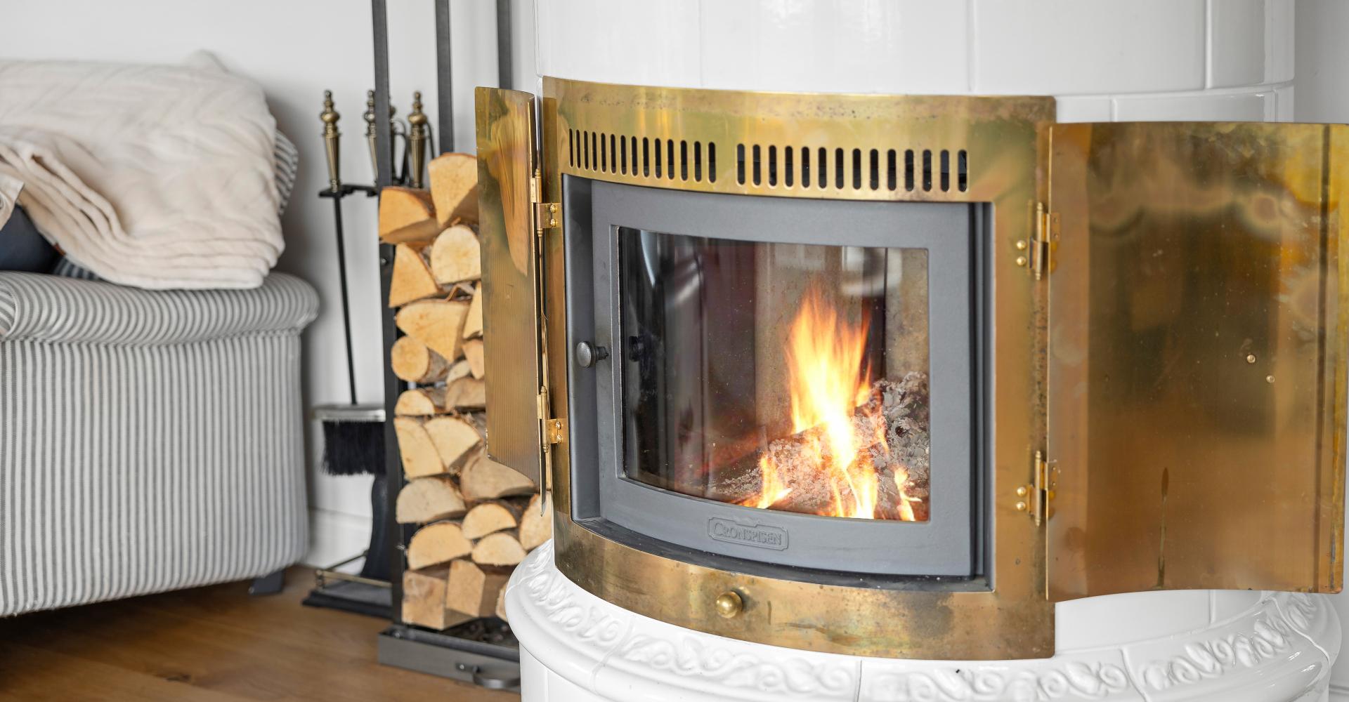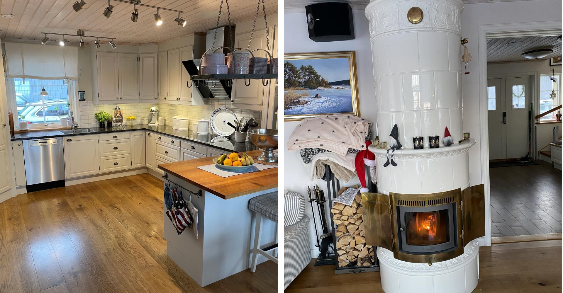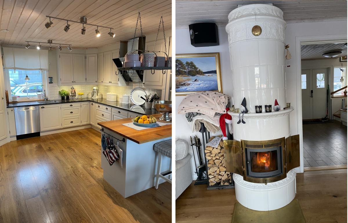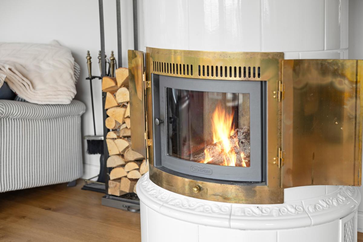 - Frånluftsvärmepump till golvvärme plus radiatorer på övre plan samt en kamin och en gedigen kakelugn till murad skorsten.