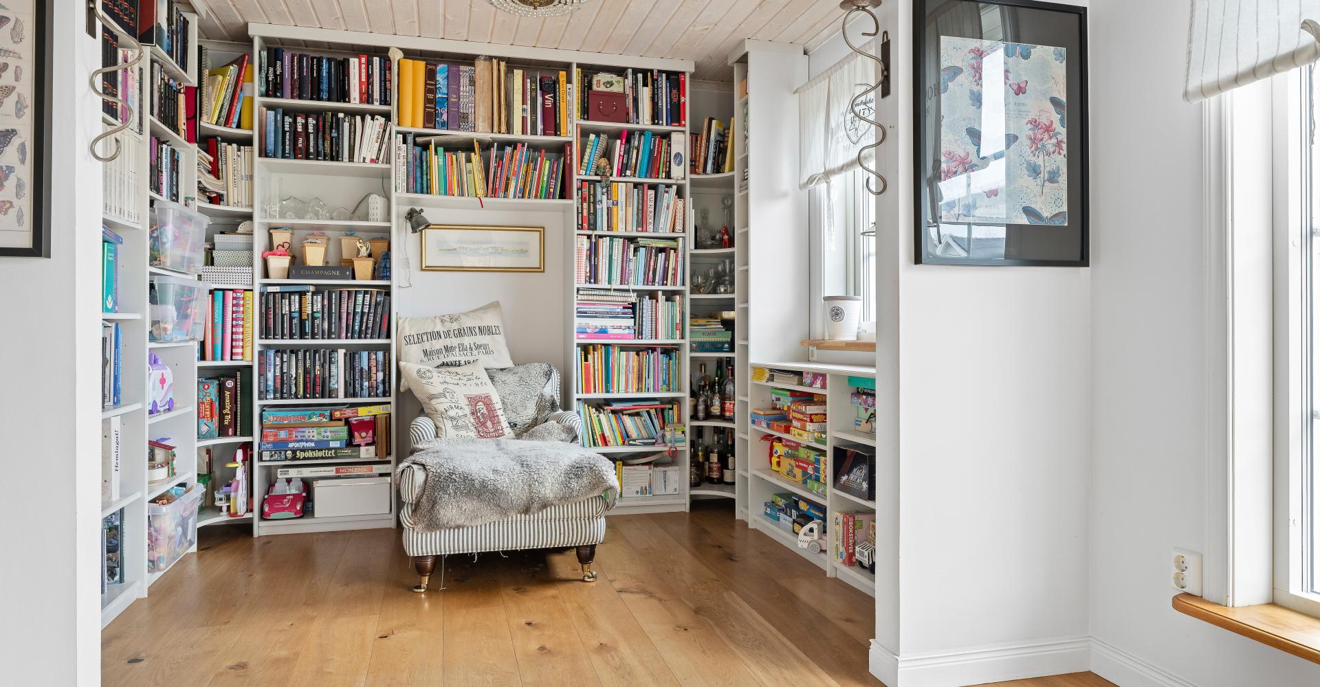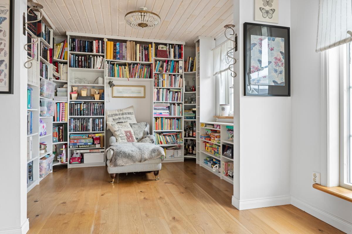 Härligt vardagsrum idag fördelat med en umgängesdel för TV-häng samt en mysig biblioteksdel för avkoppling. Rummet kan enkelt omvandlas till ytterligare ett sov- eller arbetsrum om det behovet finns. Högkvalitativt enstavigt trägolv även här samt gedigen kakelugn med vacker utsmyckning och insats med glasdörr som erbjuder en hög mysfaktor samtidigt som den effektivt värmer hela huset höst och vintertid då den är kopplad till en murad centrerad skorsten som behåller värmen mycket länge i huset.