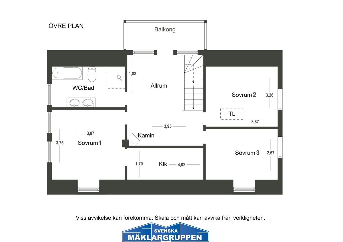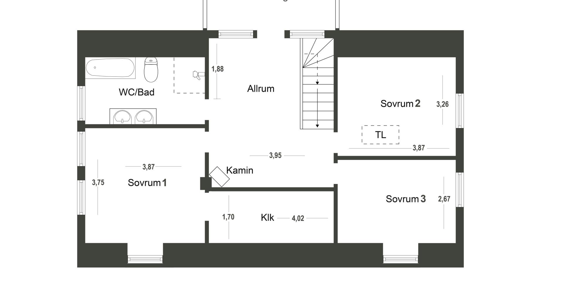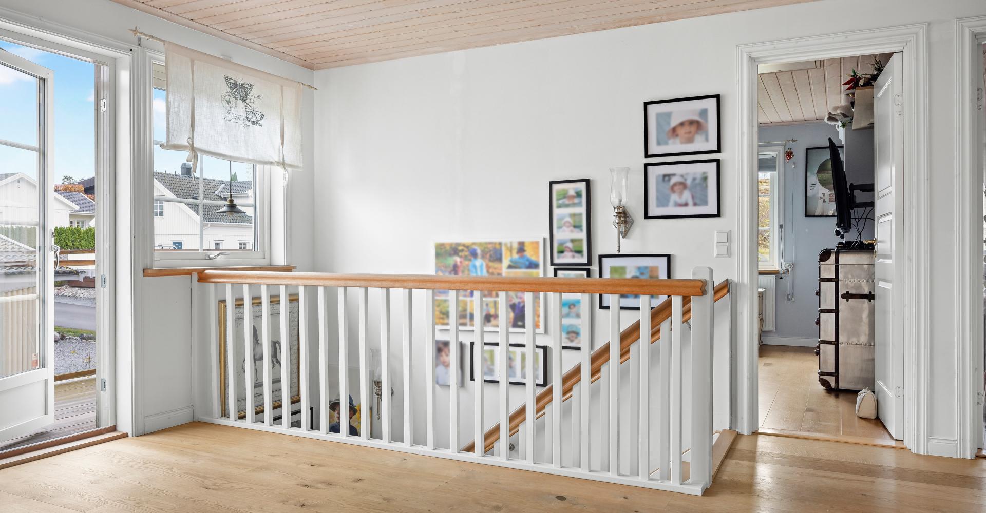På över plan finns 3 sovrum, en stor klädkammare, ett rejält badrum med både badkar och dusch samt även ett rejält allrum men en stilfull gjutjärnskamin i centrum av huset.