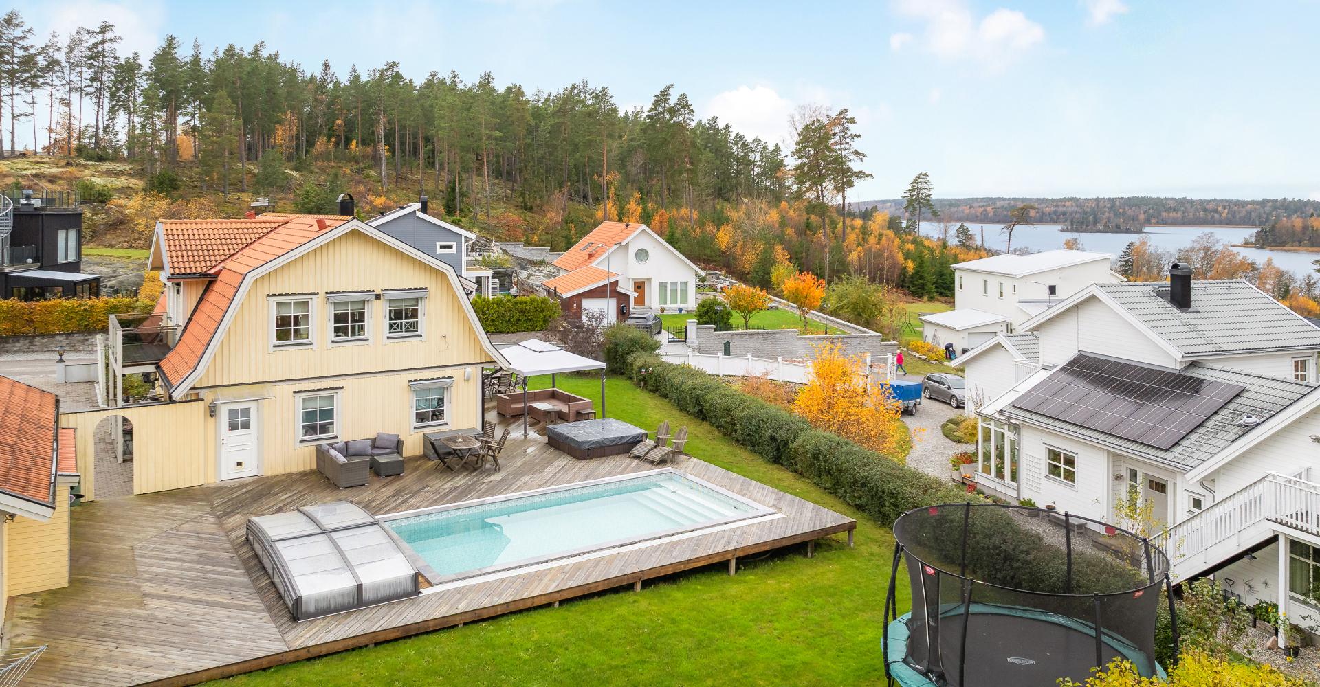 Välhållen och påkostad familjevilla med pool i härliga Granbystrand med högt läge och magisk utsikt ut över Mälaren