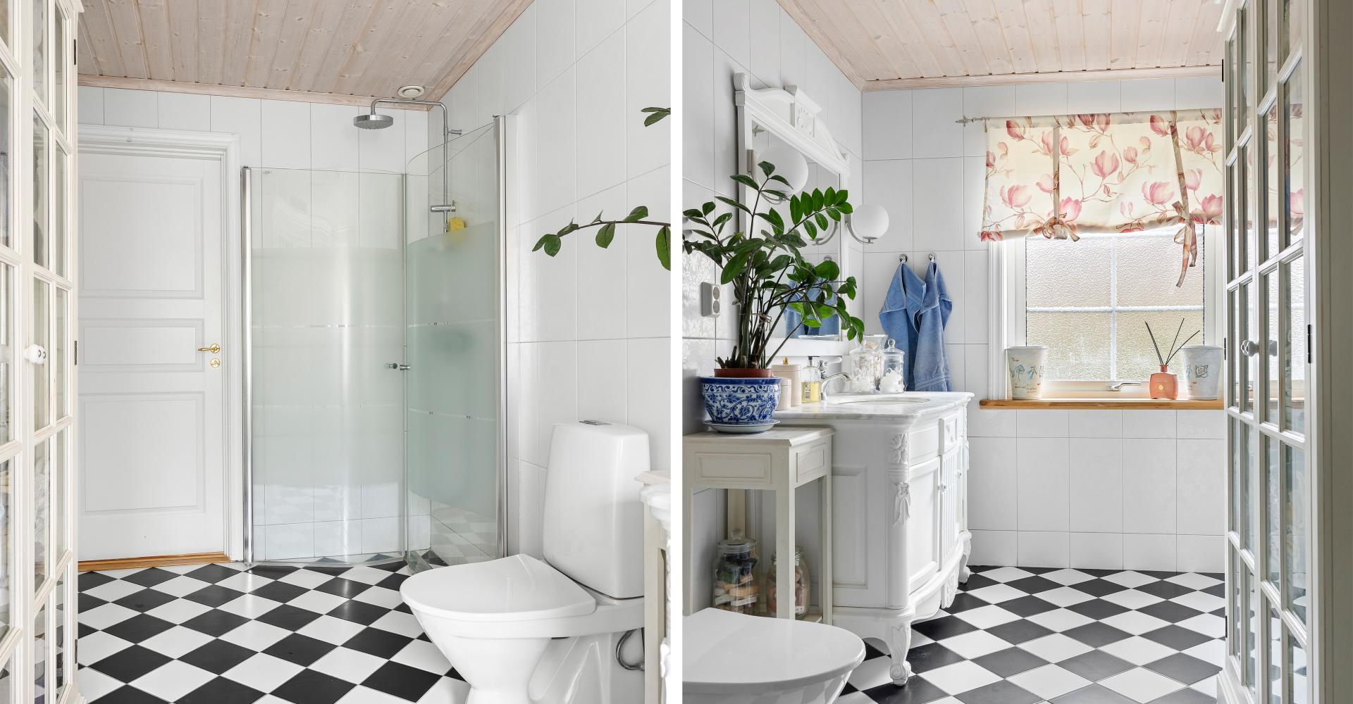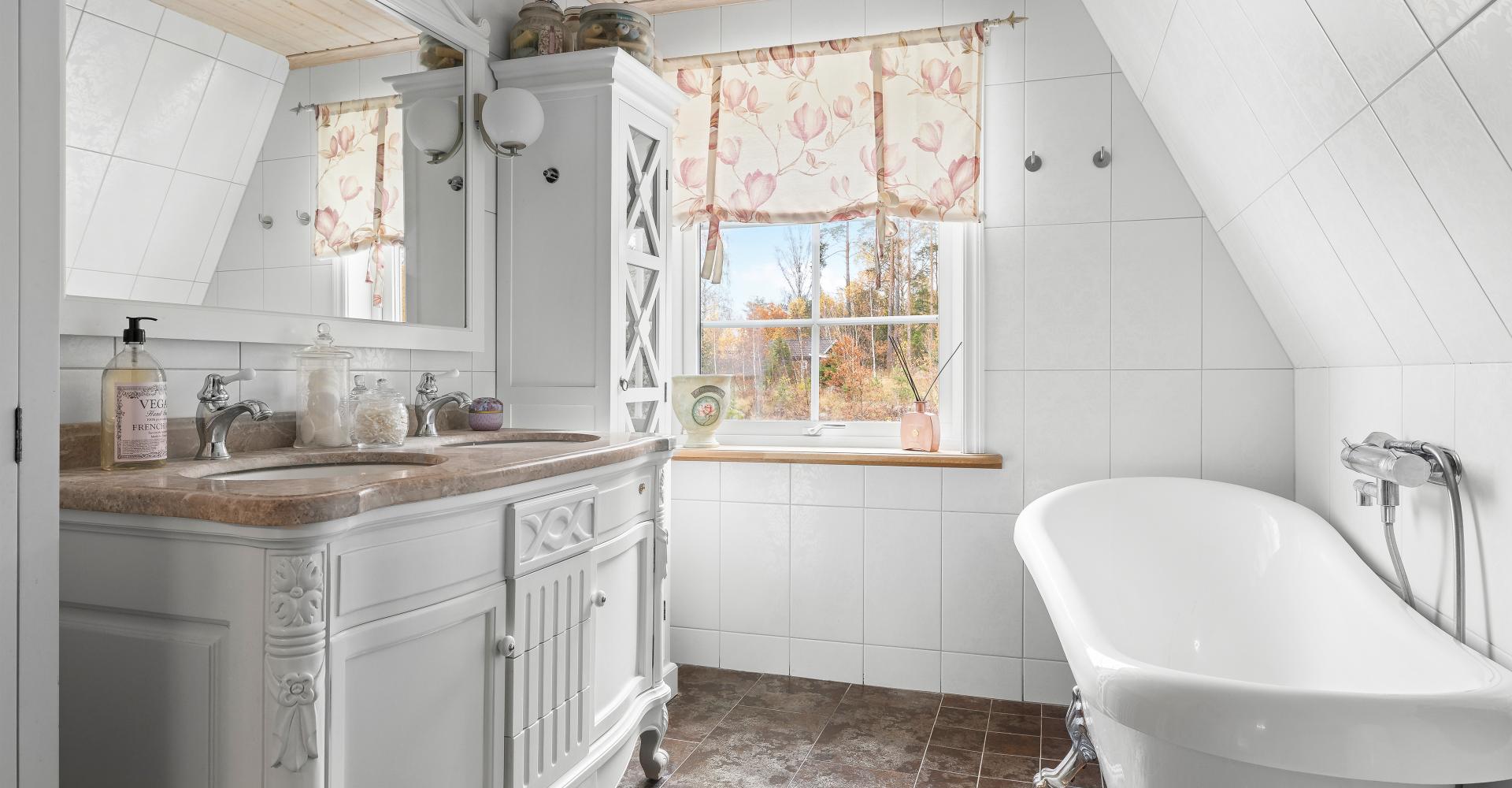stilfullt badrum i gammaldags stil med gediget dubbelhandfat
