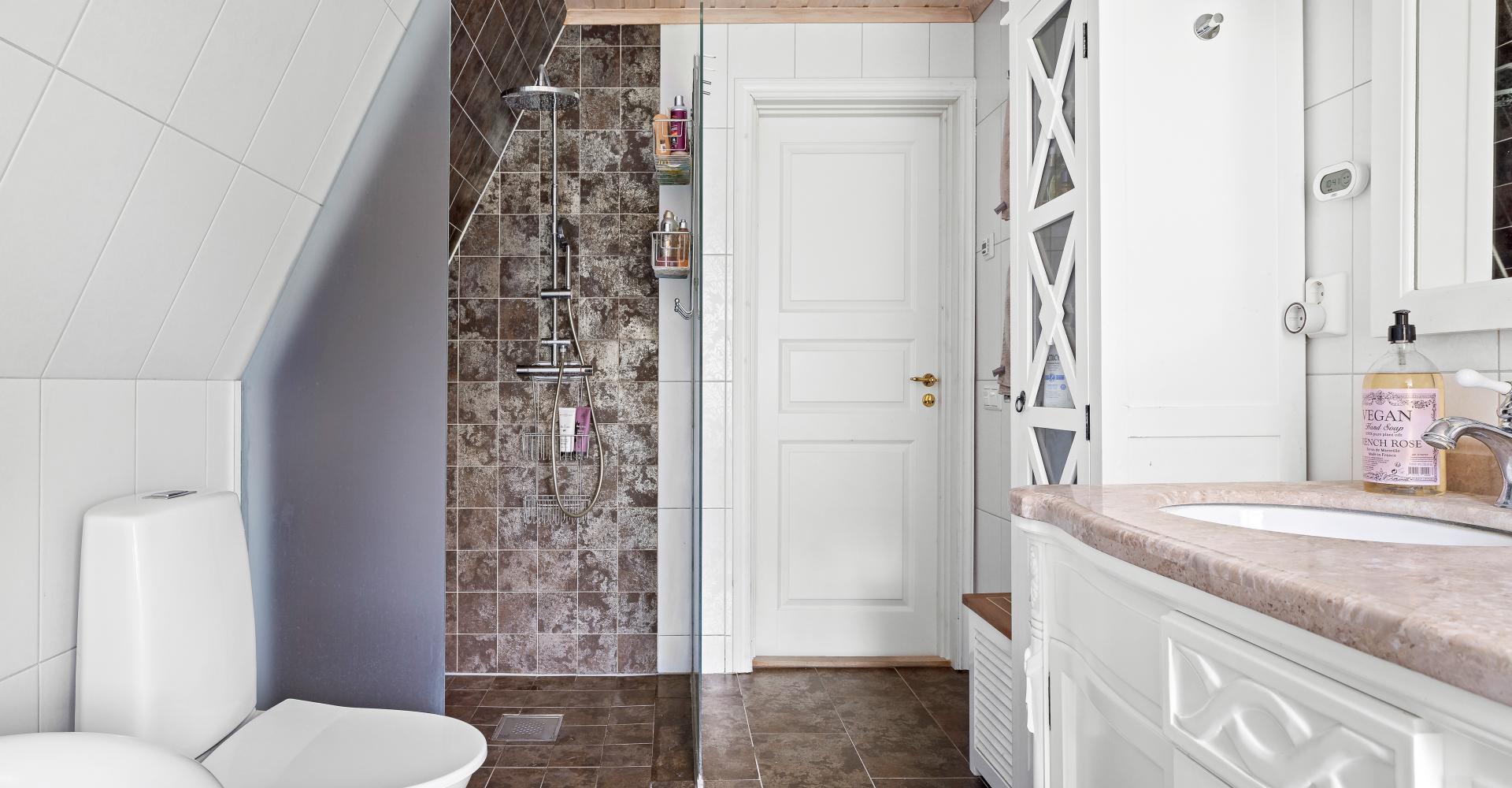 Stort helkaklat badrum med klassisk kommod i gammaldags stil med marmorbänk och nedsänkt handfat. Dusch och WC,