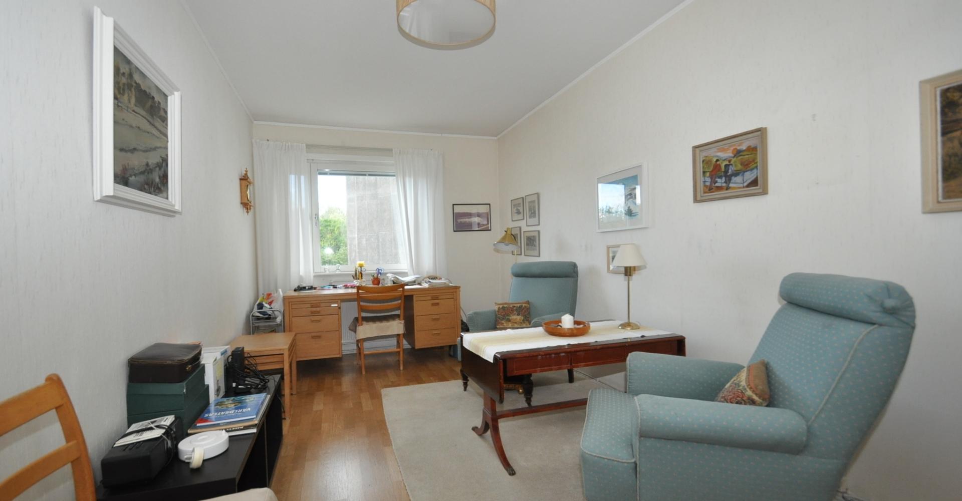 Vardagsrum: stort med ljusinsläpp från två håll, ljusa tapeter, parkettgolv, utgång till balkongen. Balkongen har markis samt infravärme.