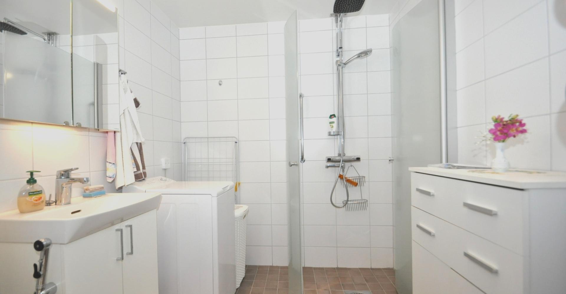 Badrum: handfat, badrumsskåp, dusch med vikväggar, tvättmaskin, kaklade väggar samt uppvärmt klinkergolv.